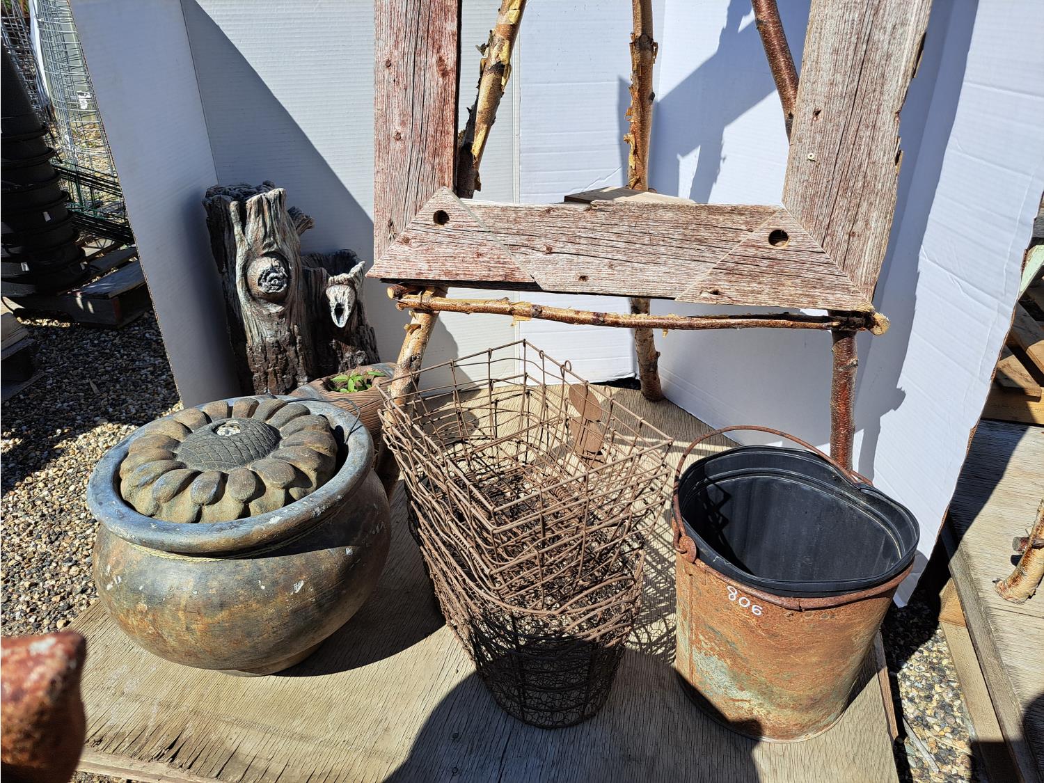 806 Barn Board Easel, Bubbler Water Fountain and Wine Basket