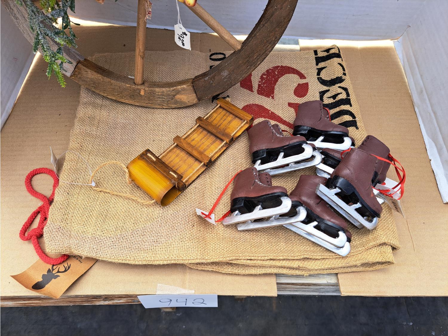 942 Christmas Wagon Wheel, Santa Sack and Skate Ornaments