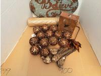 900 Copper Ornaments and Rustic Sign