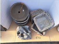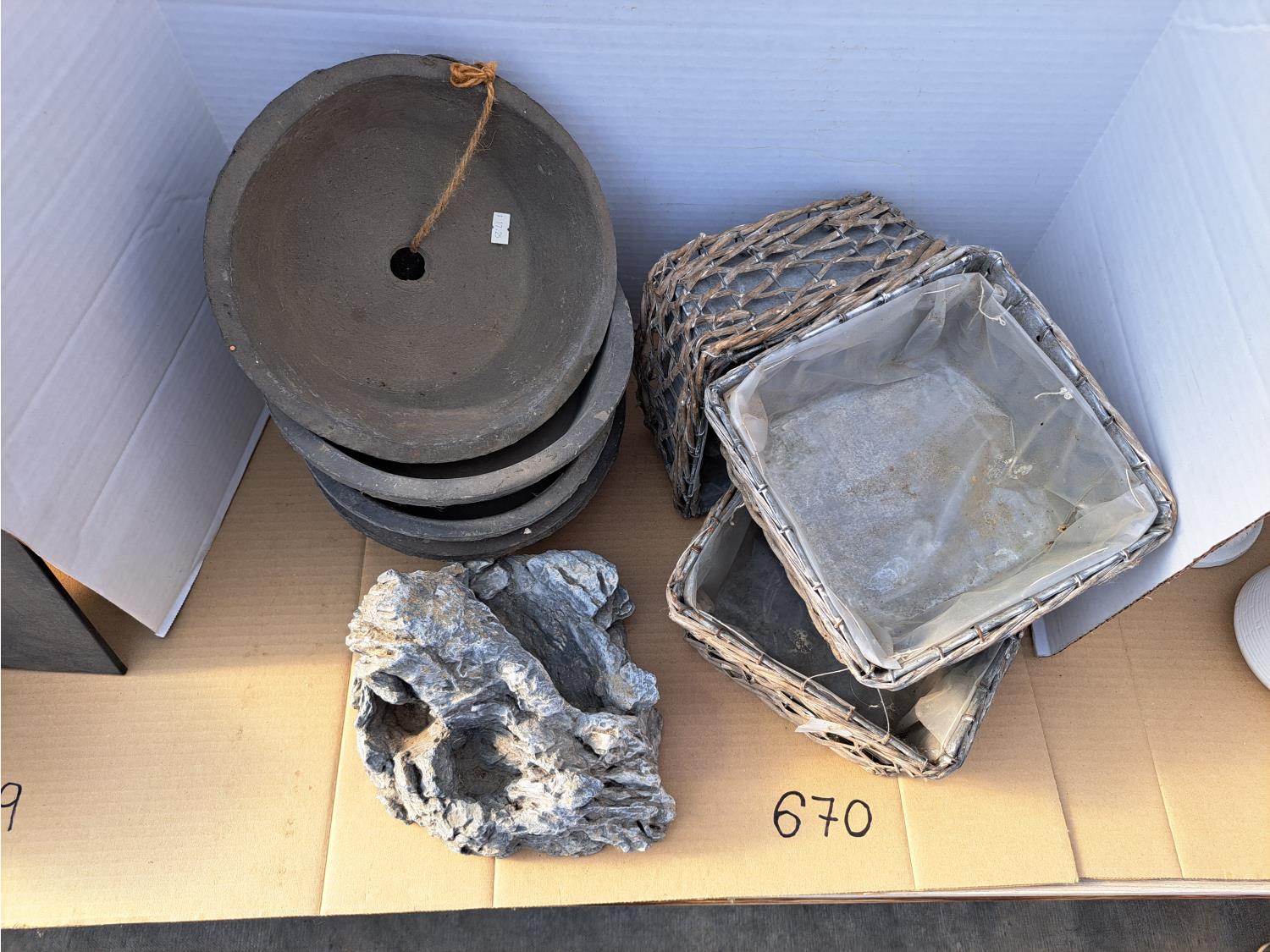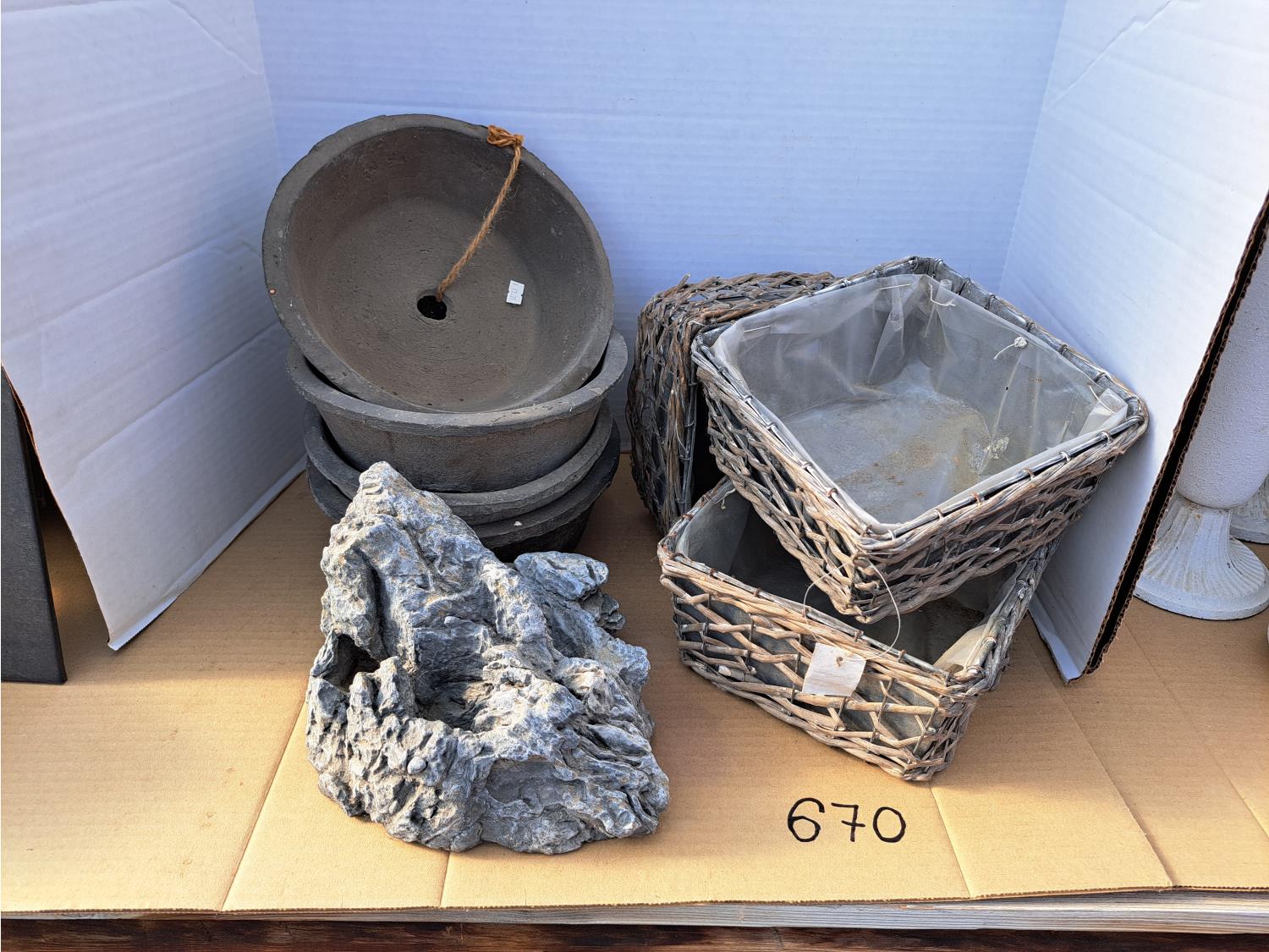 670 Square Wicker Planters and Cement Planter Bowls (Unused)