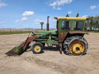 John Deere 46A loader, 6.6 L 6 cylinder diesel engine, 95 PTO HP, 8 speed power shift transmission, cab, 540/1000 PTO, 2 rear hydraulic outlets, rear wheel weights, 7.50-18 front tires, 18.4-34 rear tires