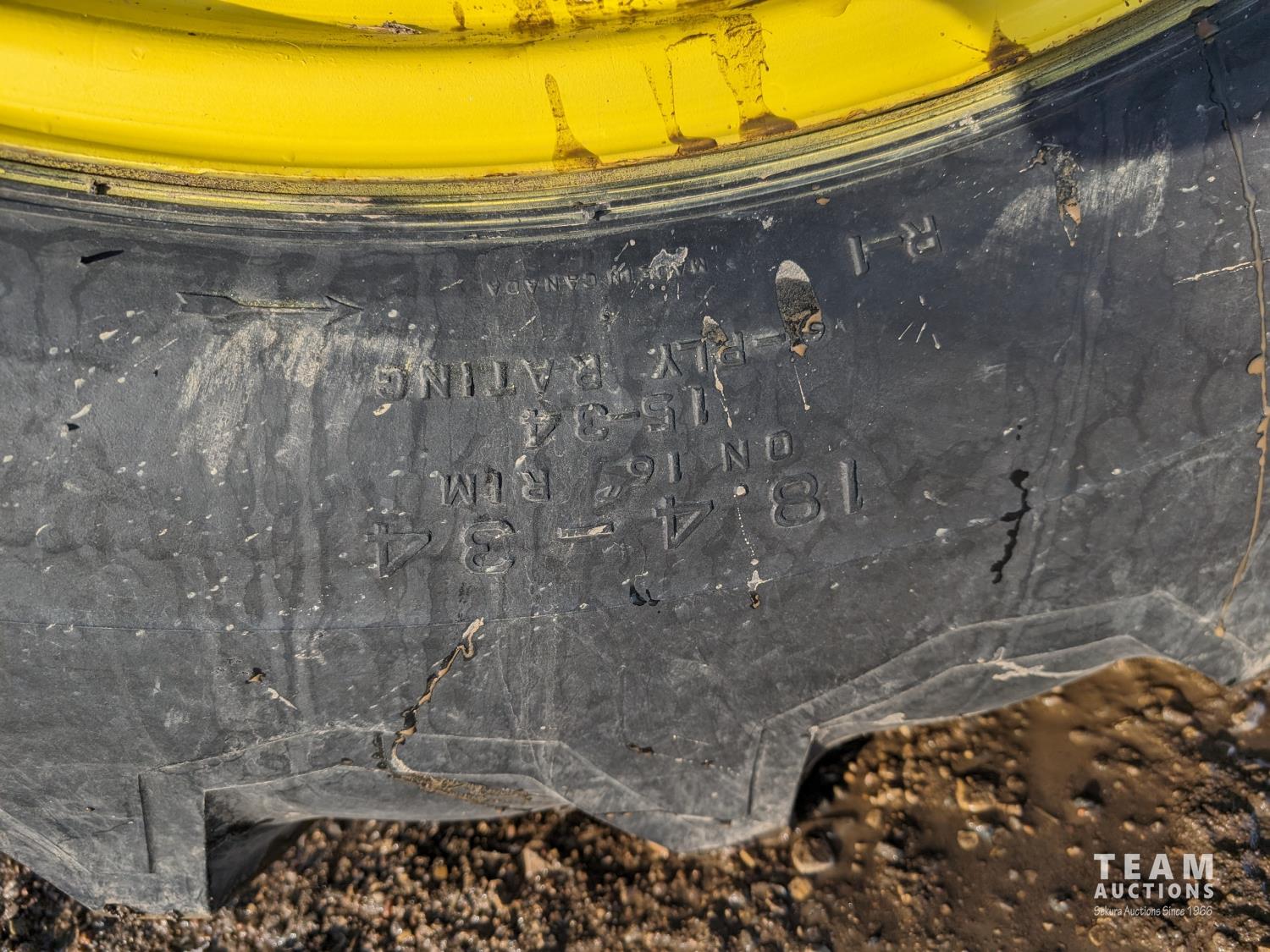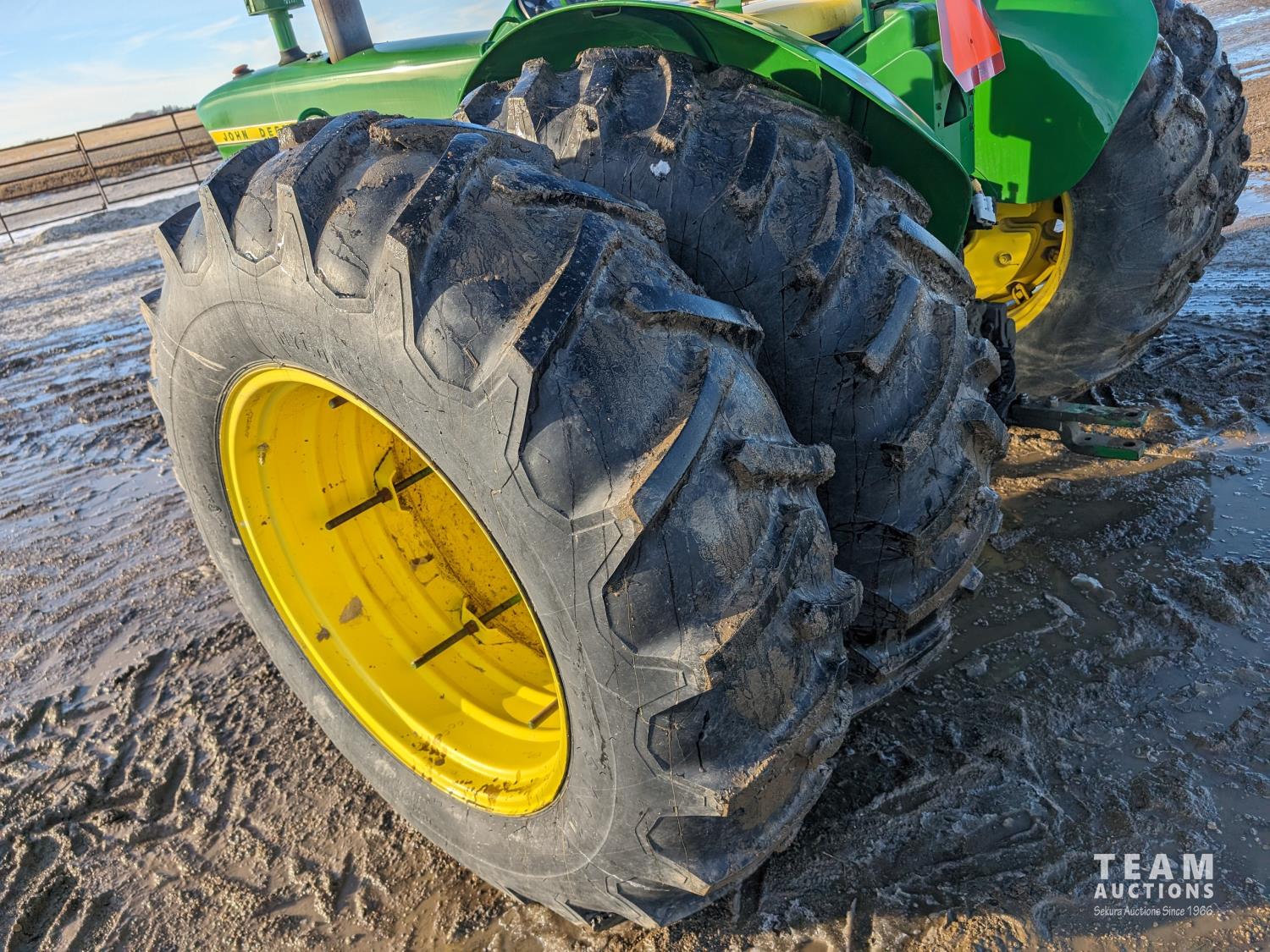 6.6 L 6 cylinder diesel engine, 95 PTO HP, 8 speed power shift transmission, 540/1000 PTO, 2 rear hydraulic outlets, 11.00-16 front tires, 18.4-34 dual rear tires, bolt on duals