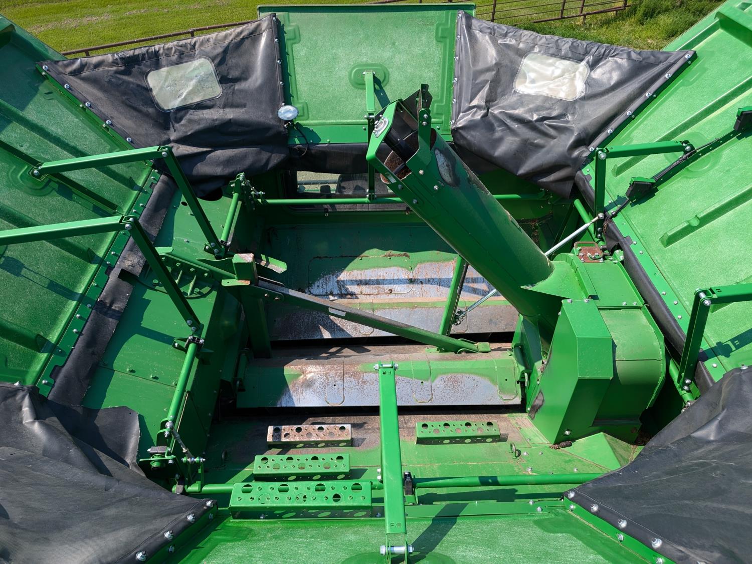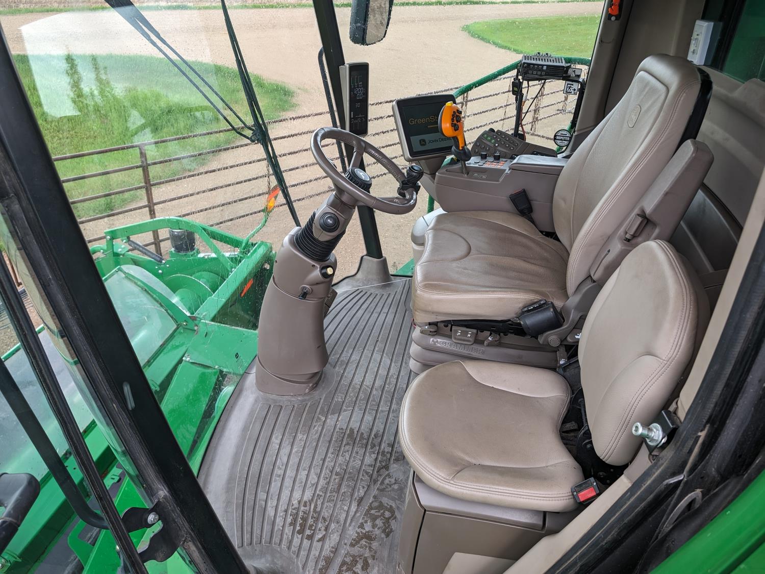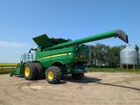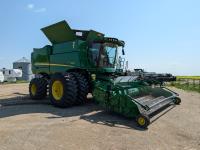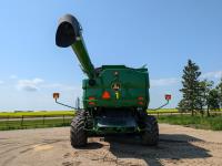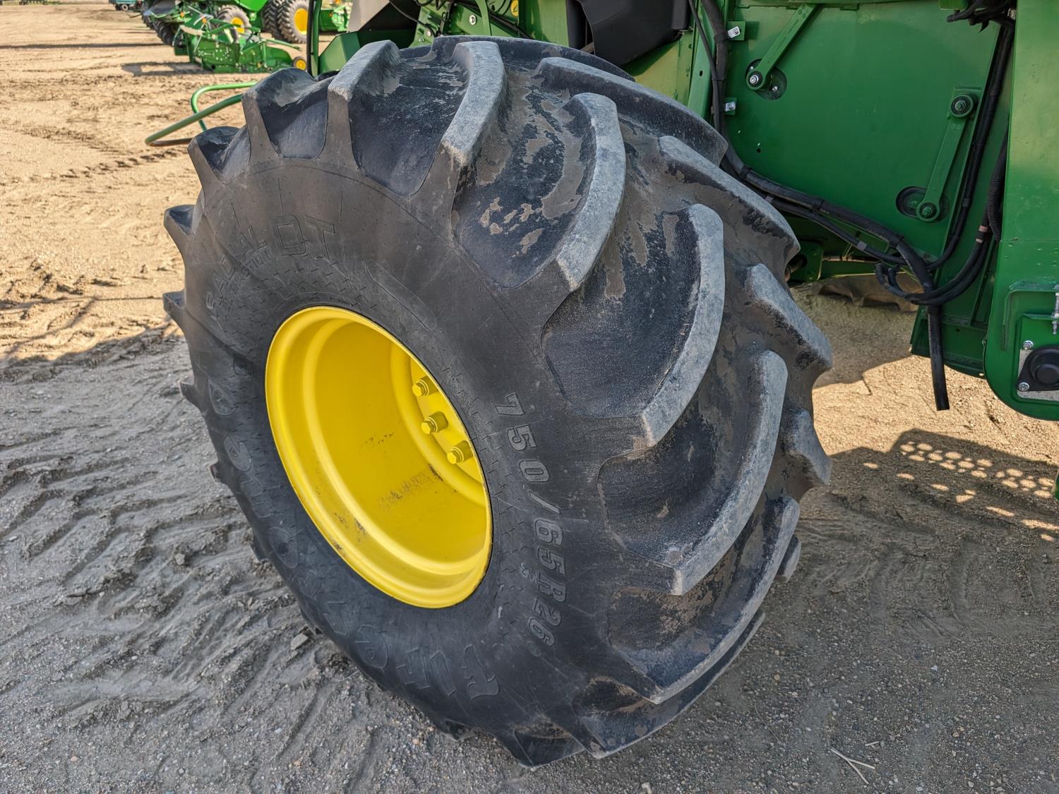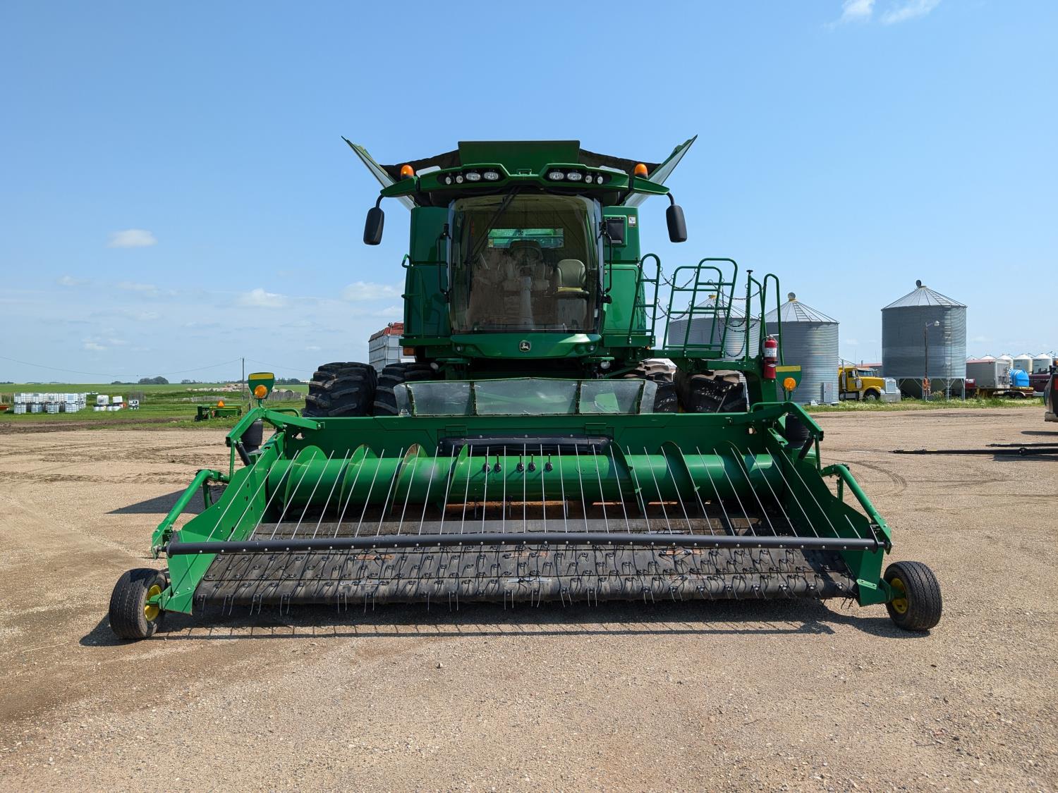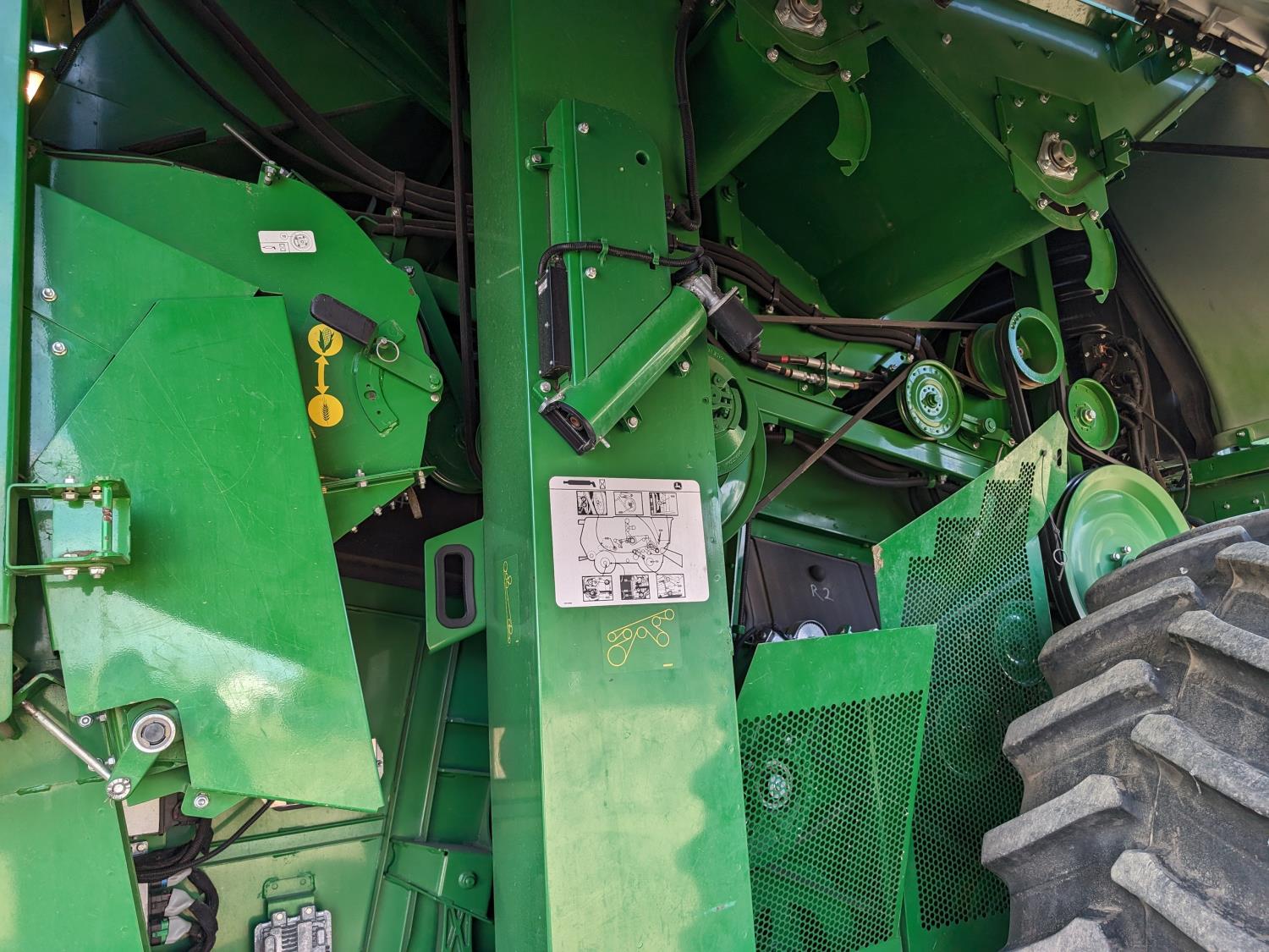 2015 John Deere 615P 15 ft pick-up header, variable speed reel, auto header height, fore & aft, reverser, lateral tilt, rock trap, yield & moisture, auto fold grain tank extensions, 28.5 ft auger, premium lighting, Active convave, Prodrive transmission, Advanced Powercast Tailboard Chopper/Spreader, A/C, radio, upgraded stereo, air ride seat, buddy seat, AutoGuidance Steering, 650/85R38 front tires, duals, 750/65R26 rear tires