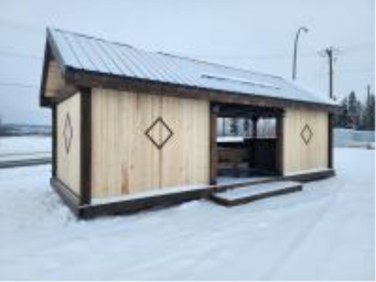 kitchen with sink, wired with pot lights and generator hookup, fire pit, storage loft, metal roof, on skids.