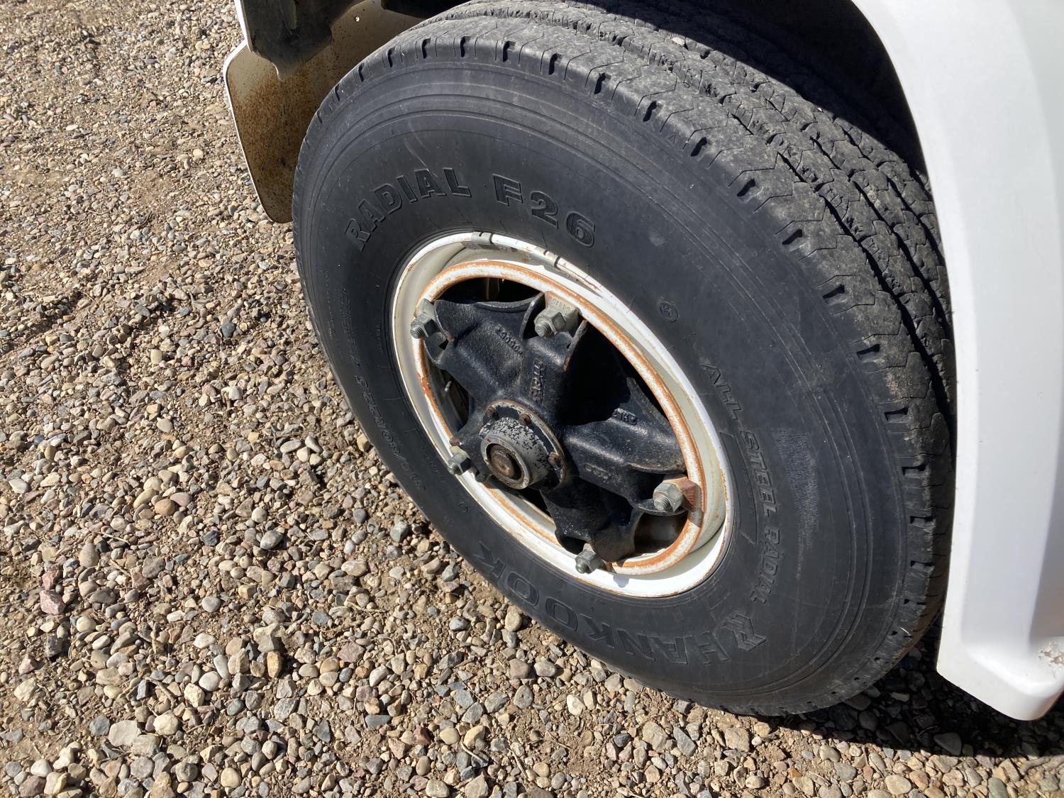 V8 gas engine, manual transmission, 16 ft box, spring suspension, 9,000 lb front axle, 19,000 lb rear axles, manual roll tarp, 315/80R22.5 front tires, 10.00R20 rear tires