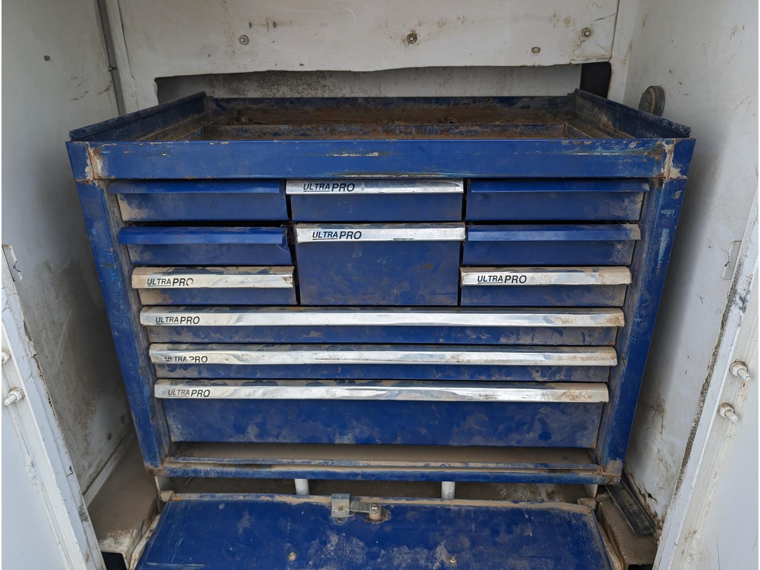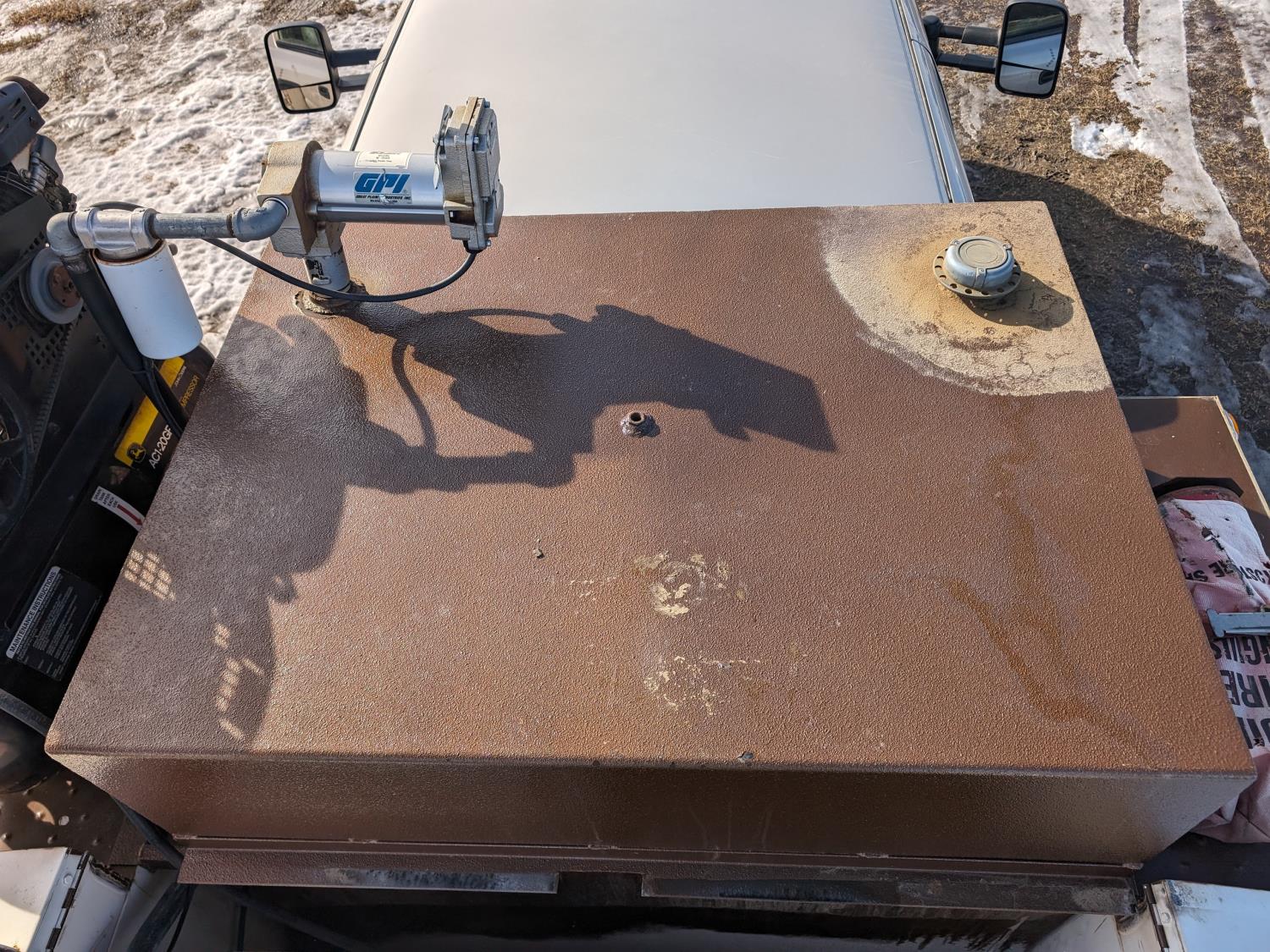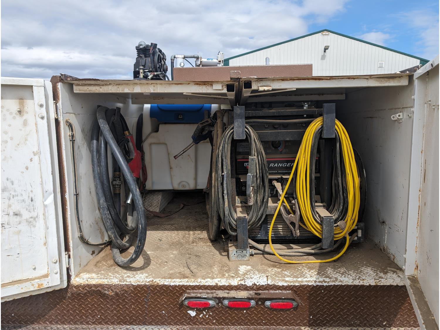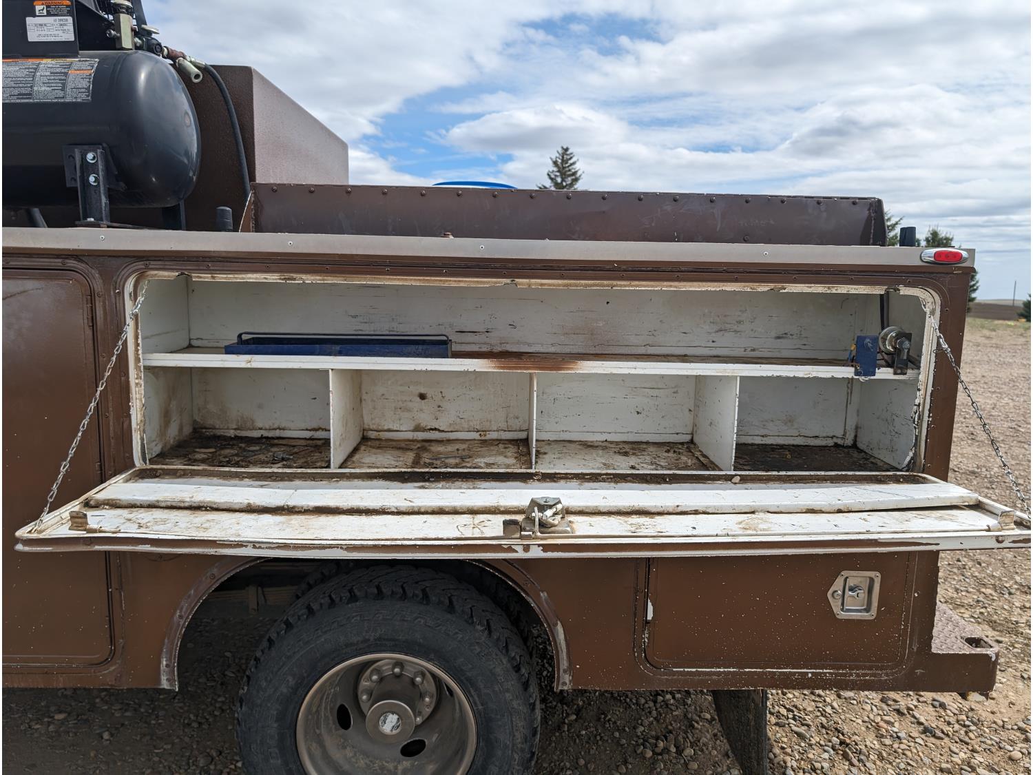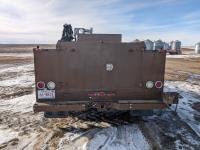 8.1 L V8 gas engine, automatic transmission, A/C, 2003 Milron 9 ft service body, Lincoln Electric Ranger 250 welder, John Deere ACI-20GR air compressor, 1135 Liter fuel tank, transfer pump, hose, nozzle, DEF tank, pump, hose, nozzle, bench vise, 215/85R16 tires