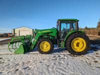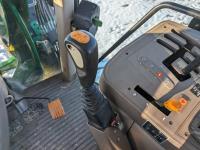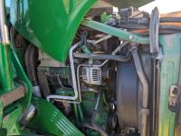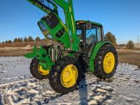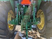 John Deere 673 loader, Q/A, 88 inch bucket, grapple, mid mount hydraulic connection, John Deere 4.5 4 cylinder 120 HP, diesel engine, 90 PTO HP, 24 speed partial power shift transmission, cab, ROPS, left hand reverser, joystick, A/C, radio, air ride seat, 540/1000 PTO, 3 point hitch, 3 rear hydraulic outlets, rear wheel weights, 340/85R28 front tires, 460/85R38 rear tires