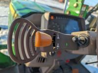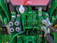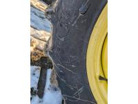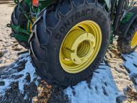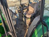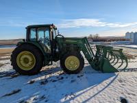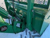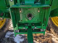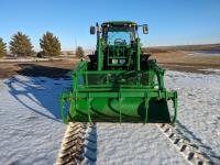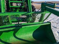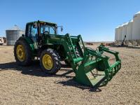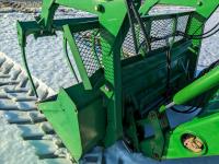 John Deere 673 loader, Q/A, 88 inch bucket, grapple, mid mount hydraulic connection, John Deere 4.5 4 cylinder 120 HP, diesel engine, 90 PTO HP, 24 speed partial power shift transmission, cab, ROPS, left hand reverser, joystick, A/C, radio, air ride seat, 540/1000 PTO, 3 point hitch, 3 rear hydraulic outlets, rear wheel weights, 340/85R28 front tires, 460/85R38 rear tires
