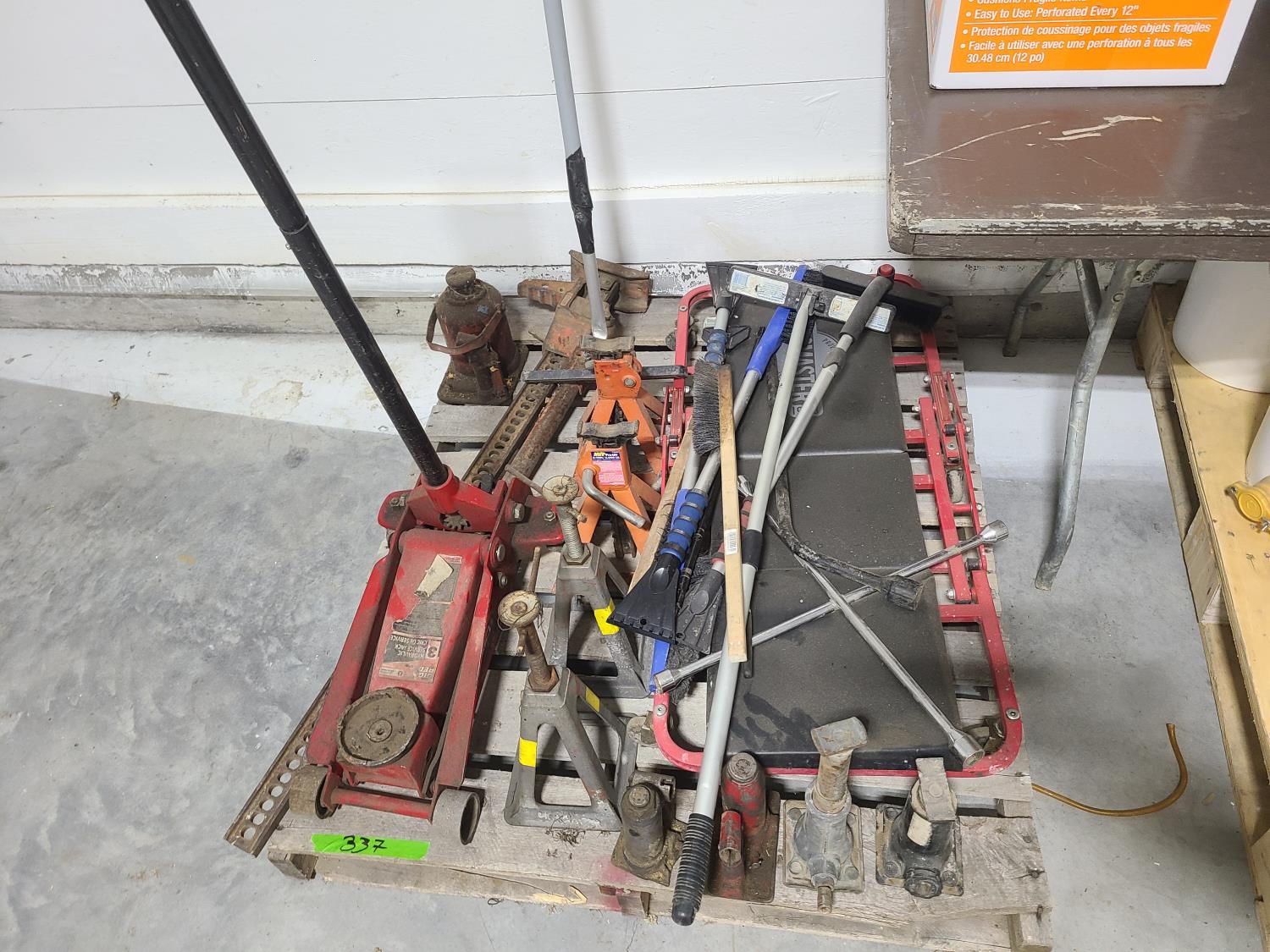3 ton floor jack, (4) jack stands, (2) bottle jacks, creeper & snowbrushes