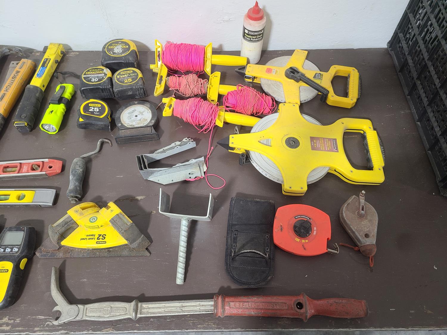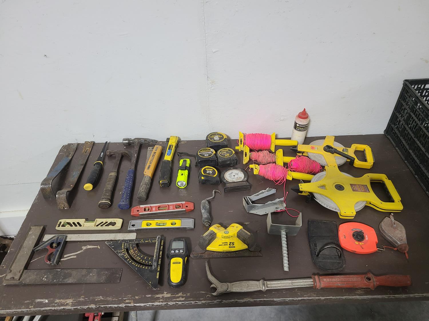 tape measrues, chalk lines, hammers, staplers, pry bars, levels, stud finder, squares
