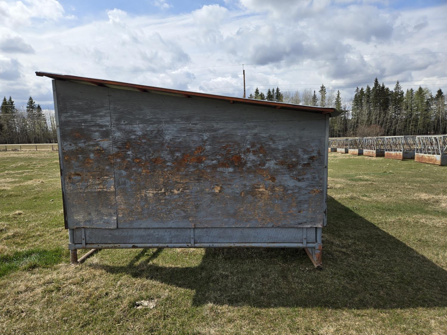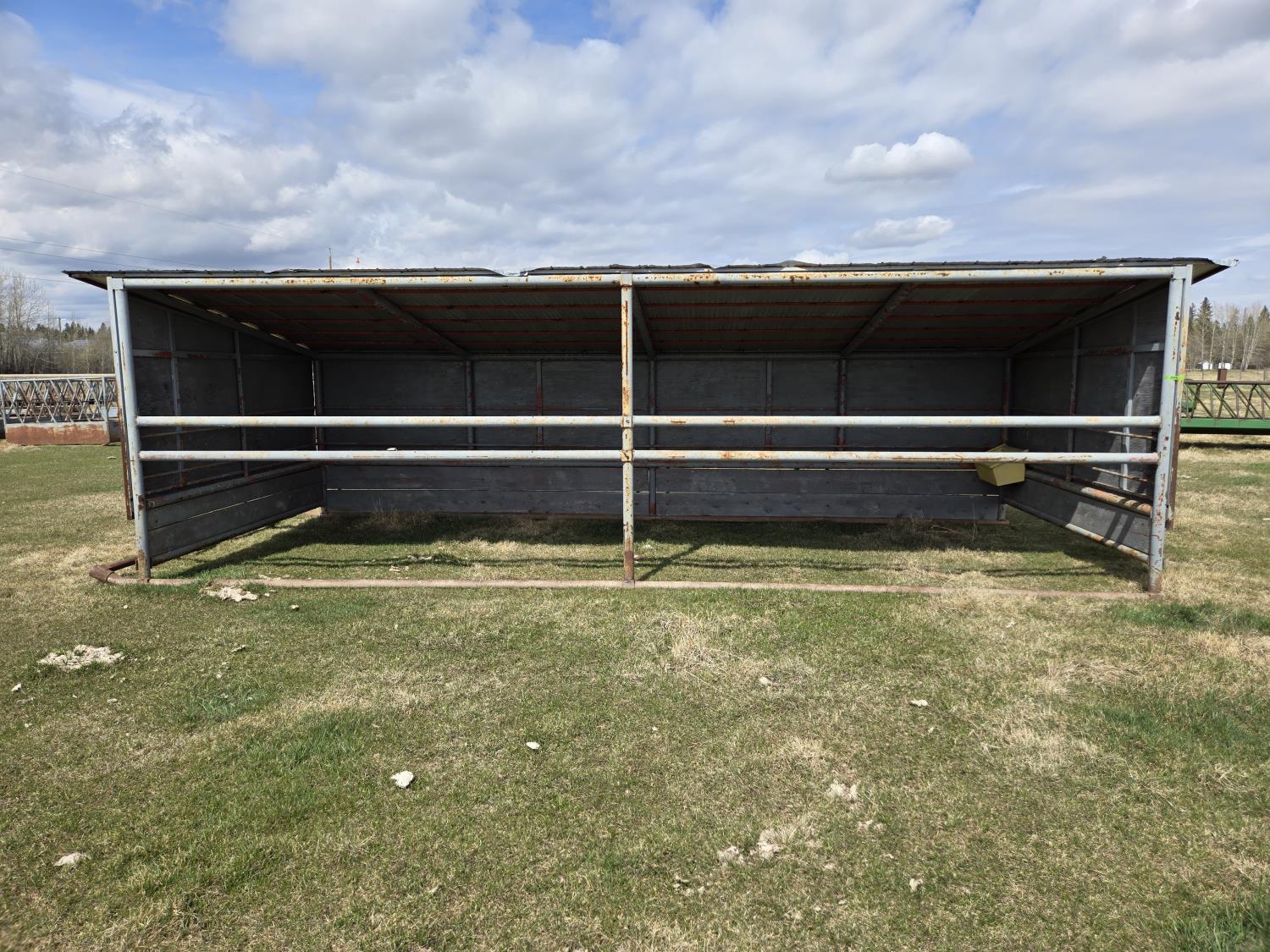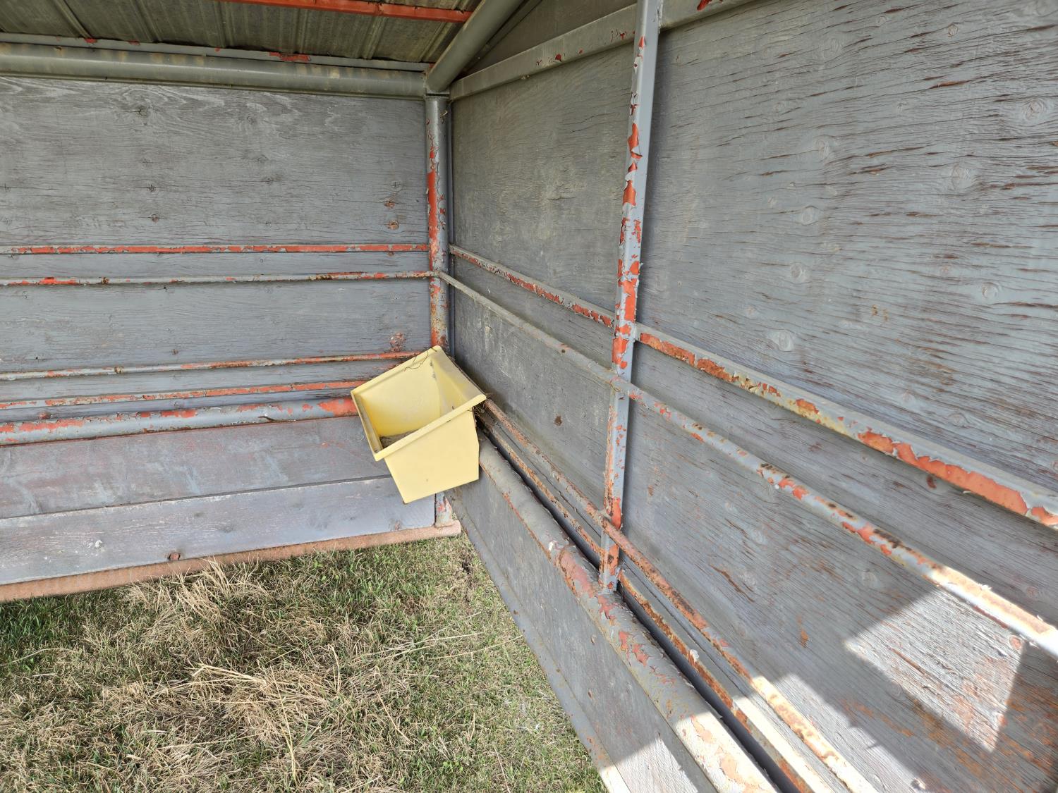 10 ft wide, 2-7/8 inch pipe frame and skids, small poly feed trough, metal roof plywood sides