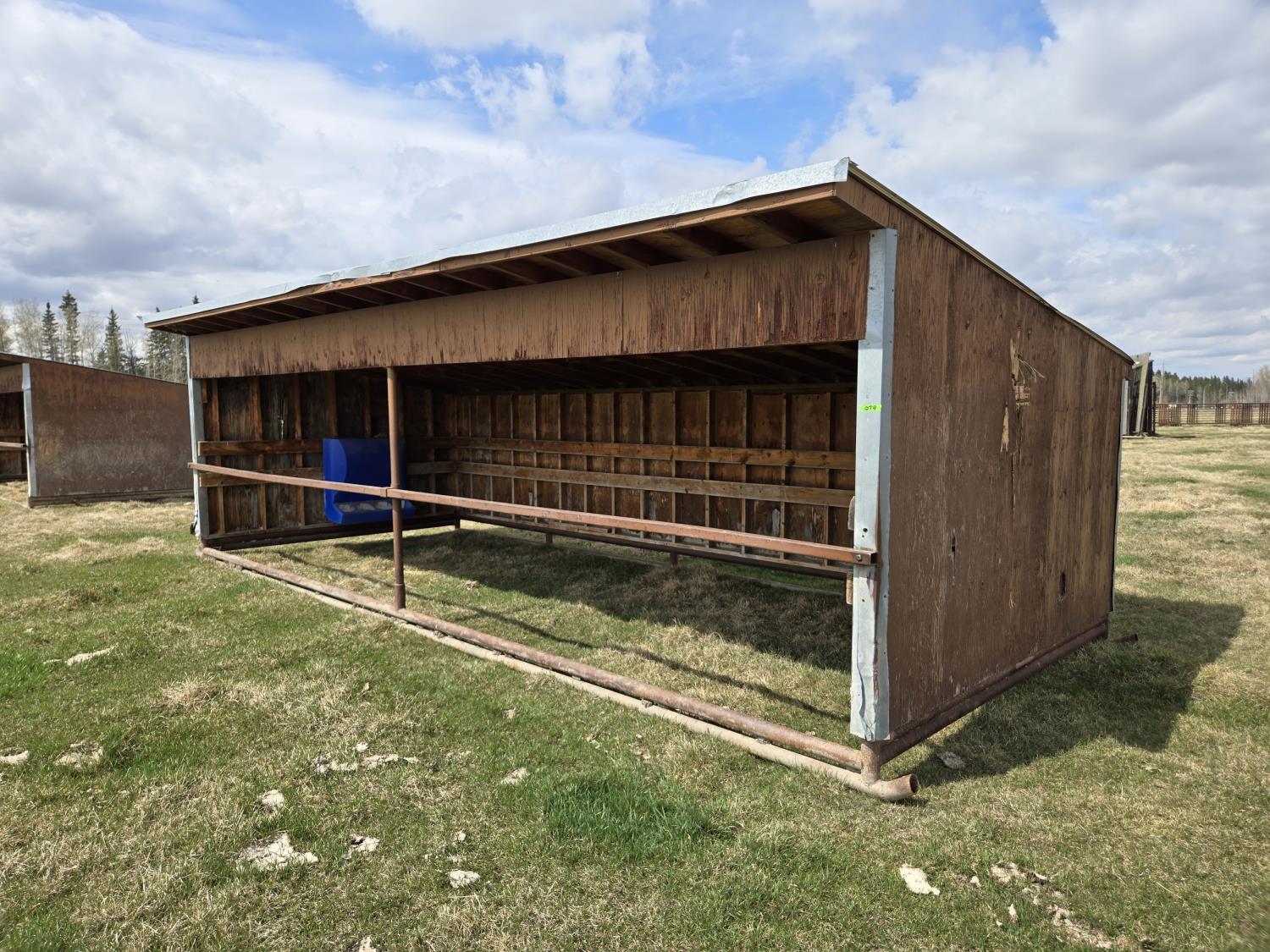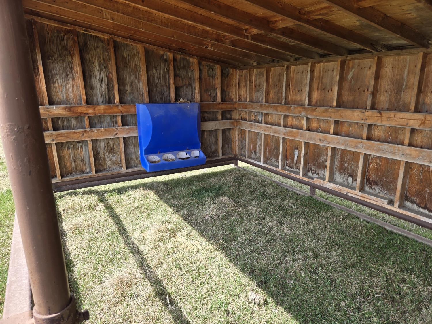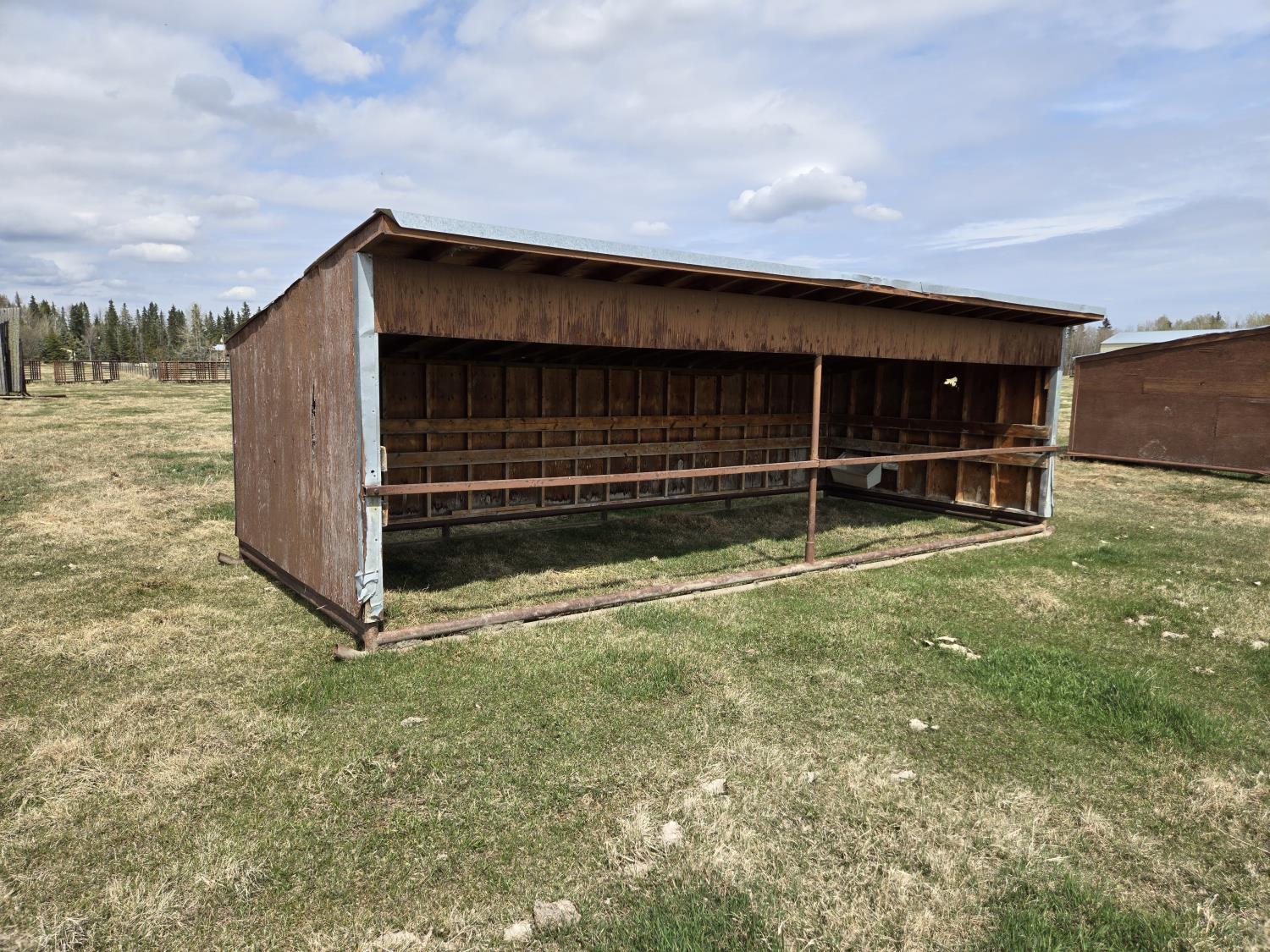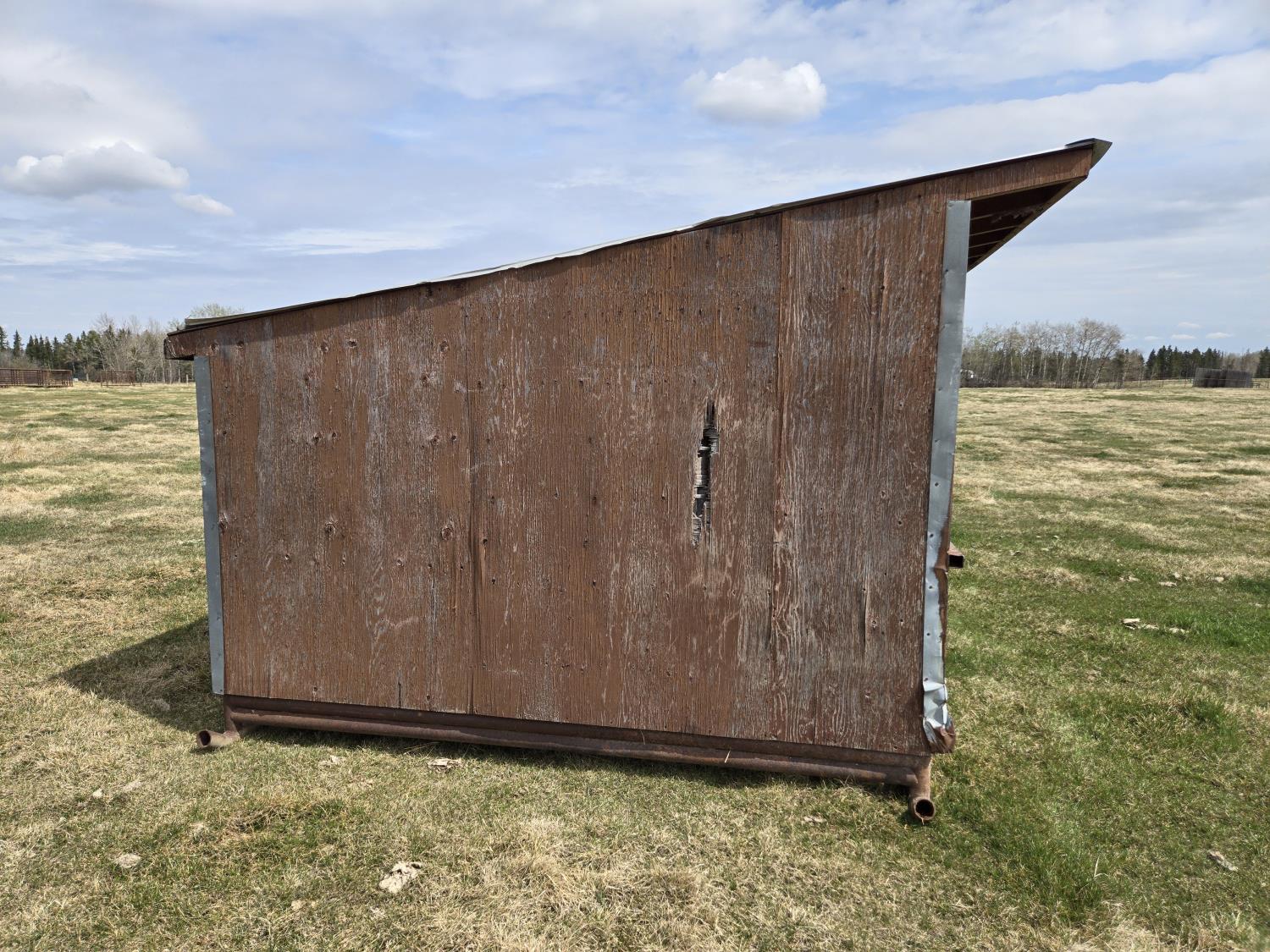 10 ft wide, 2-7/8 inch pipe frame skids, metal roof, wood construction, poly creep feeder, small poly trough