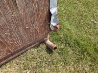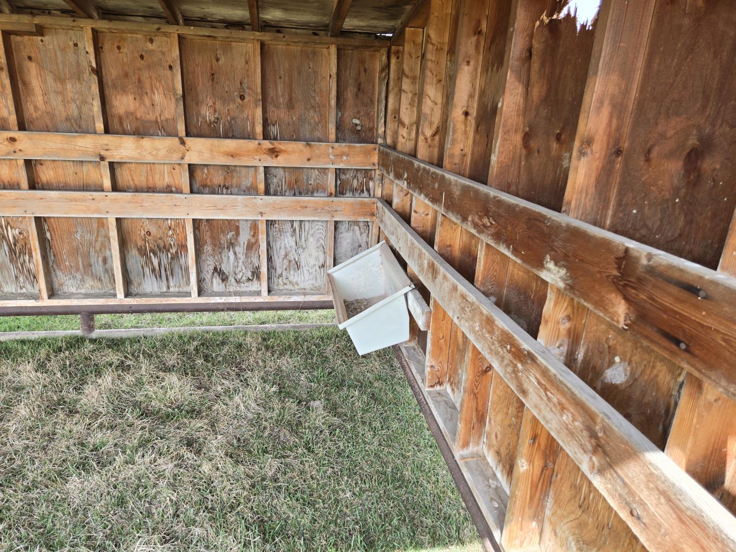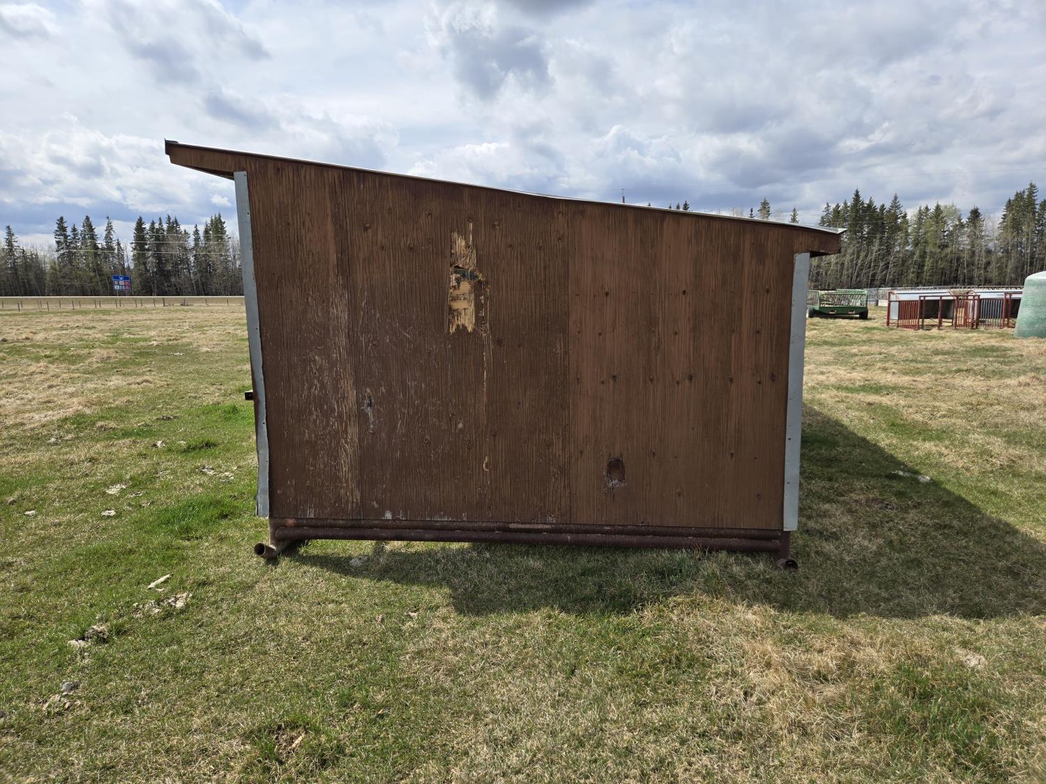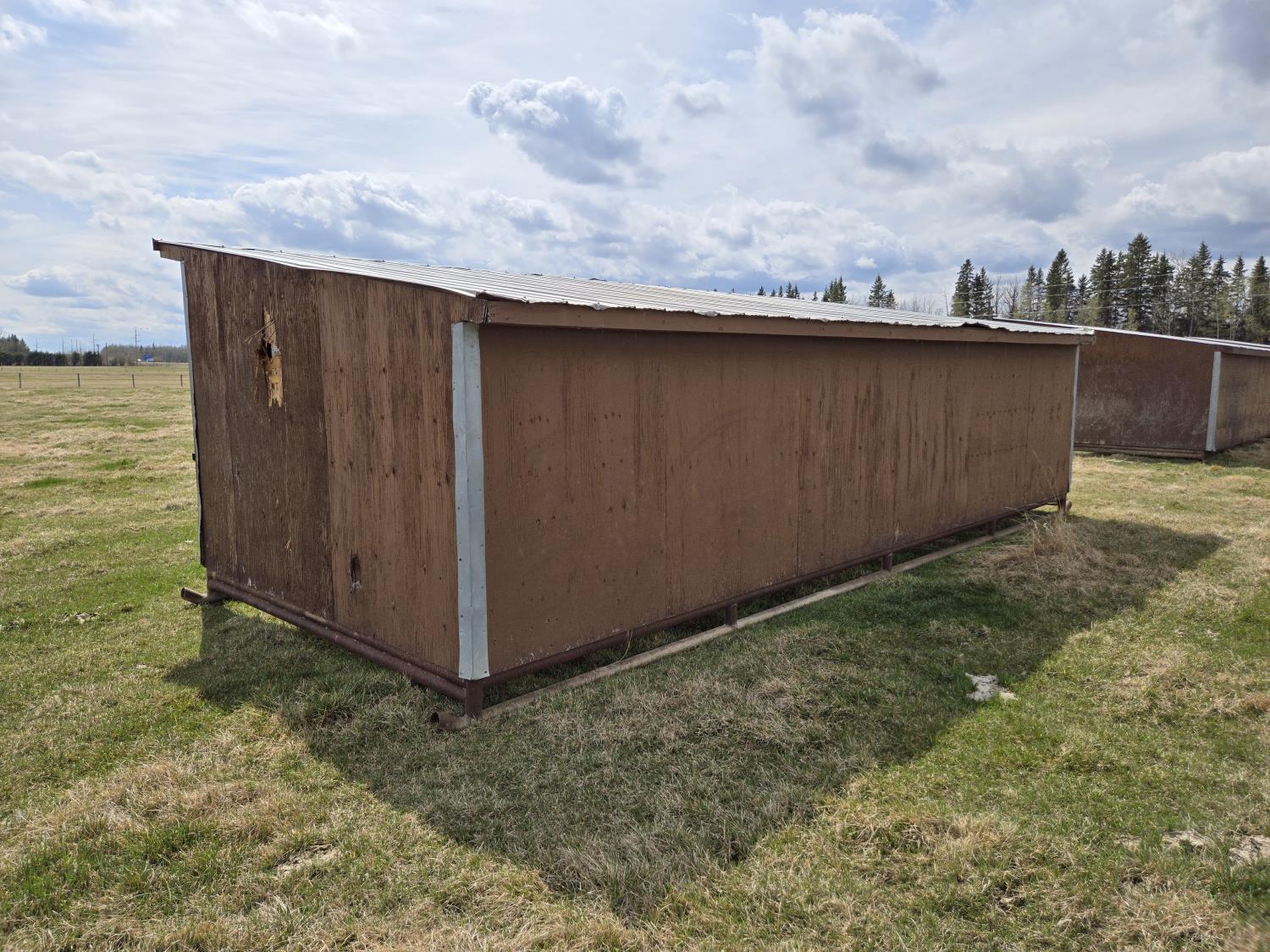 10 ft wide, 2-7/8 inch pipe frame skids, metal roof, wood construction, poly creep feeder, small poly trough