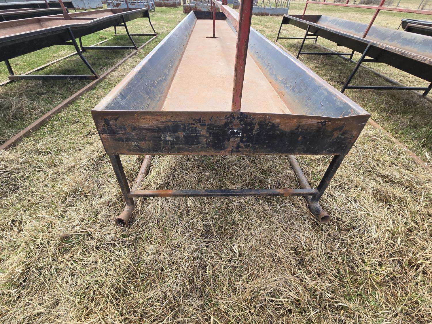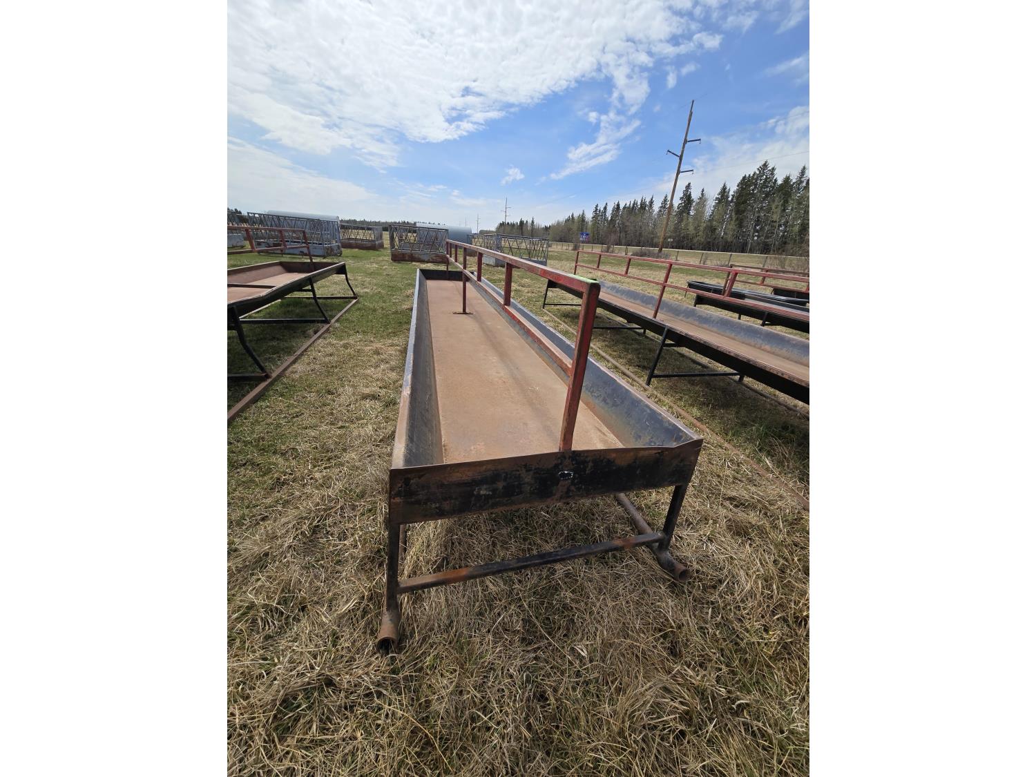 Pipe skids, square tube frame, 40 inch wide metal feed bunk trough, center two rail barrier