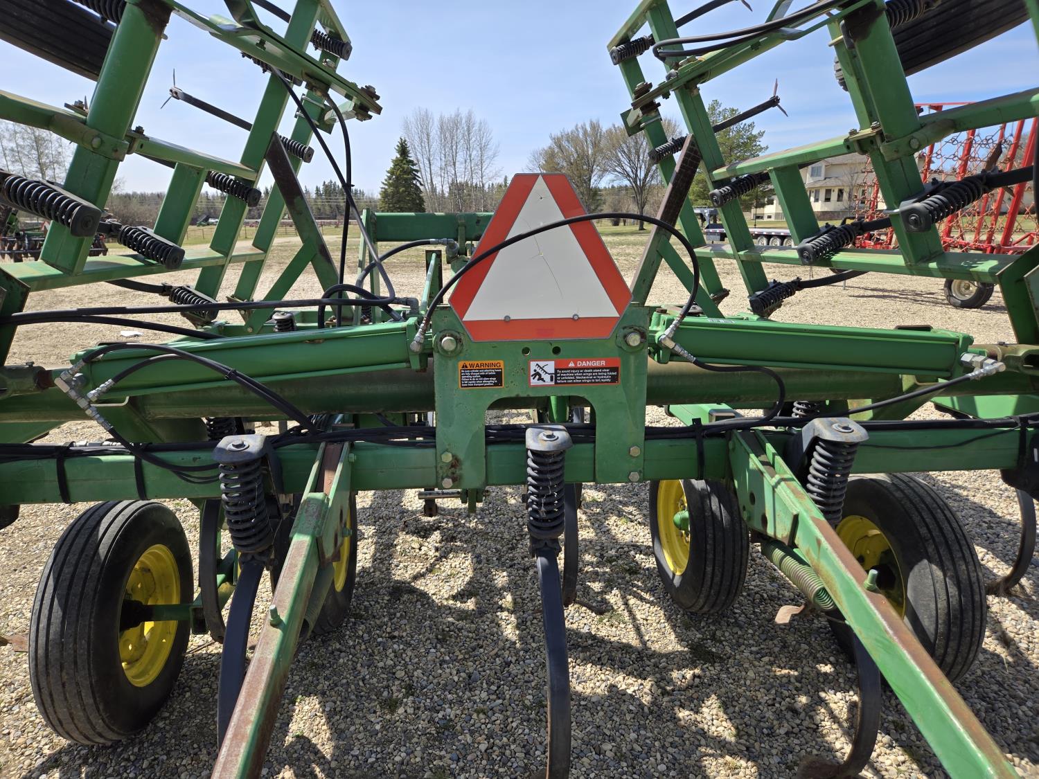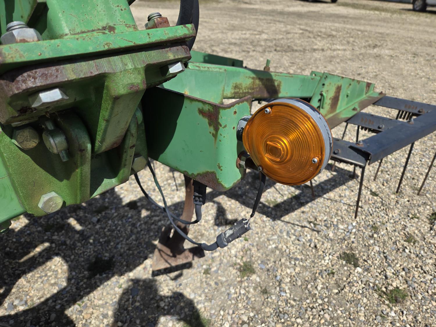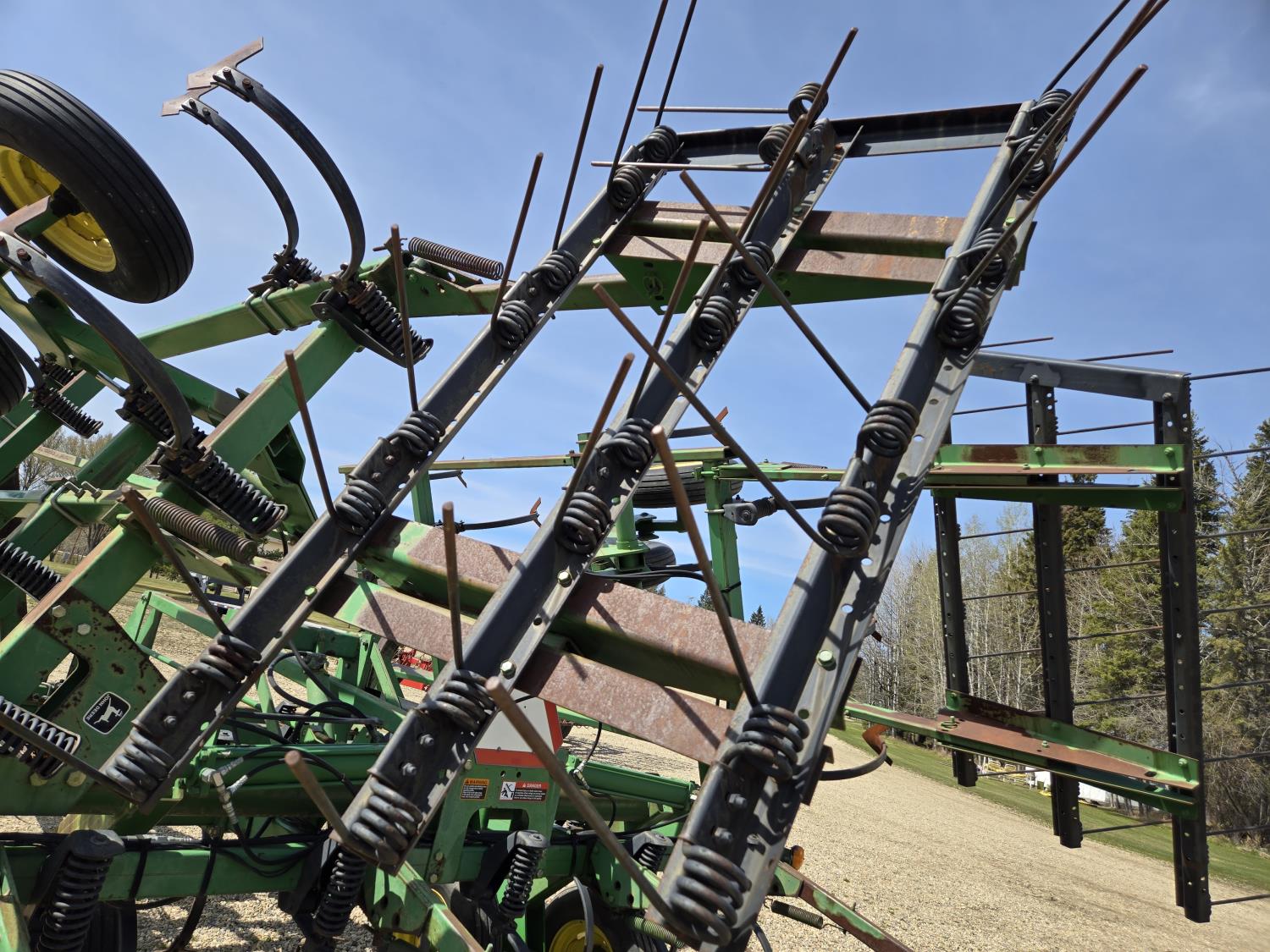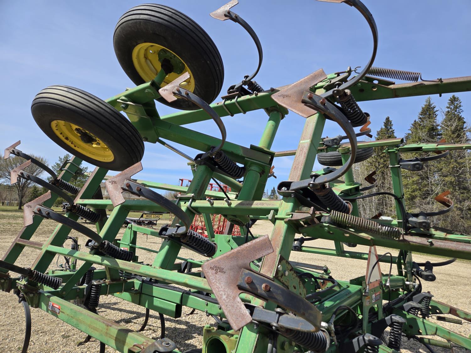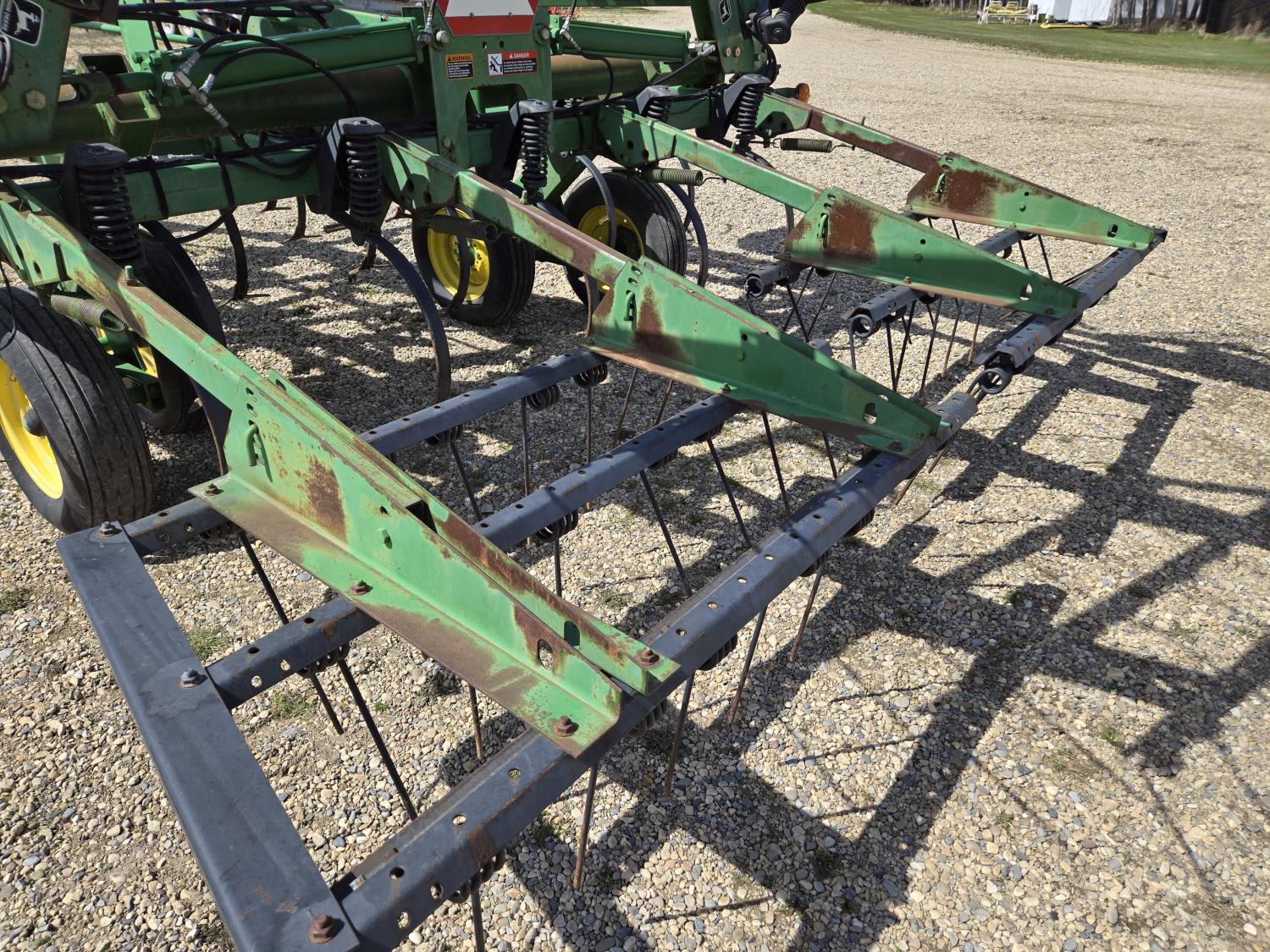 6 inch spacing, 9 inch sweeps, John Deere 3 bar spring tooth harrows, walking axles on main frame, walking axles on wings, 7.60-15 tires