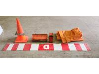 (2) pylons, road flares, tarp