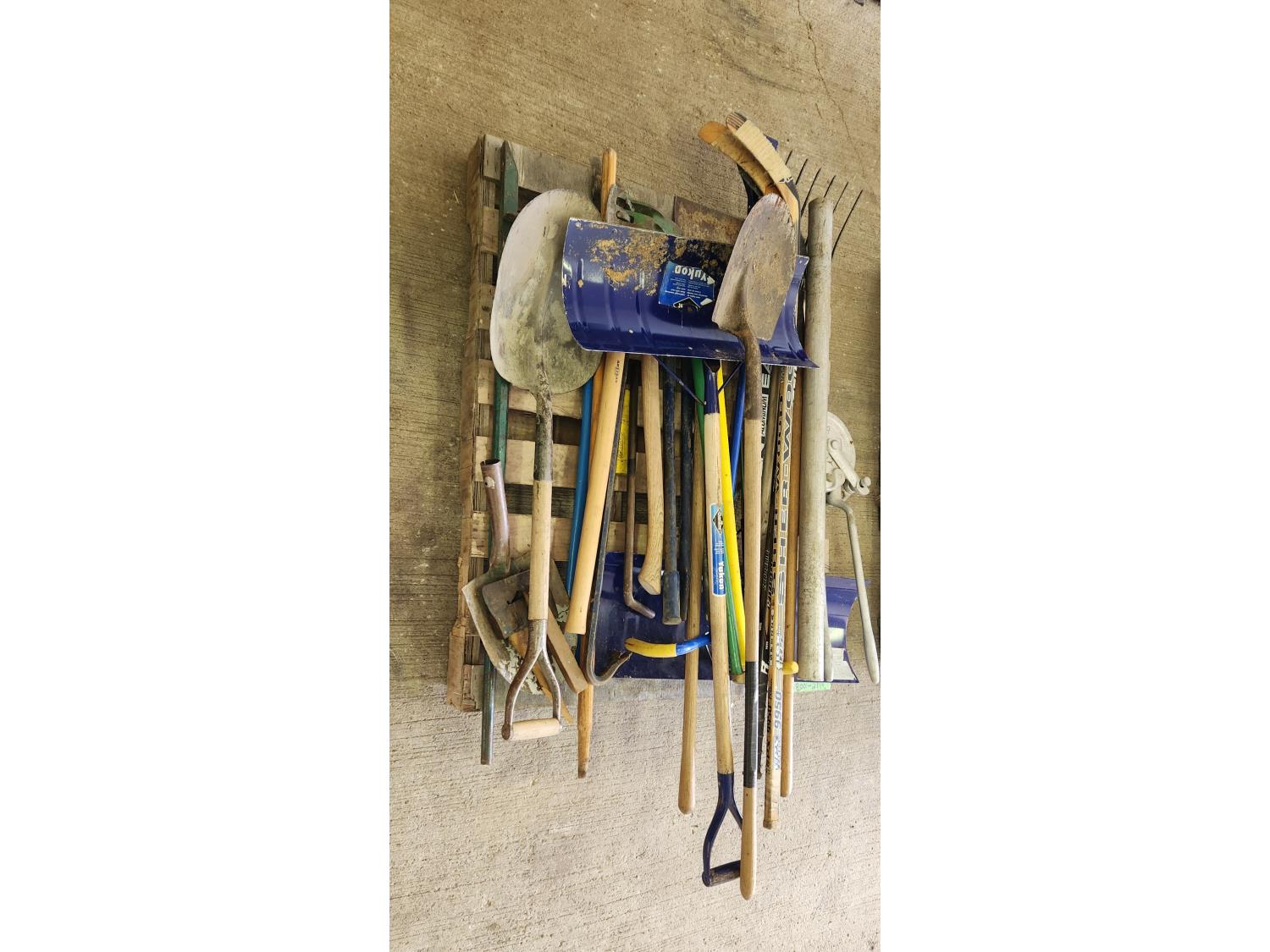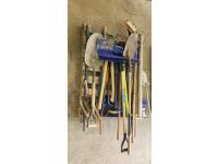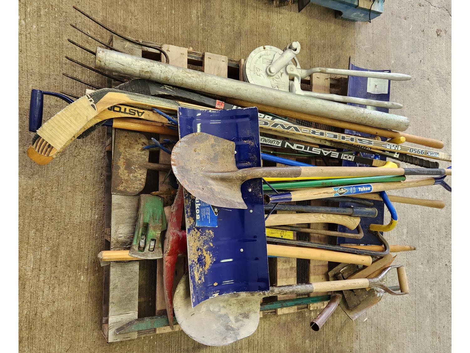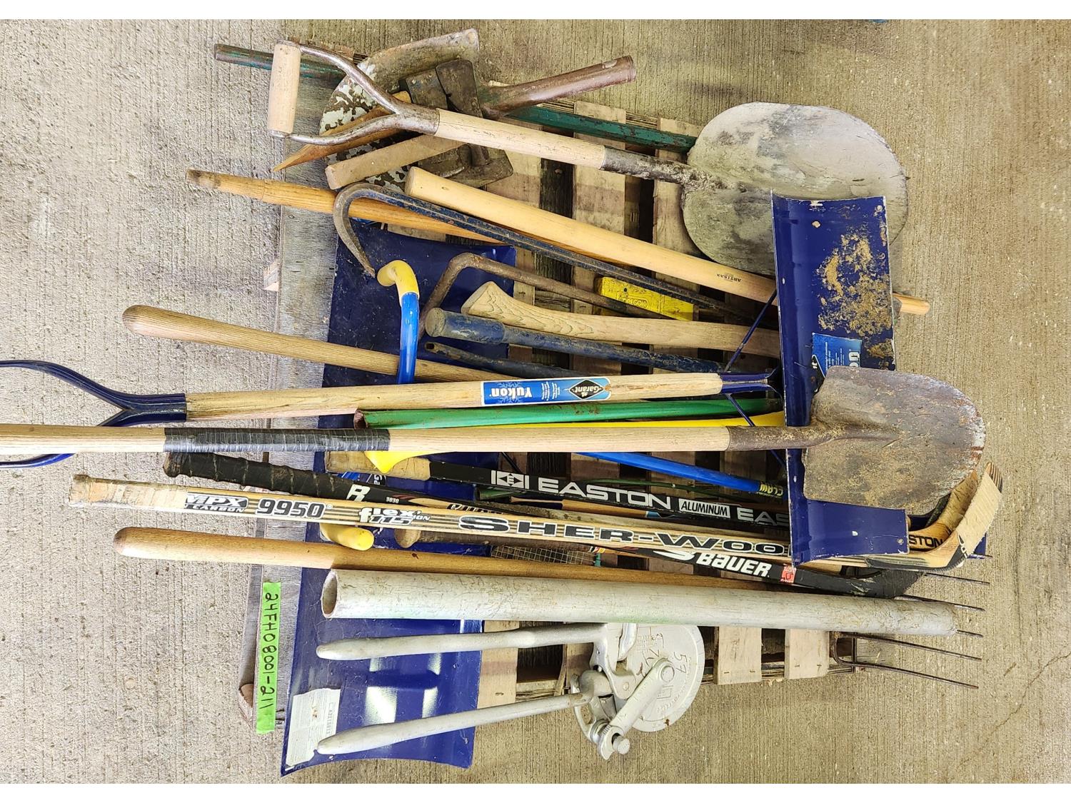 Shovels, crowbars, axe, pitch fork, tubing bender, hockey sticks
