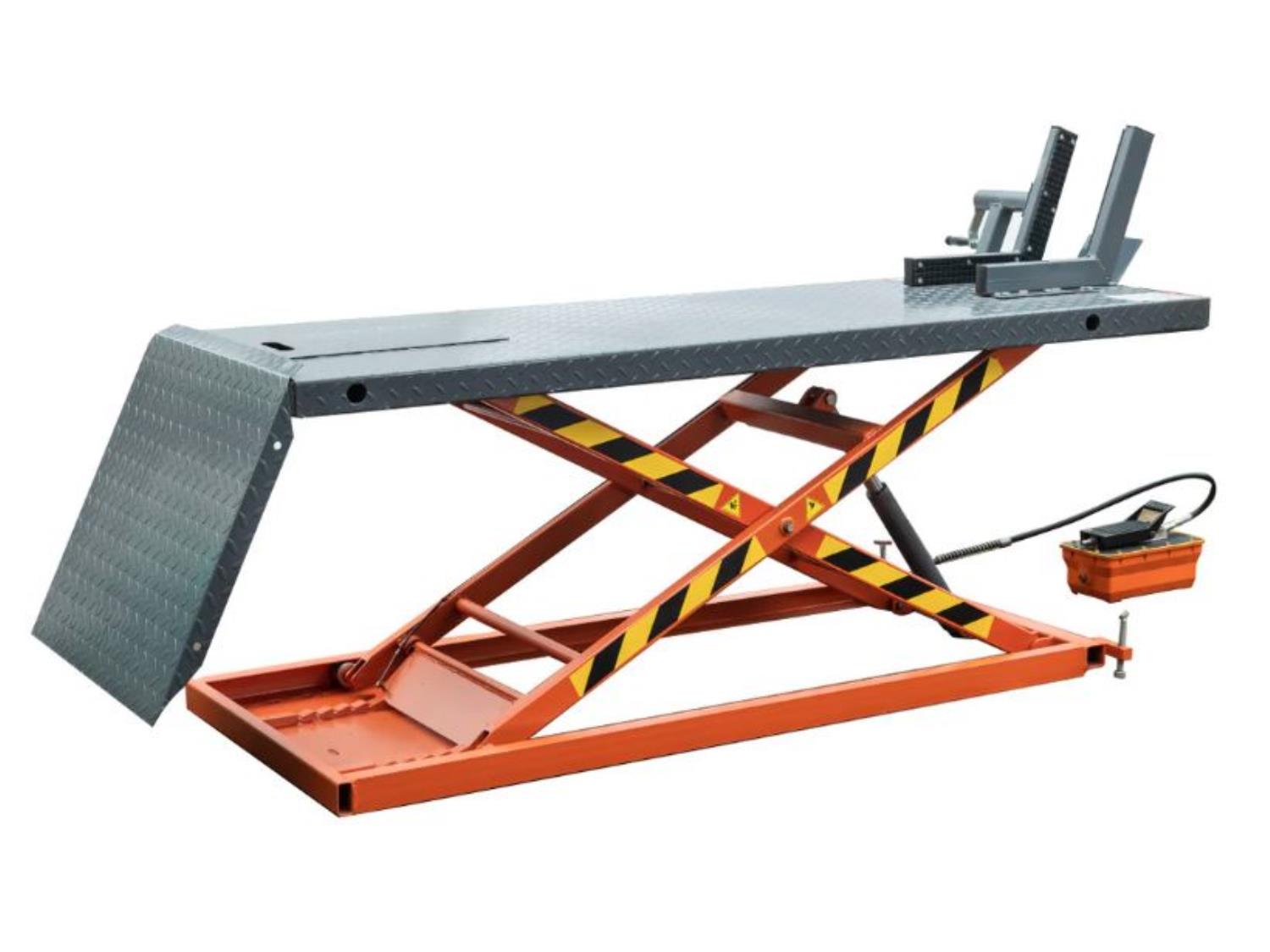 48” work platform, side extensions, foot pedal air pump, front-wheel vise grip