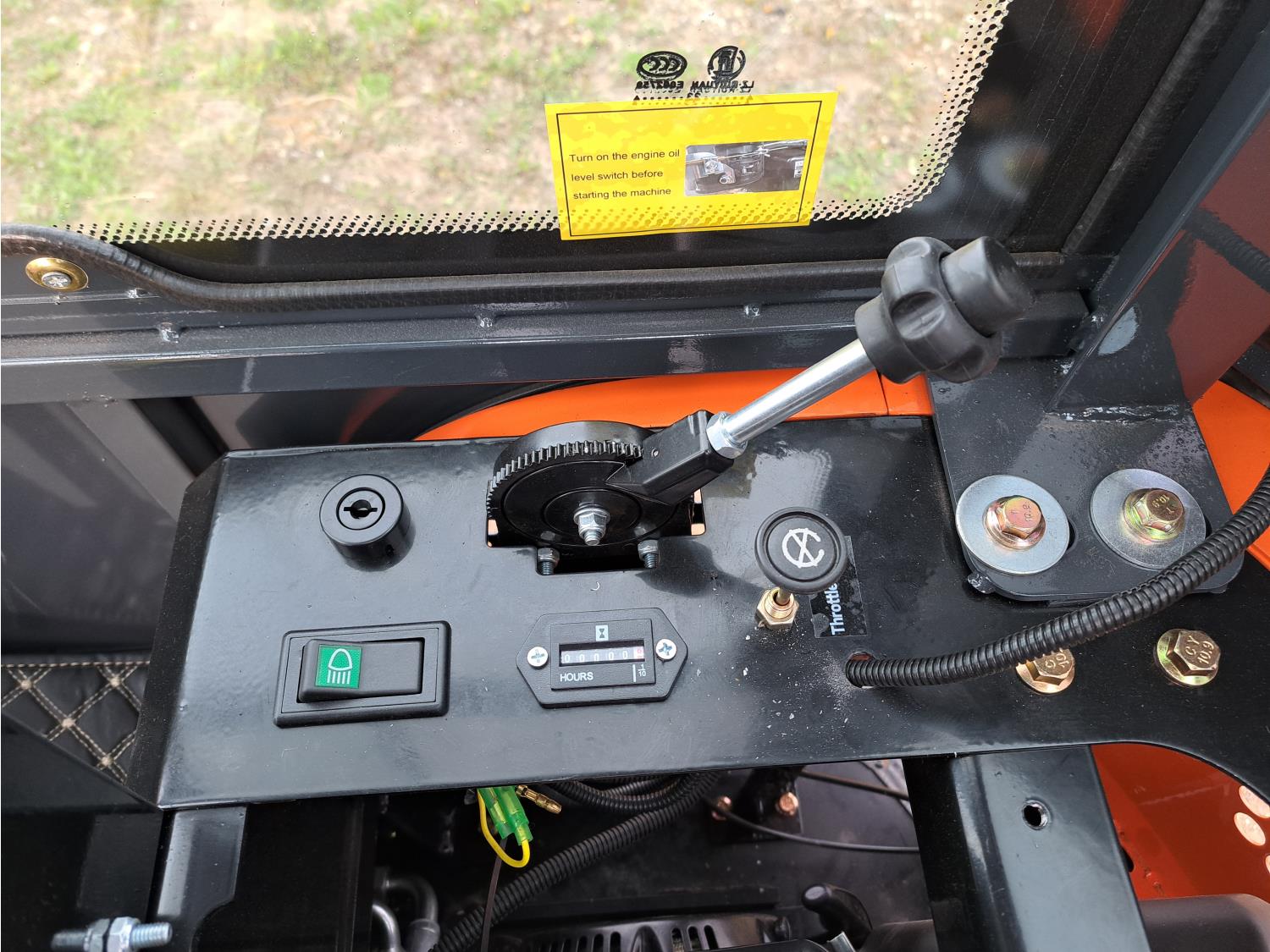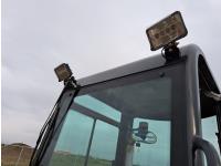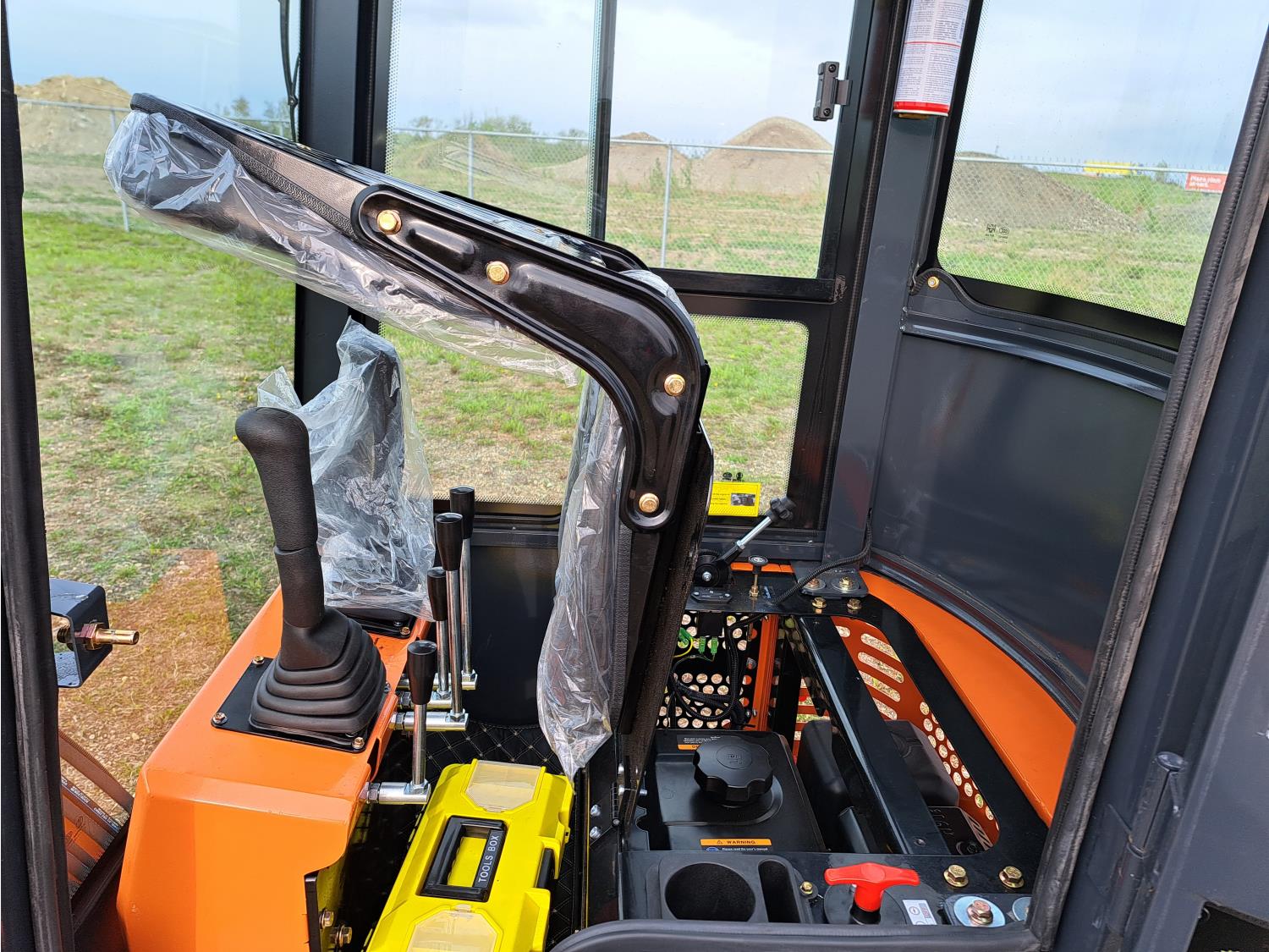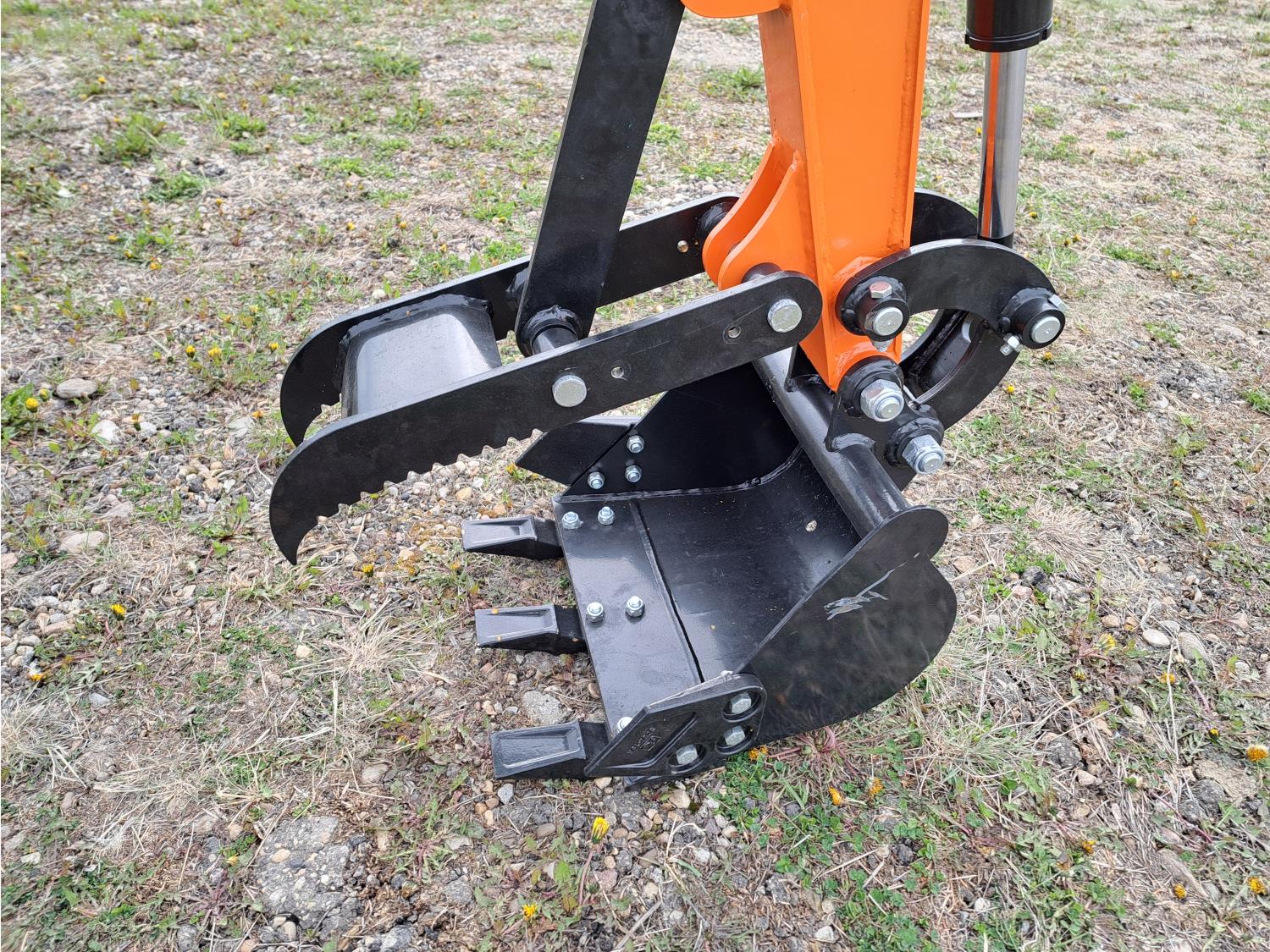 Enclosed cab, pilot controls, gas engine, bucket, manual thumb