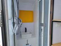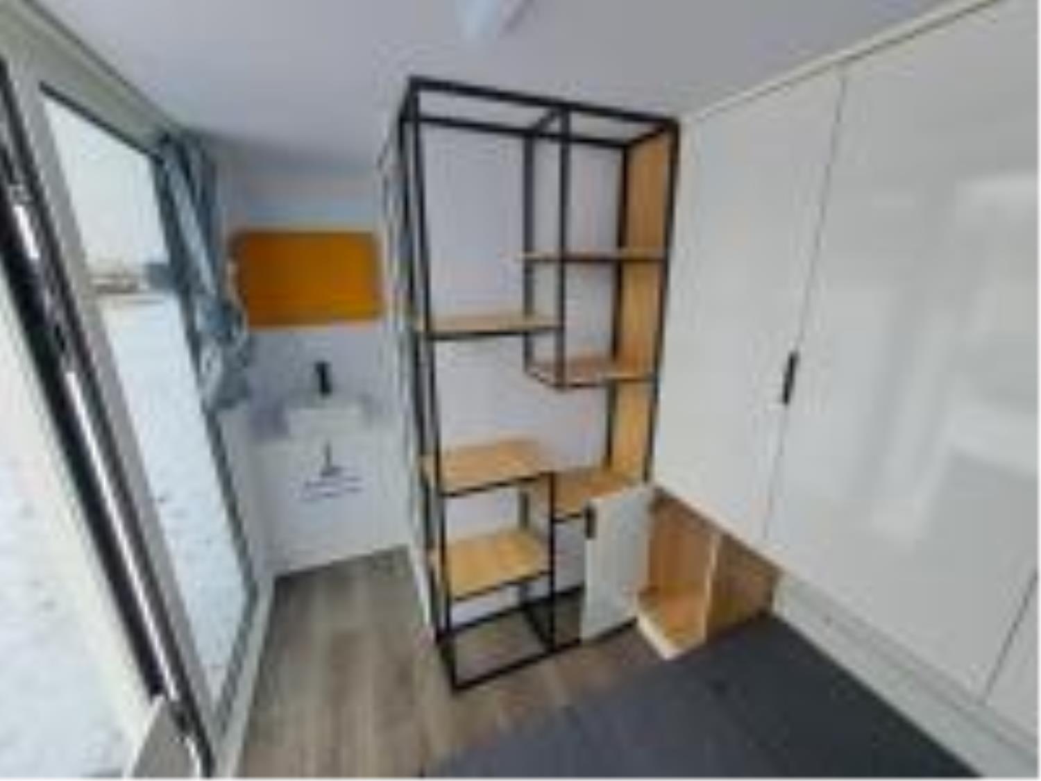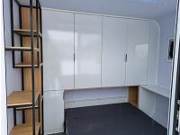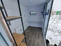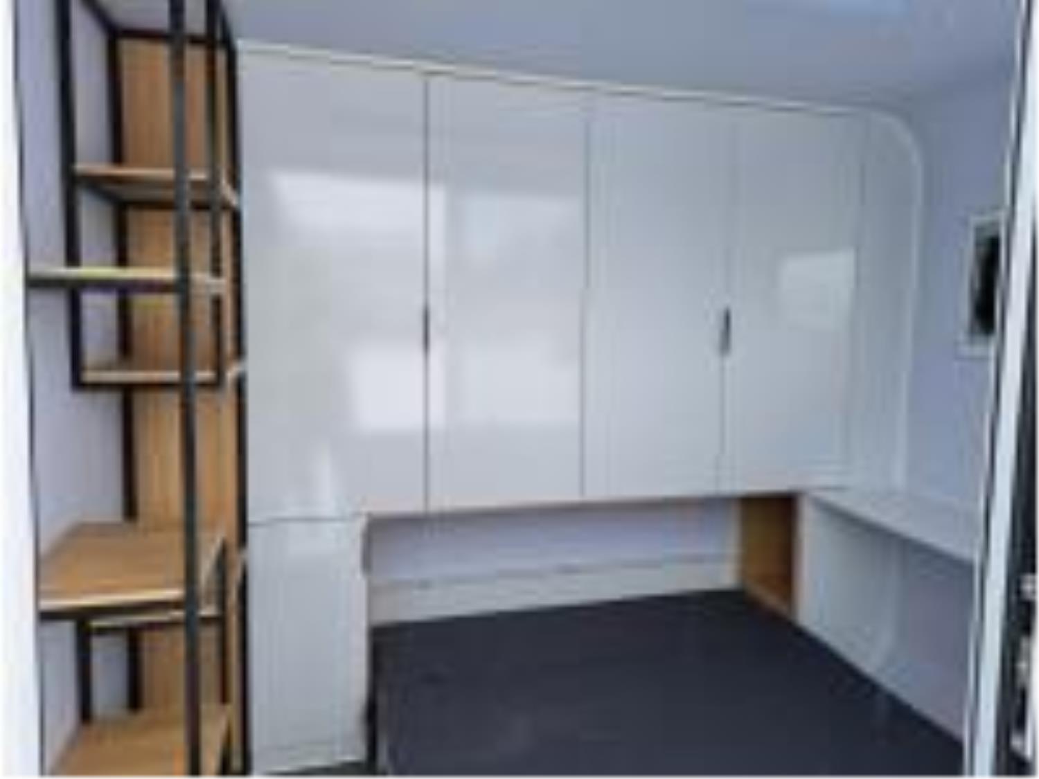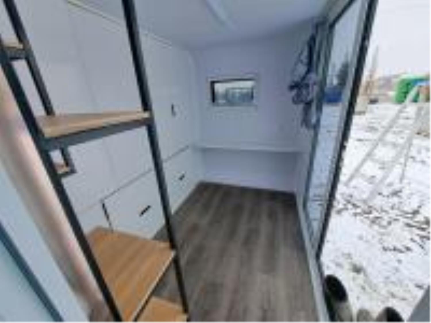 88 inch wide X 92 inch high, 110 volt, toilet shower combo, fold in bed, lots of storage space, sink, mirror, glass door, sliding screens and blinds, curtains, wood panel flooring