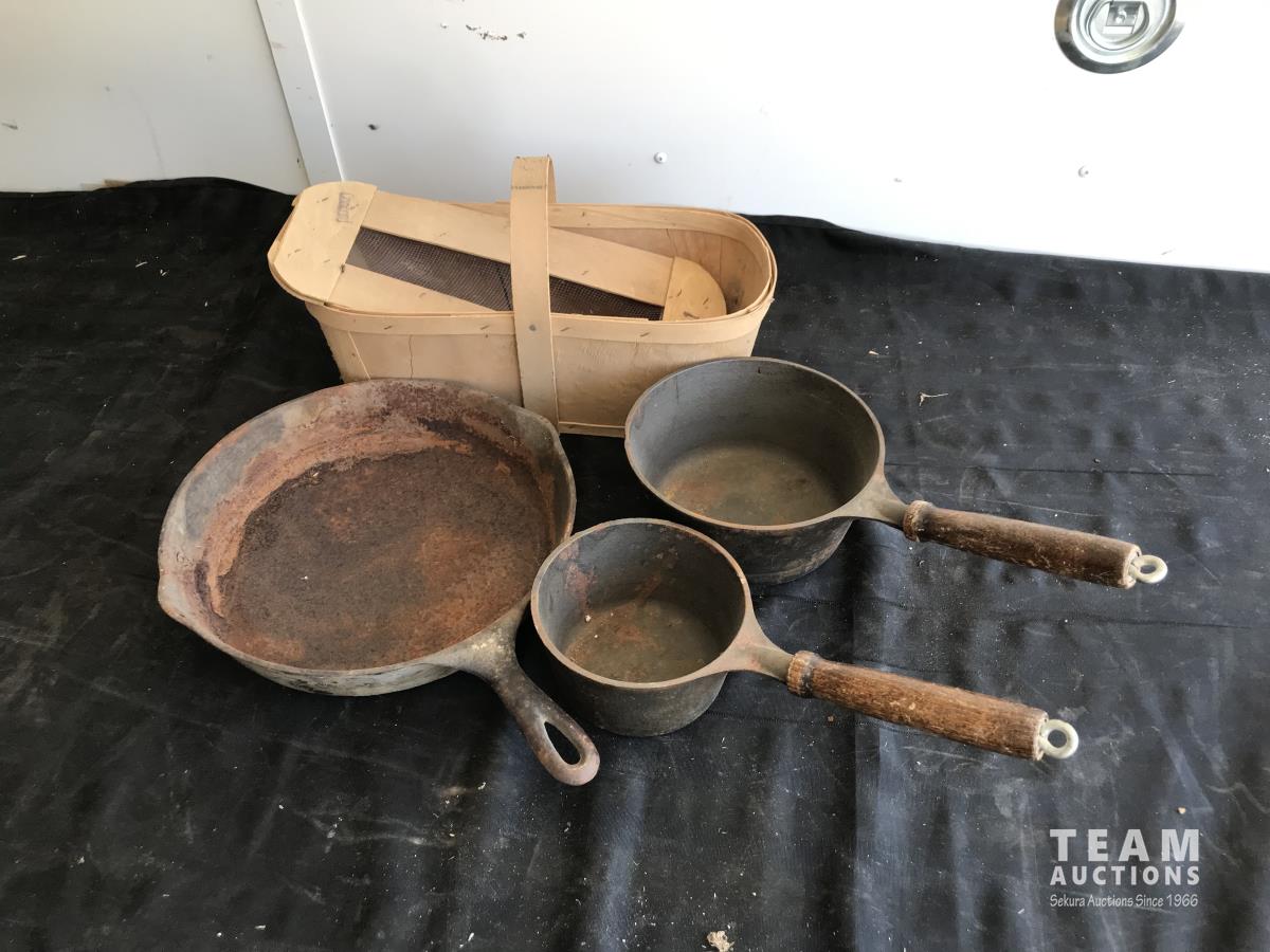 1546 (2) Cast Iron Sauce Pan w/ Cast Iron Frying Pan & Wood Basket