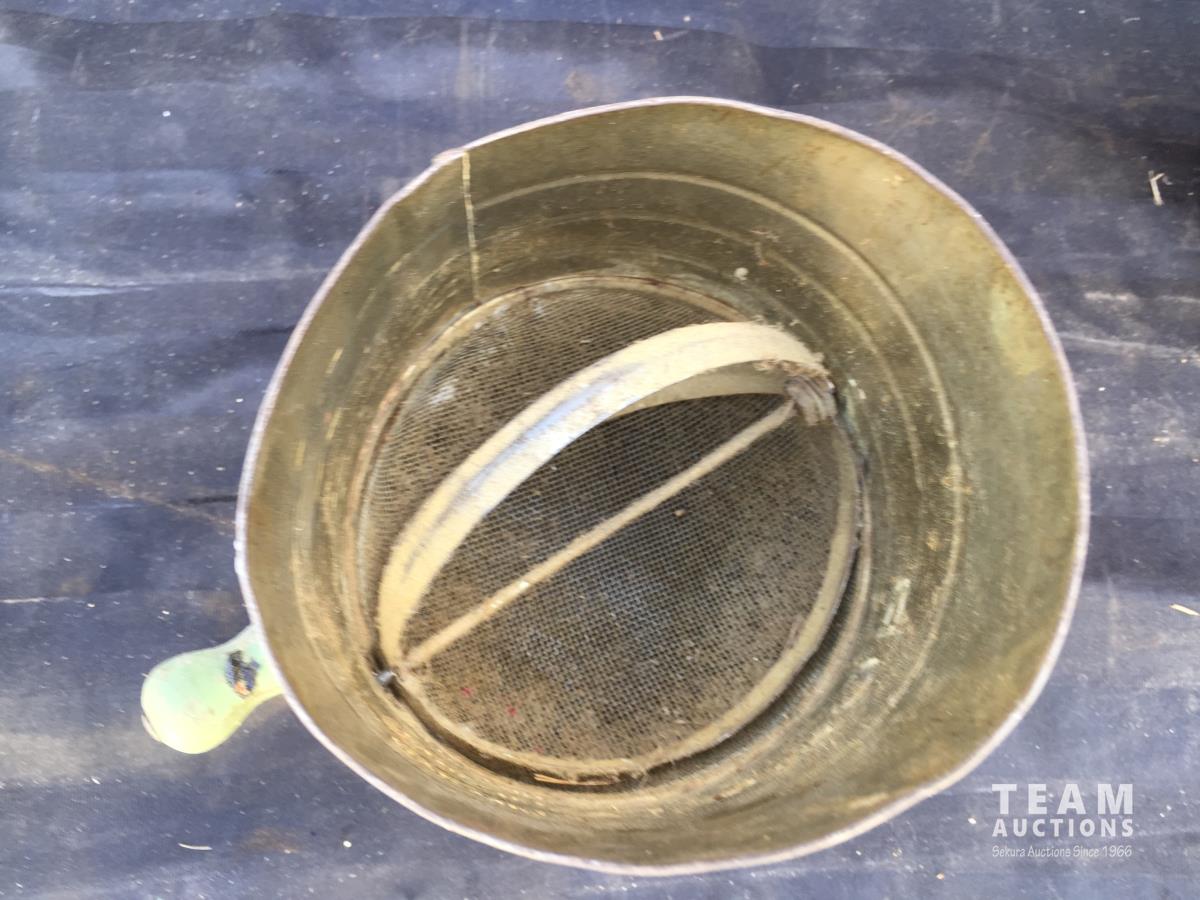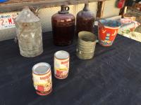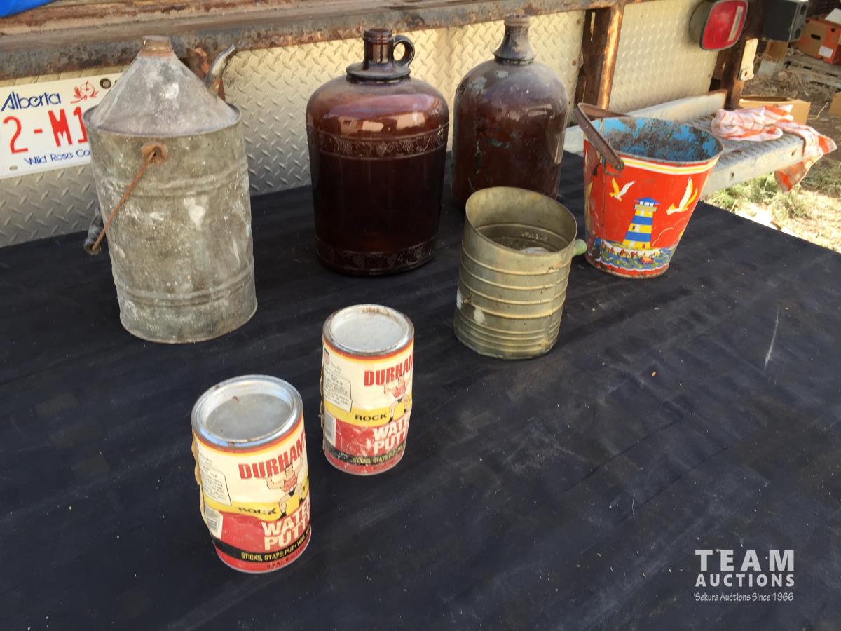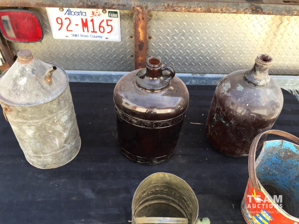 1697 (2) Glass Jugs, (2) Tins, Bucket, Sifter & Metal Can