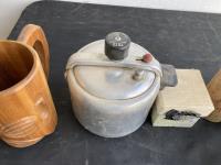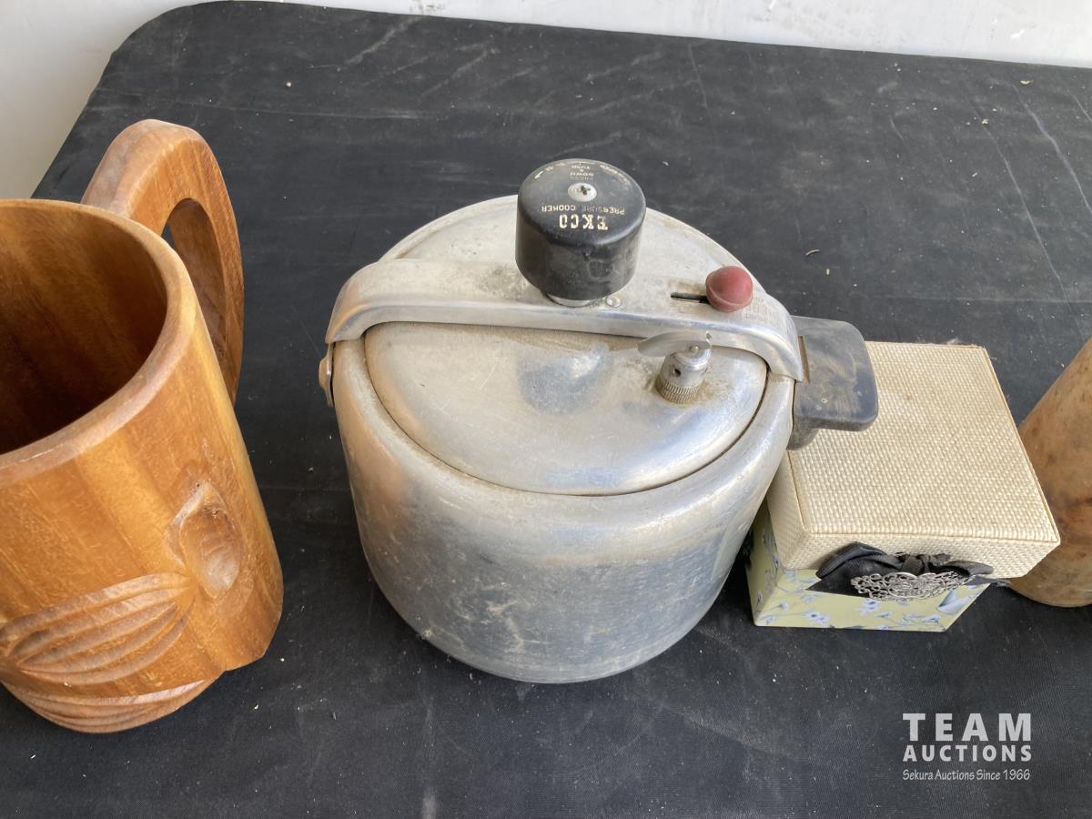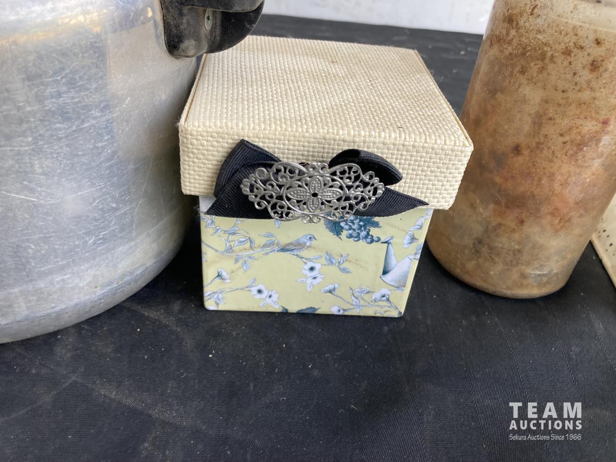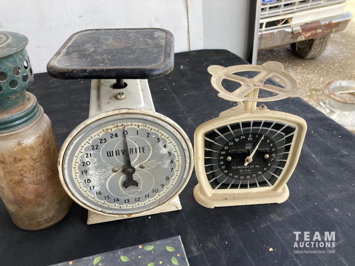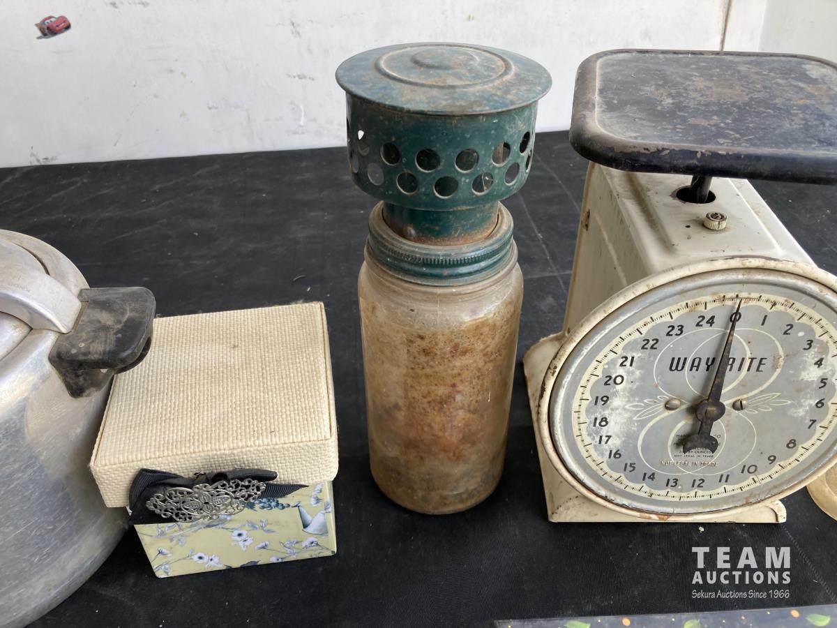 1974 (2) Scales, (3) Boxes, Tea Pot & Wooden Cup