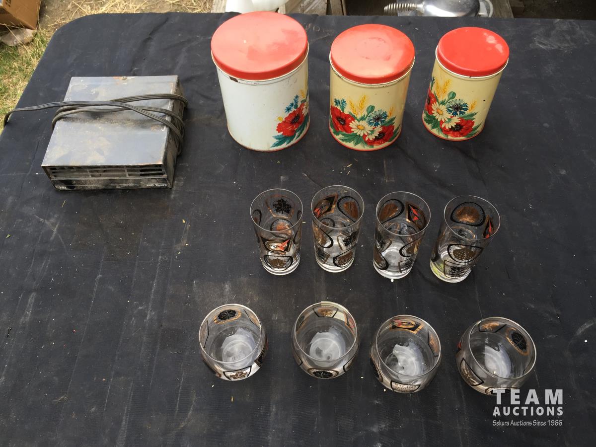 1751 (3) Tins, (8) Glasses & Termo Warmer
