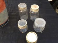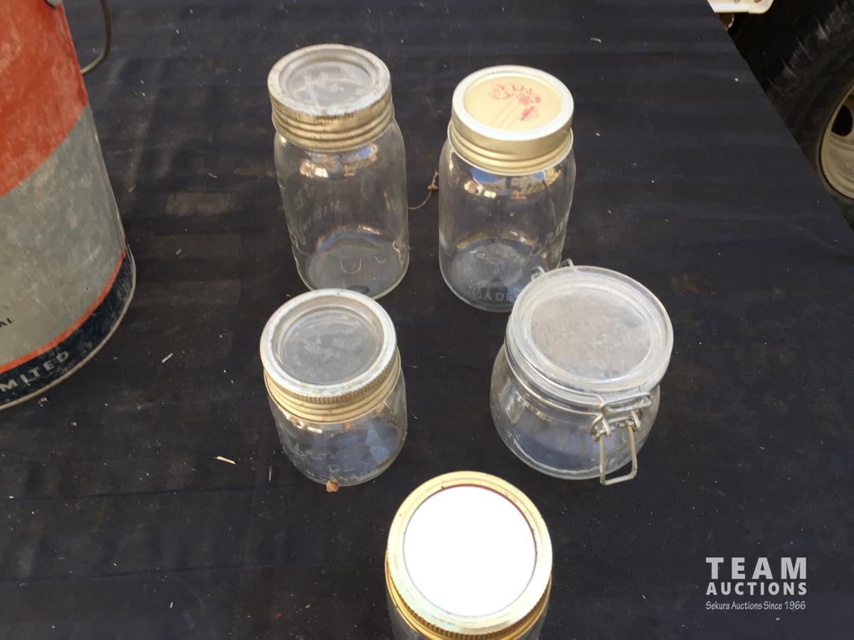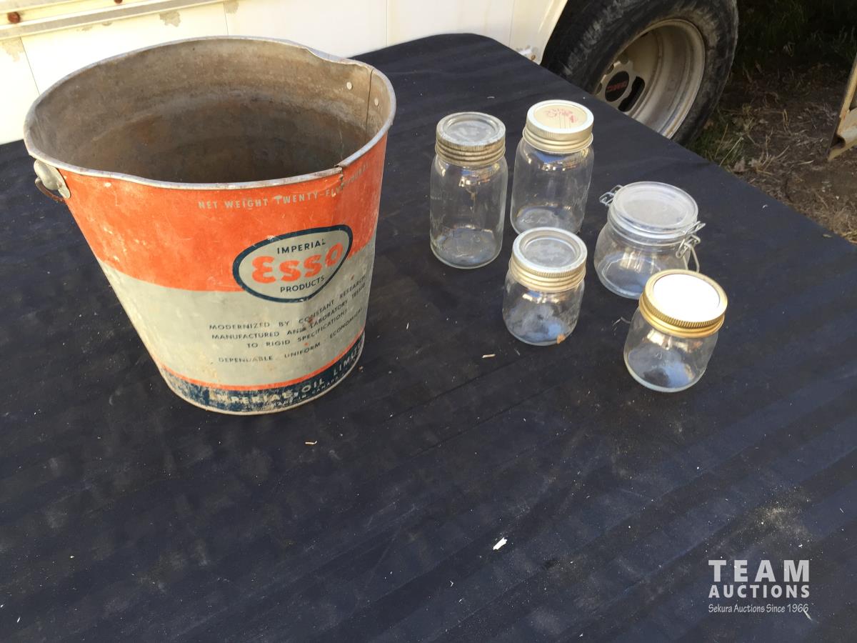 1203 (5) Glass Jars & Esso Bucket
