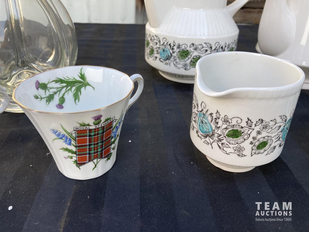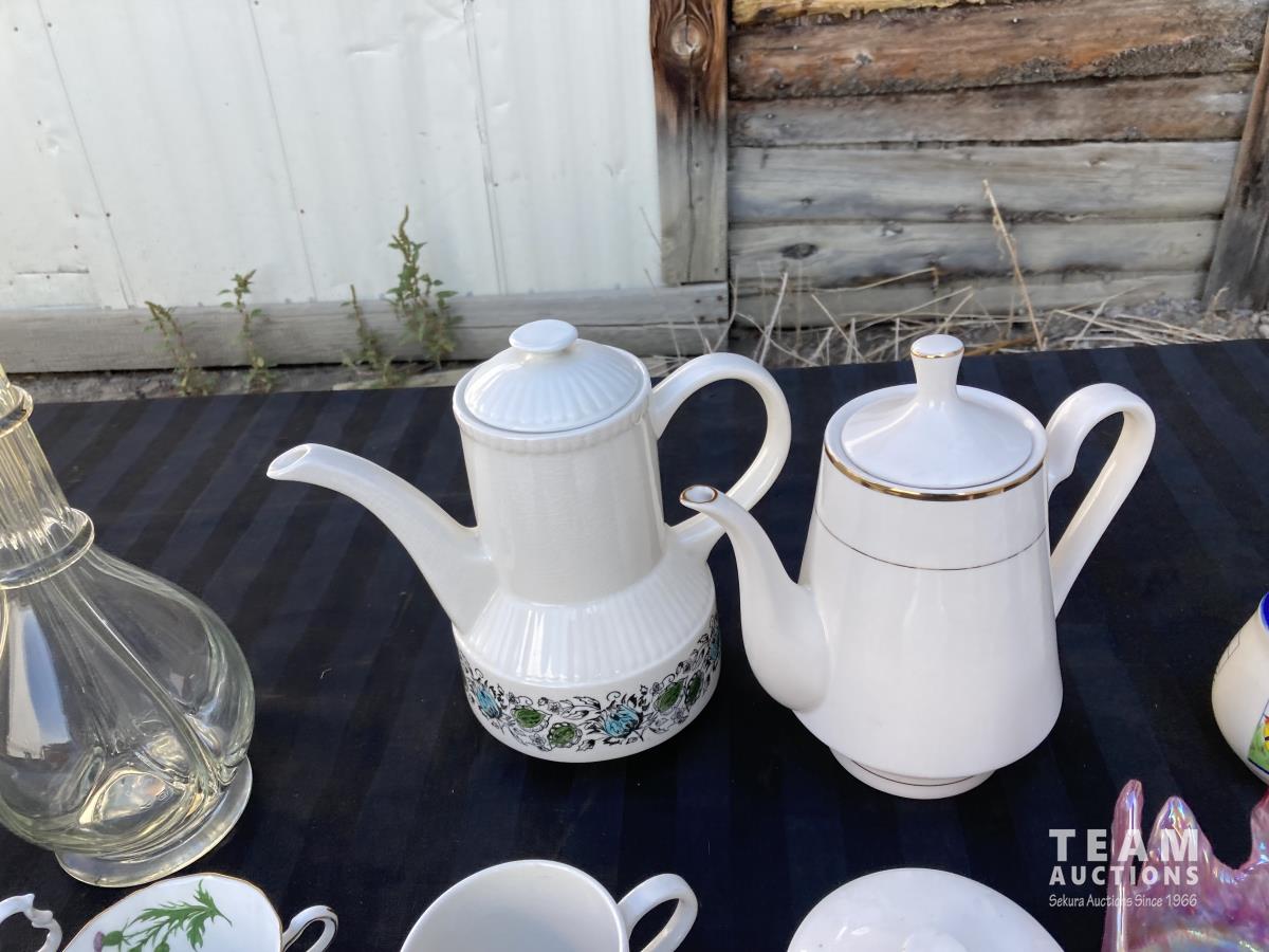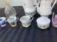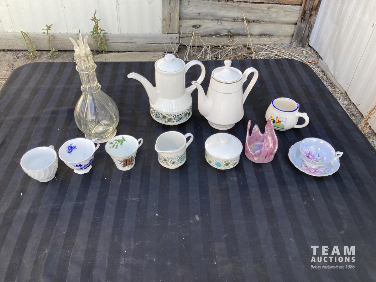 1702 (6) Mugs, (2) Tea Pots & 4 Chamber Glass Decanter