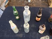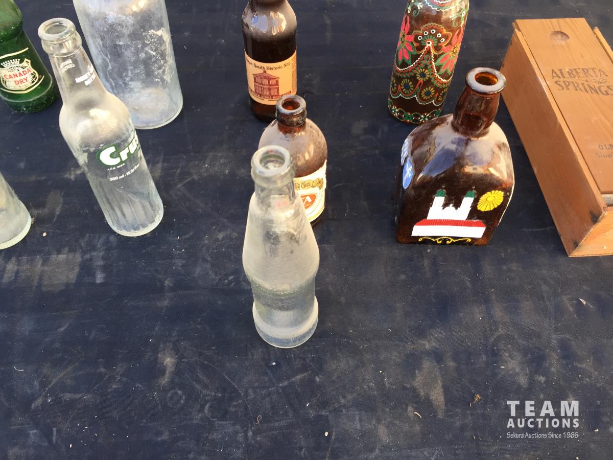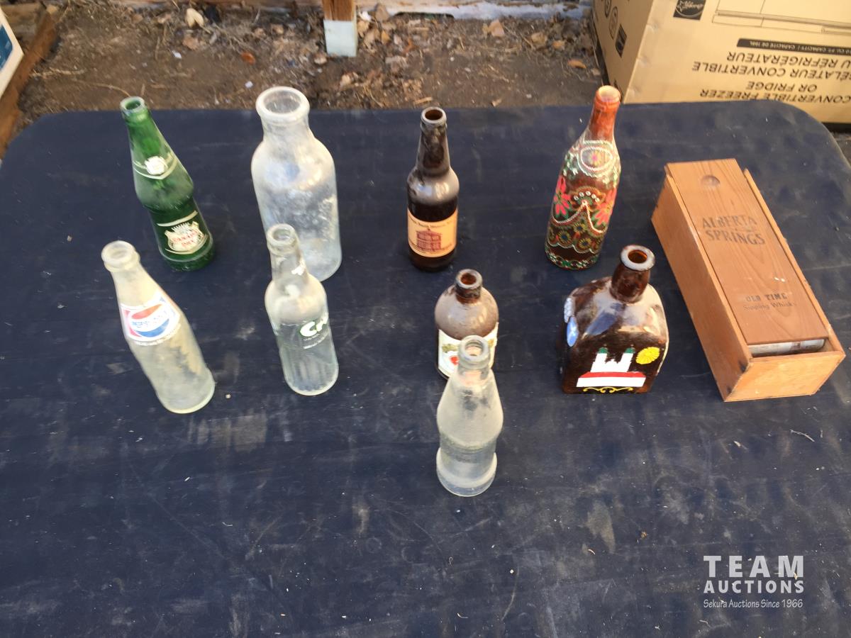 1202 (9) Glass Bottles & Wooden Bottle Box