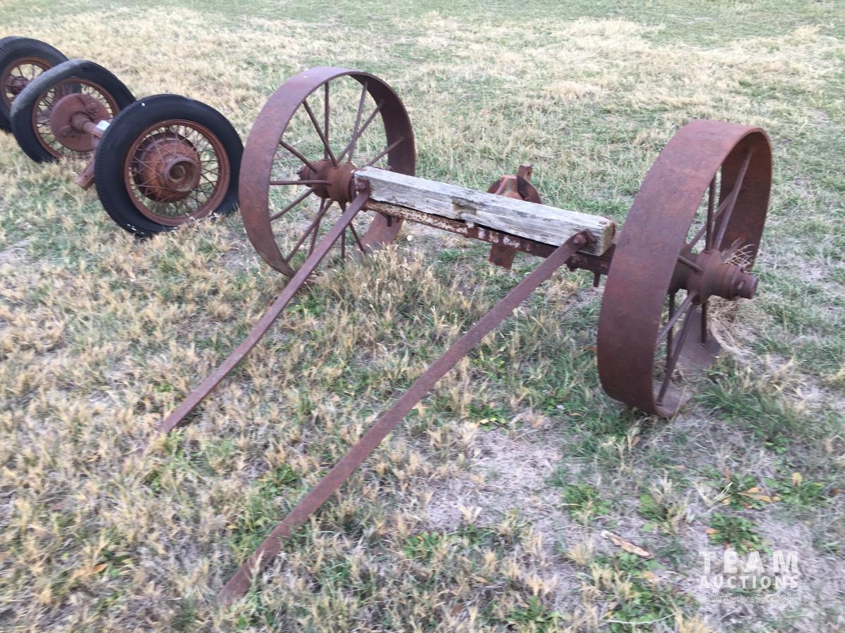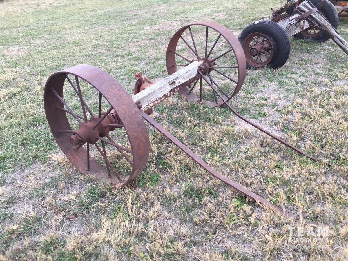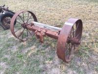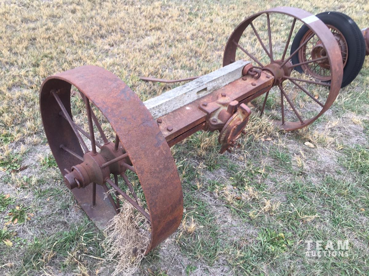 2098 Antique Wooden Wagon Axle w/ Metal Wheels