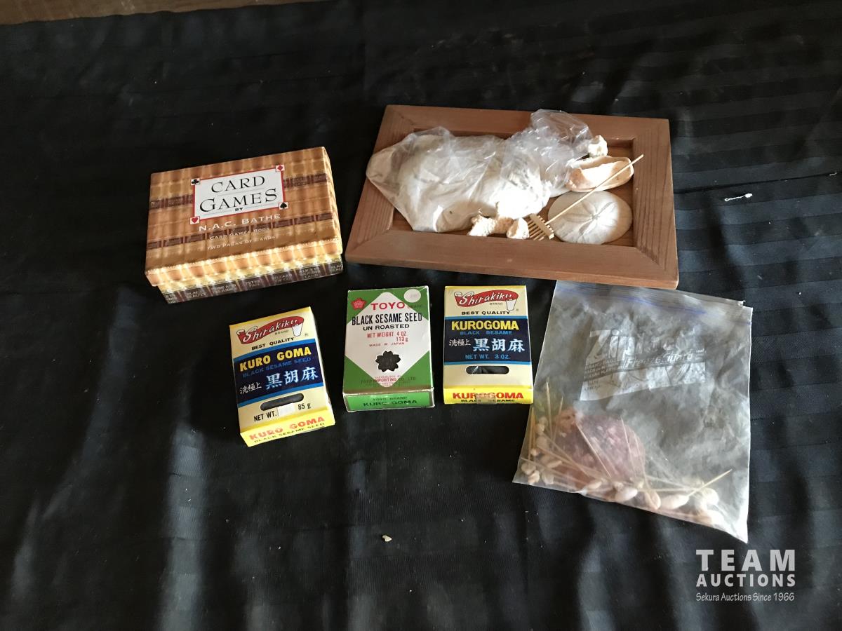 2198 Box of Card Games W/ (3) Boxes of Sesame Seeds & Feng Shui Zen Garden w/ Sea Shells