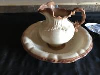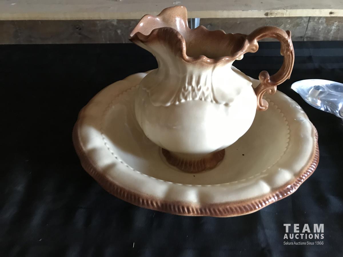 1661 Porcelain Pitcher w/ Plate, Glass Basket & Glass Bowl