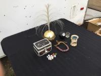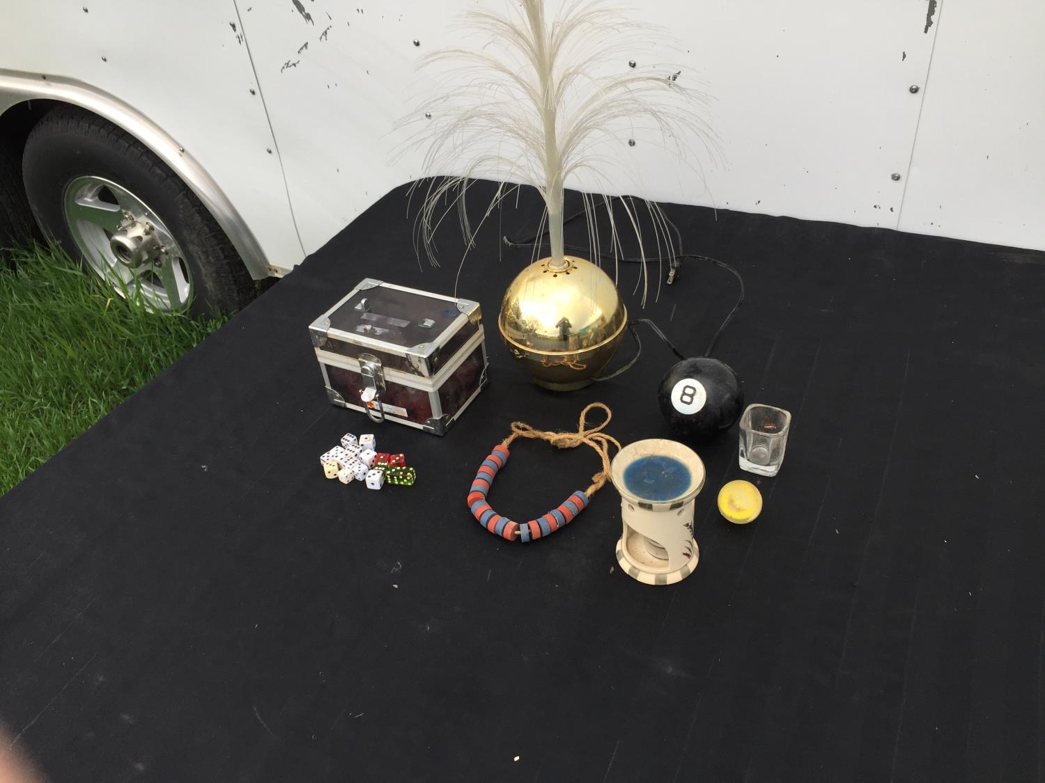 fiberoptic lamp, magic 8 ball, dice, shot glass, bead necklace, candle, jewelry box