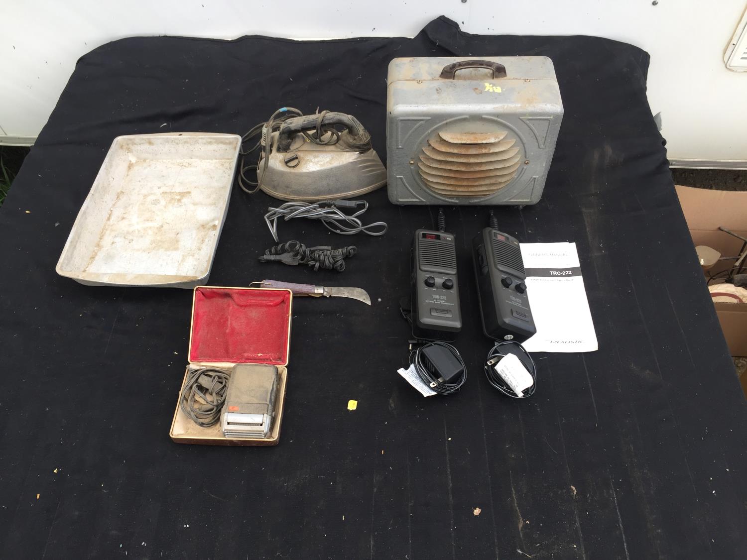 Razor, iron, space heater, tray, knife, handheld radios