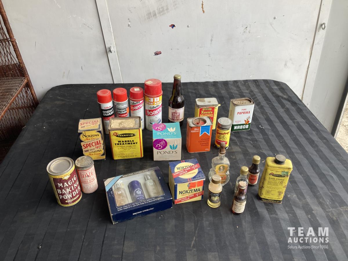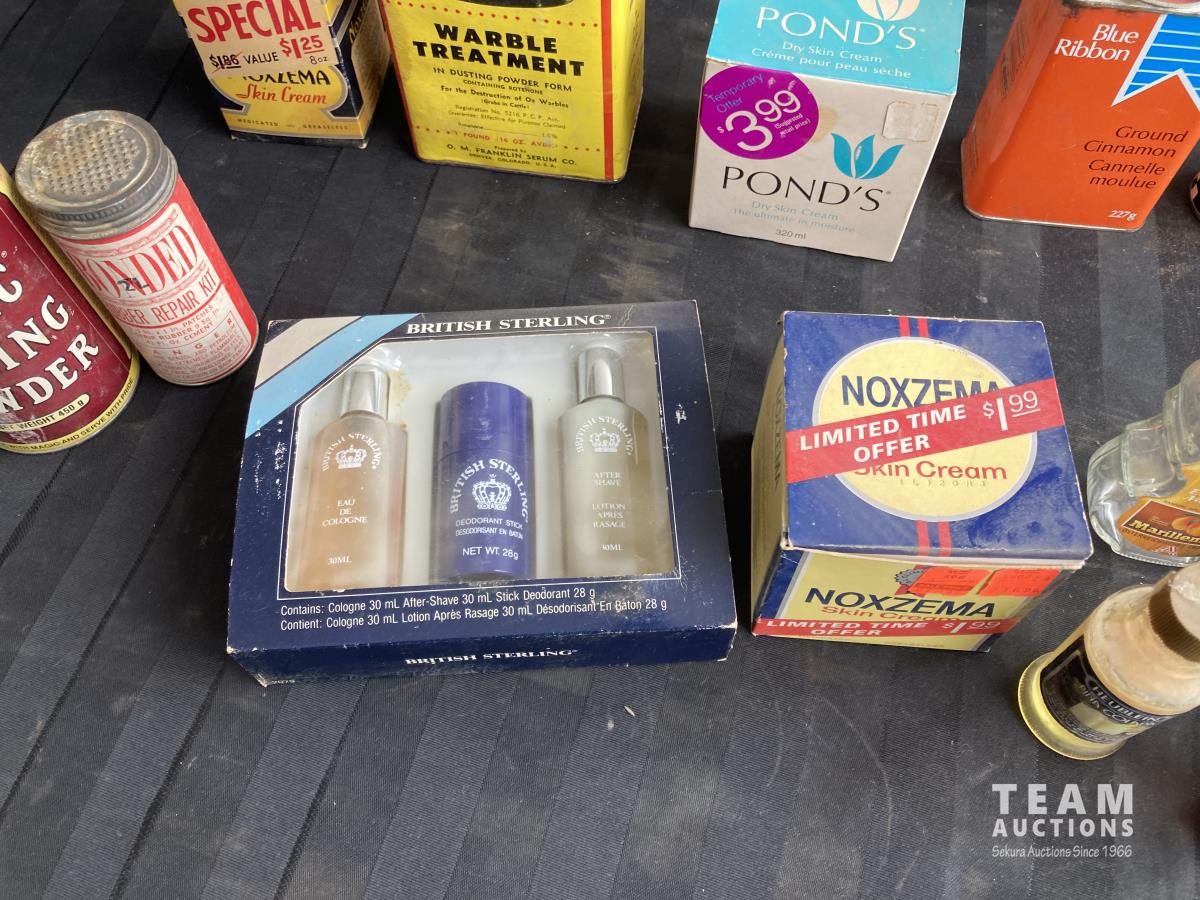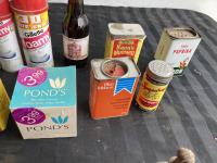 Cologne, shaving cream, tins