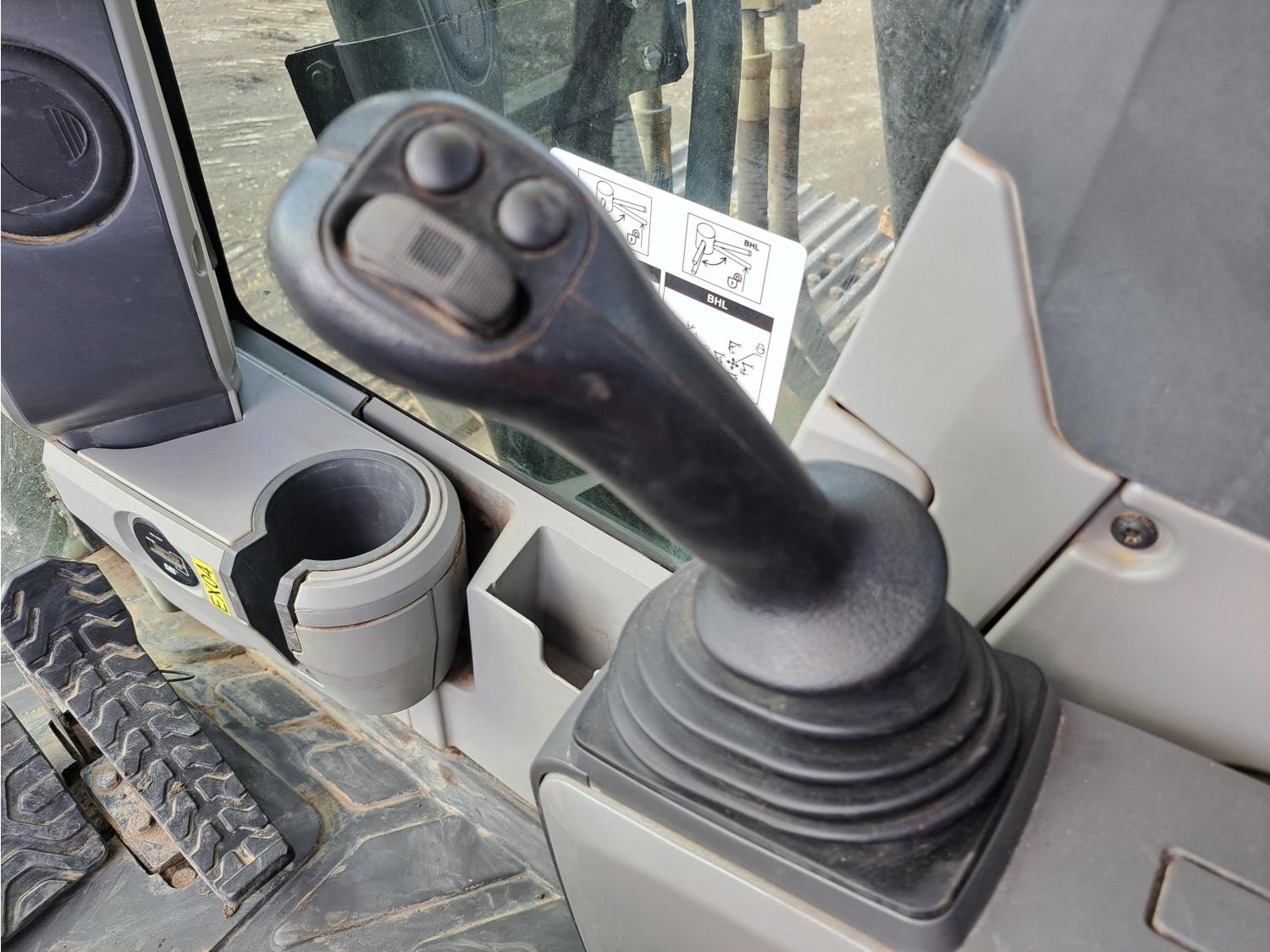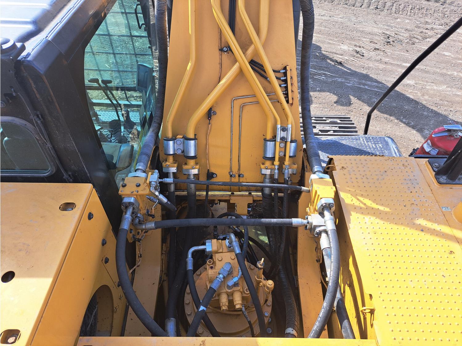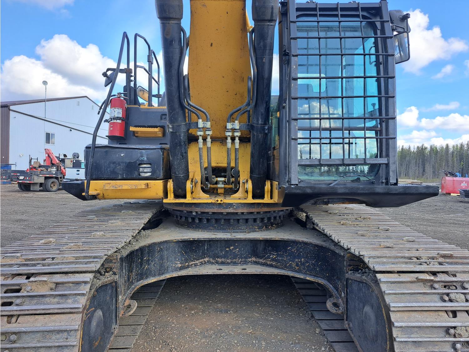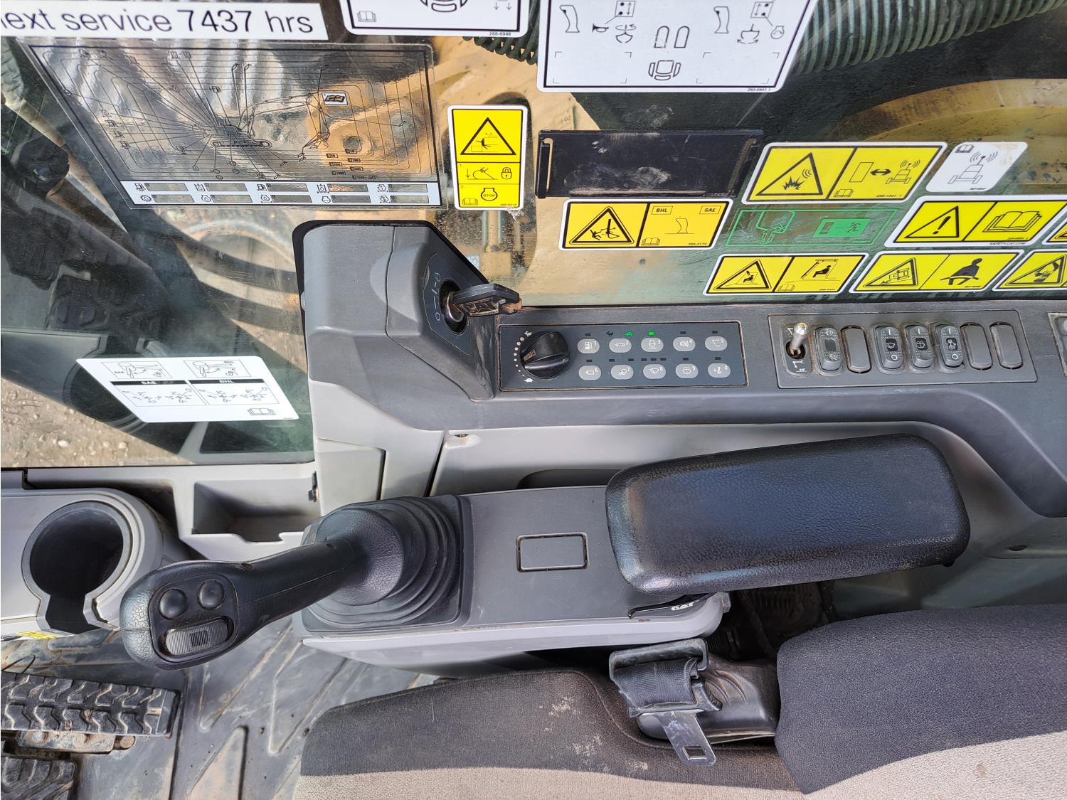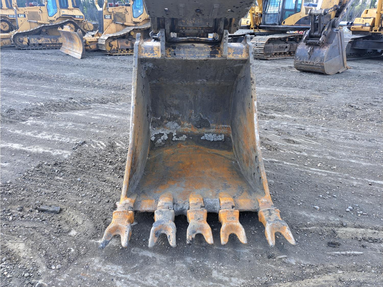 Enclosed cab, A/C, air ride seat, rear view cameras, 48 inch dig bucket, hydraulic thumb, 12 Ft 10 inch stick, catwalks, aux hydraulics, 34 inch track pads, triple grousers