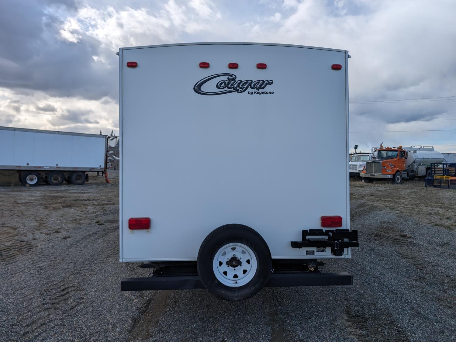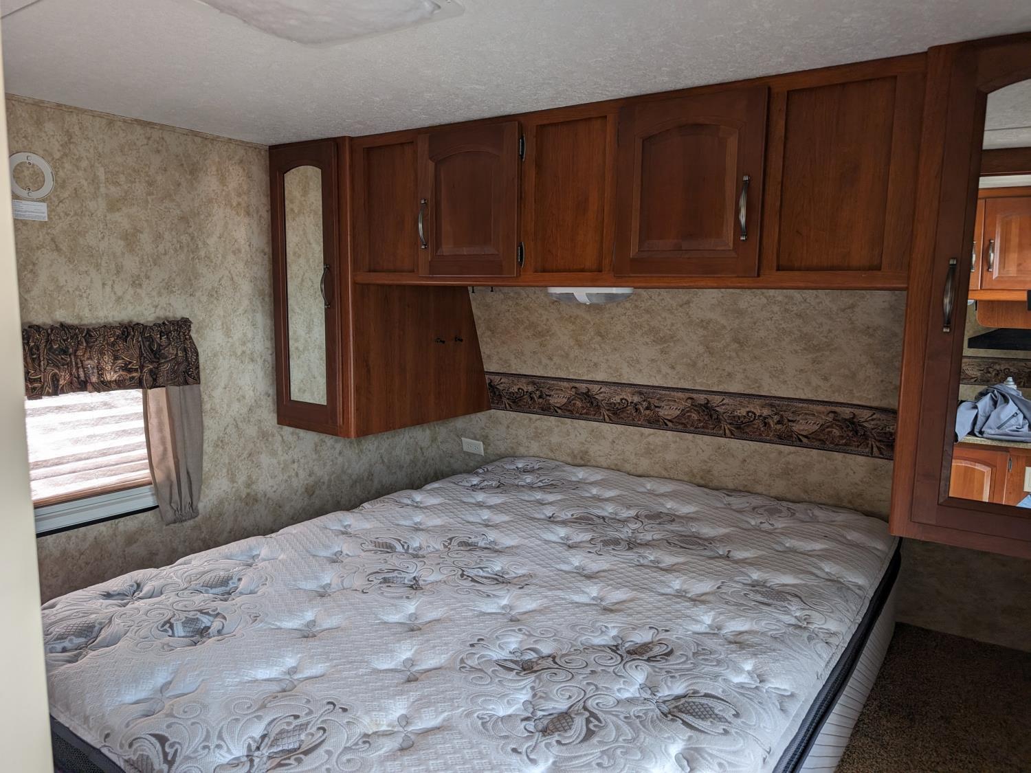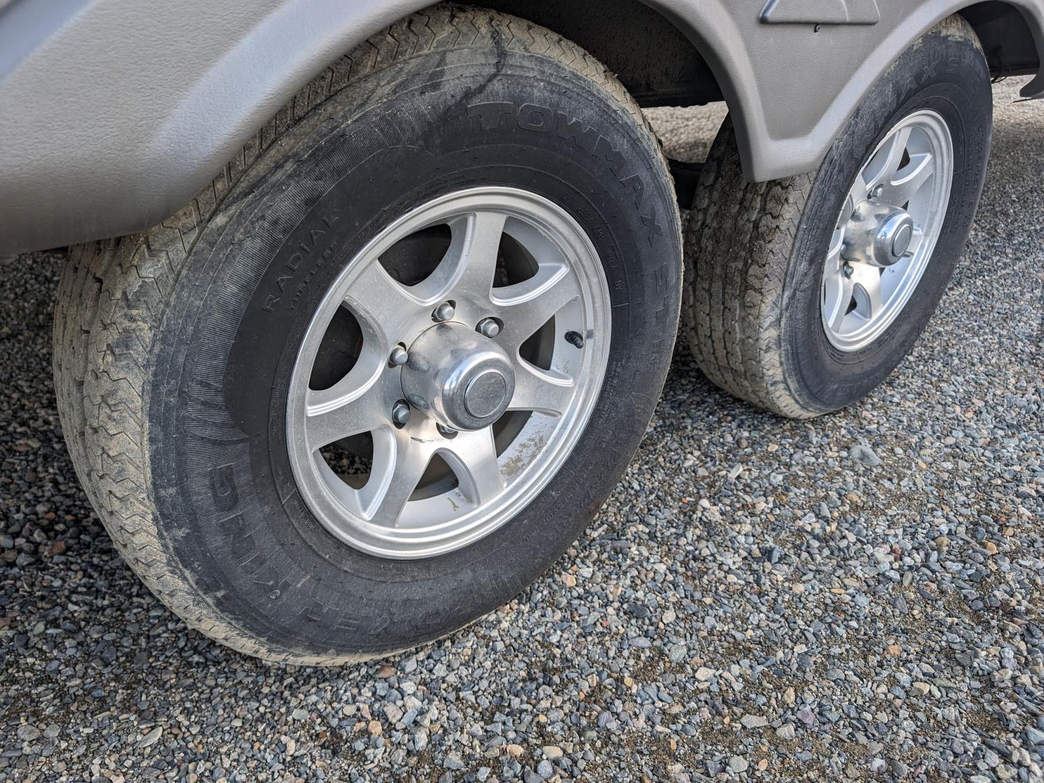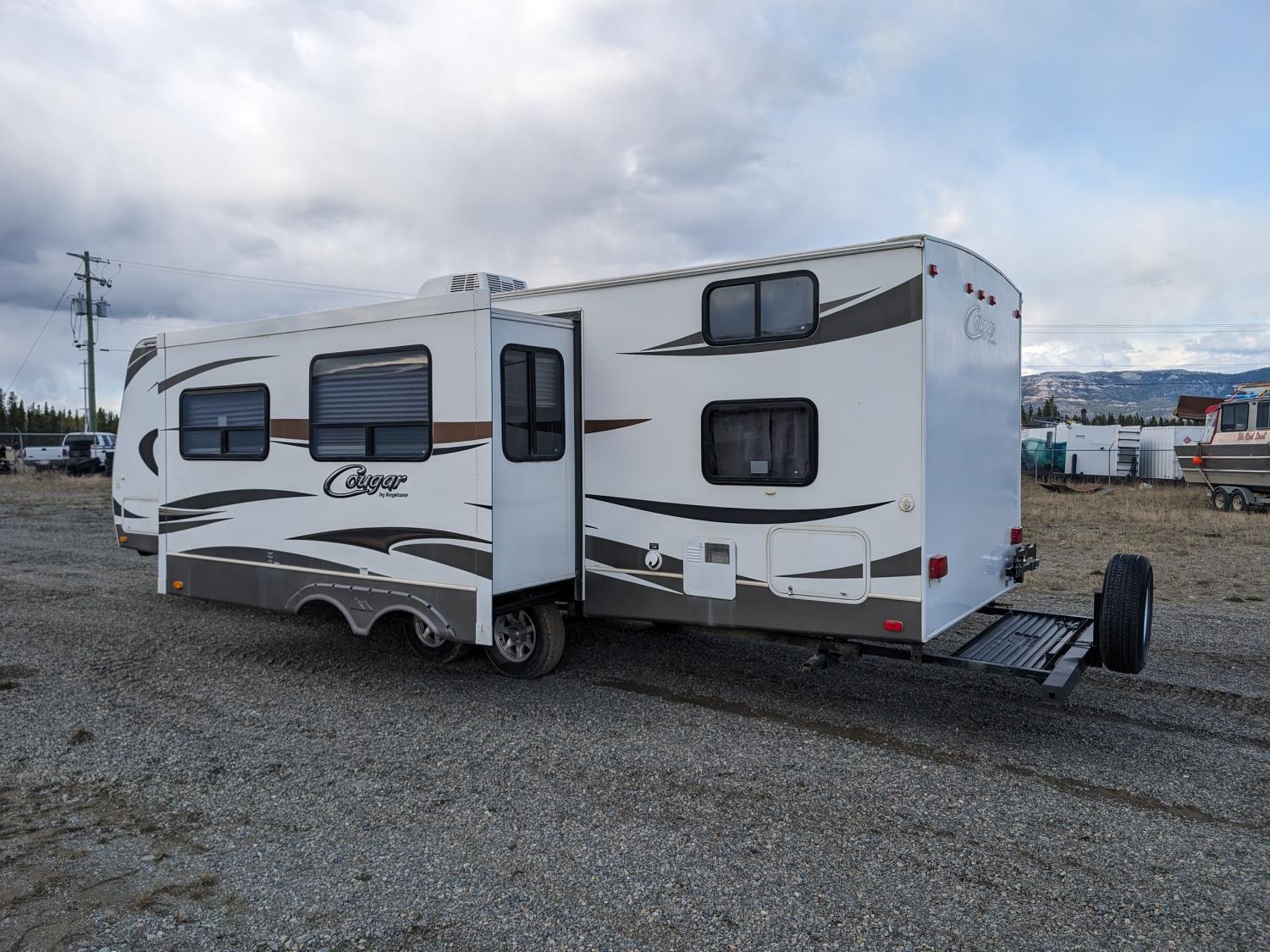 Sleeps 8, stove, fridge, microwave, full bath, master bedroom, bunk beds, A/C, outdoor shower, 1 slide, power awning, spring suspension, electric brakes, rear bike rack, 225/75R15 tires