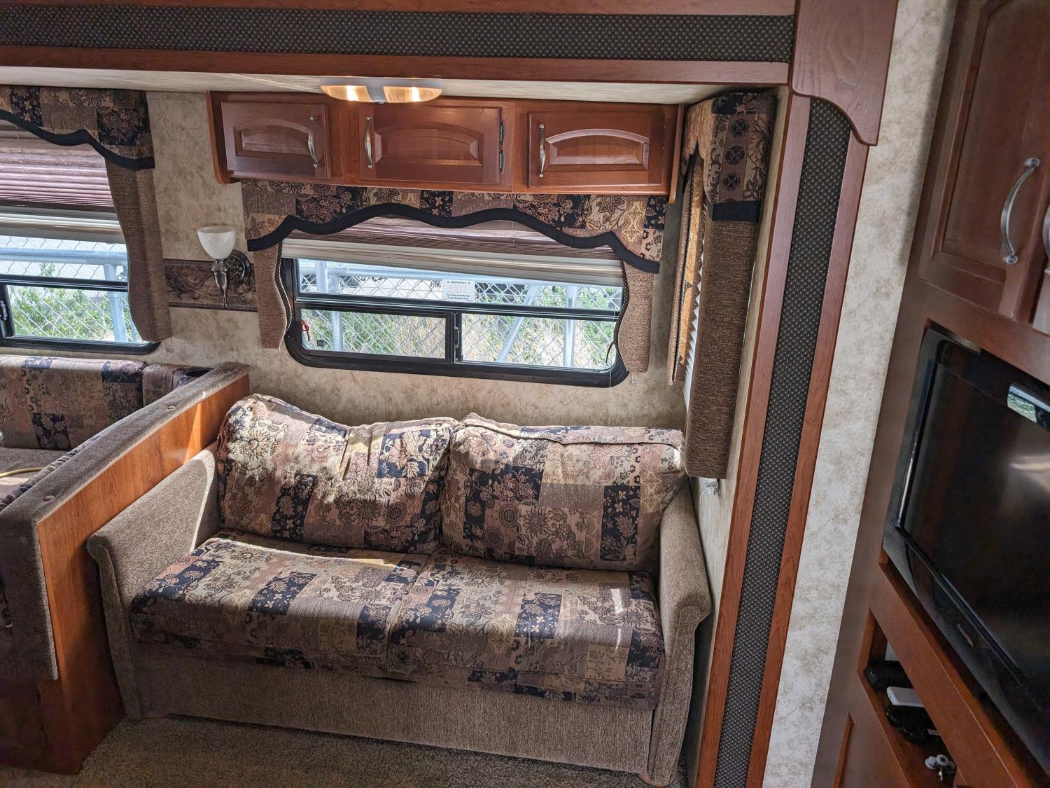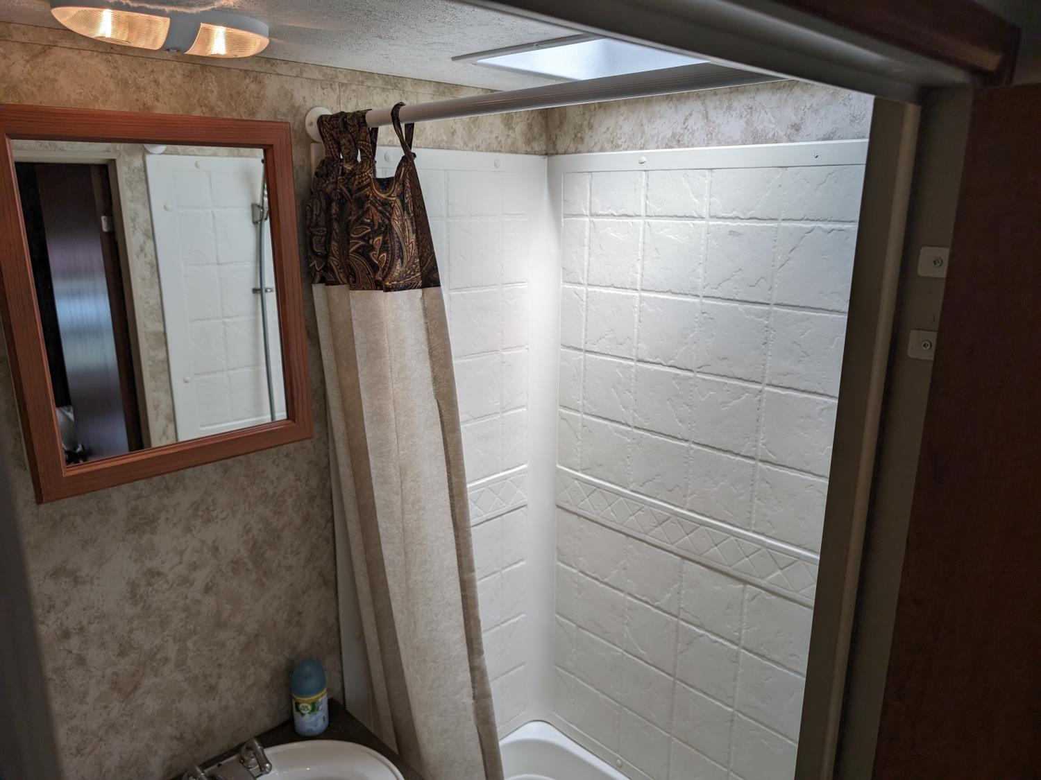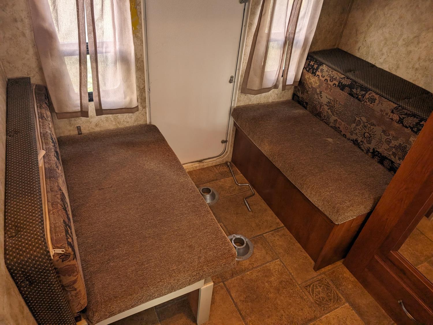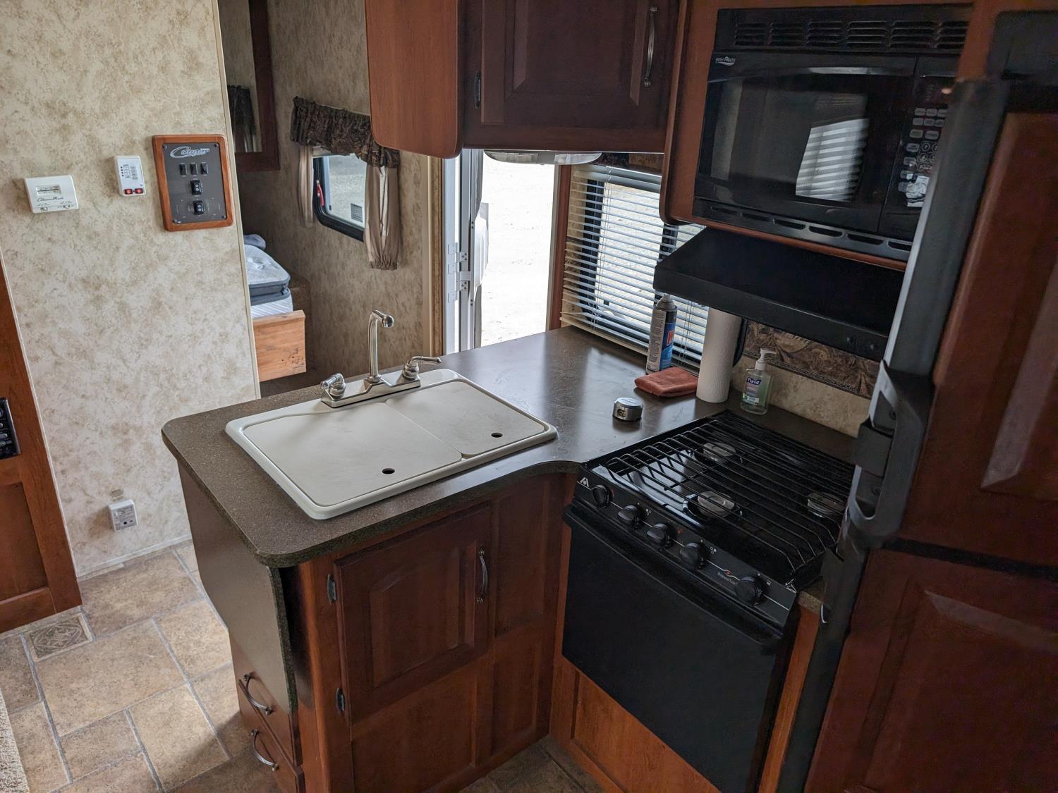 Sleeps 8, stove, fridge, microwave, full bath, master bedroom, bunk beds, A/C, outdoor shower, 1 slide, power awning, spring suspension, electric brakes, rear bike rack, 225/75R15 tires
