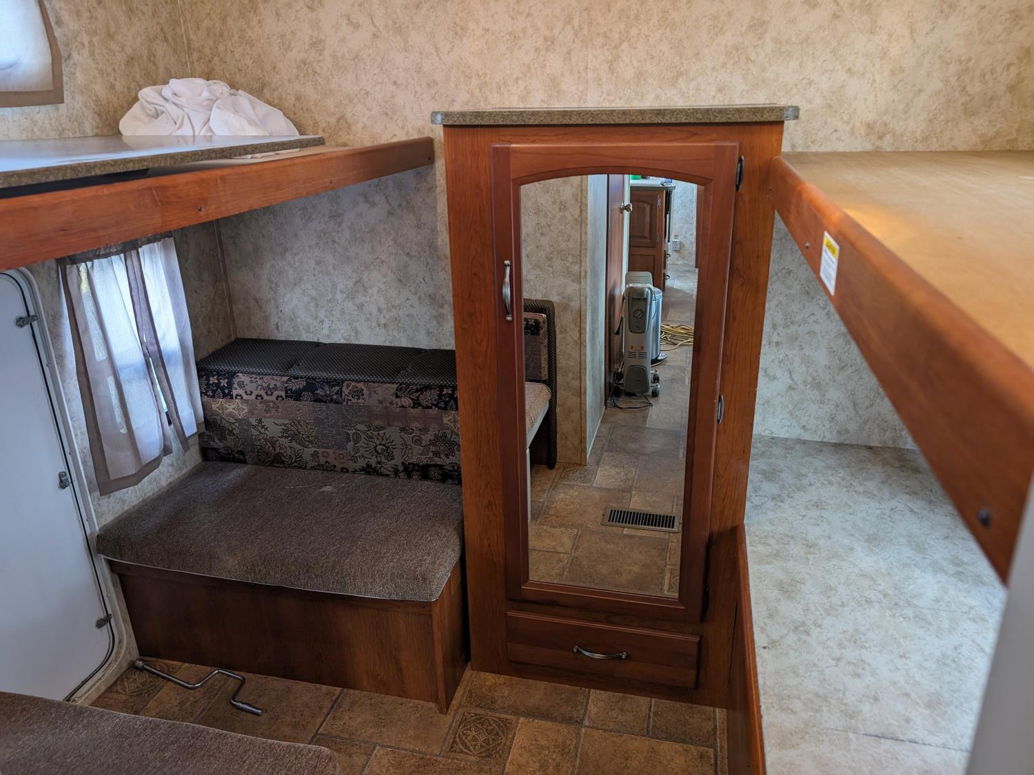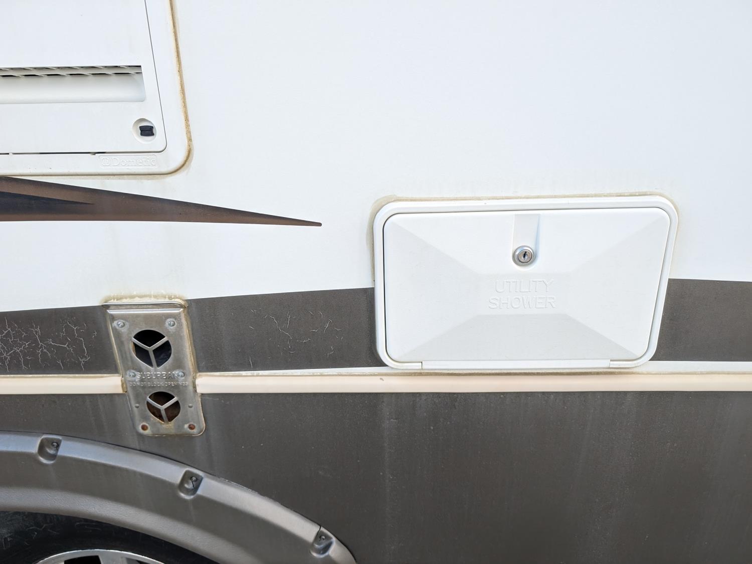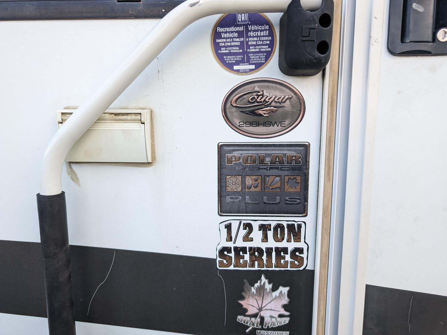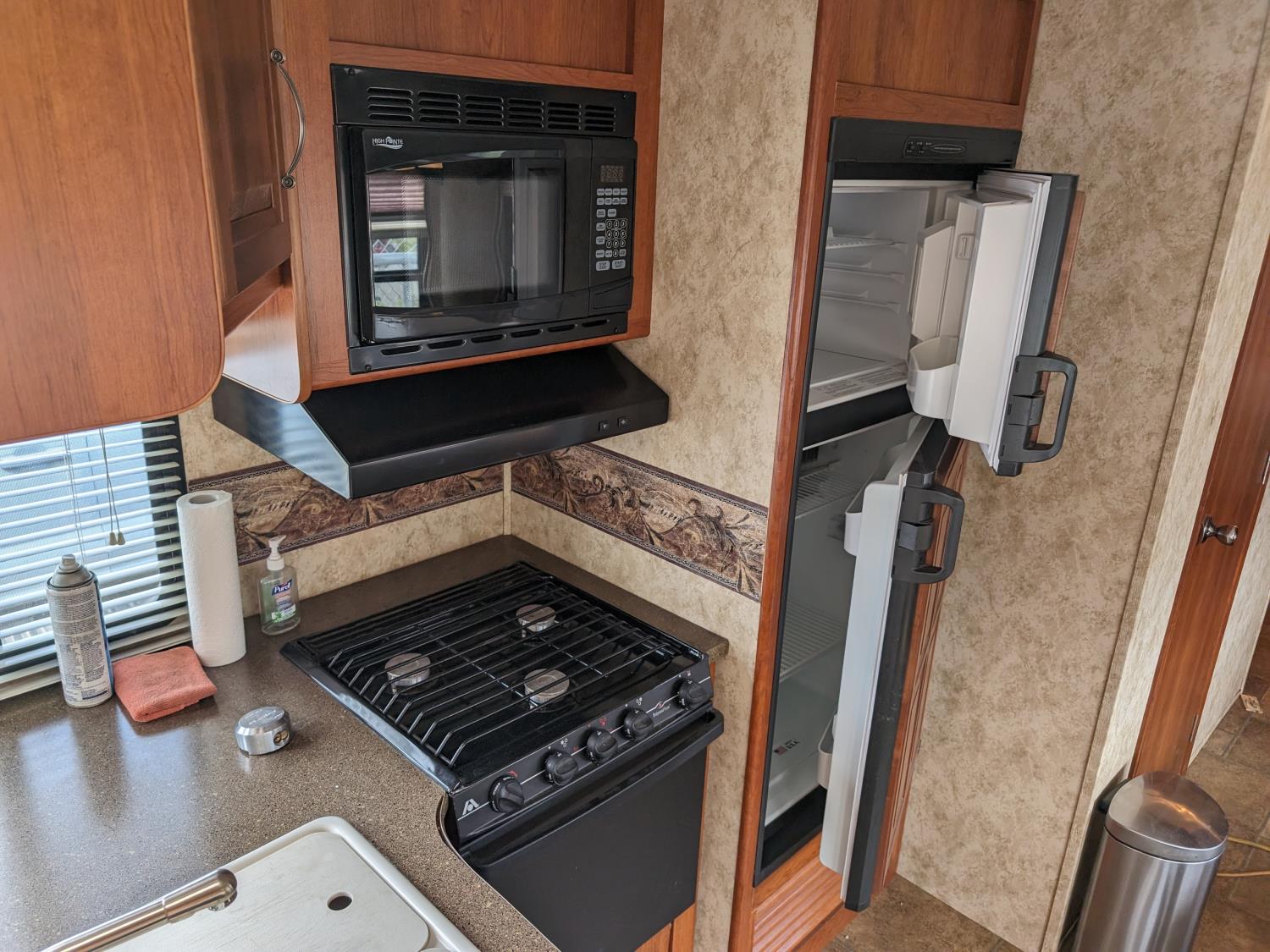 Sleeps 8, stove, fridge, microwave, full bath, master bedroom, bunk beds, A/C, outdoor shower, 1 slide, power awning, spring suspension, electric brakes, rear bike rack, 225/75R15 tires
