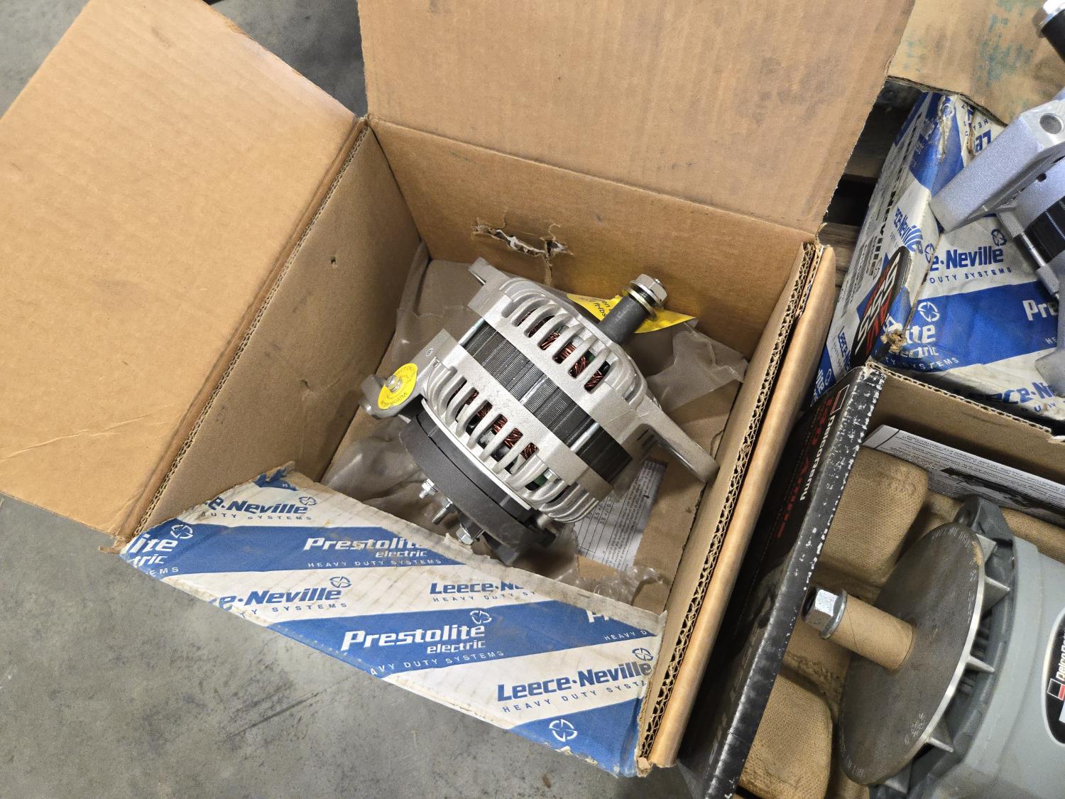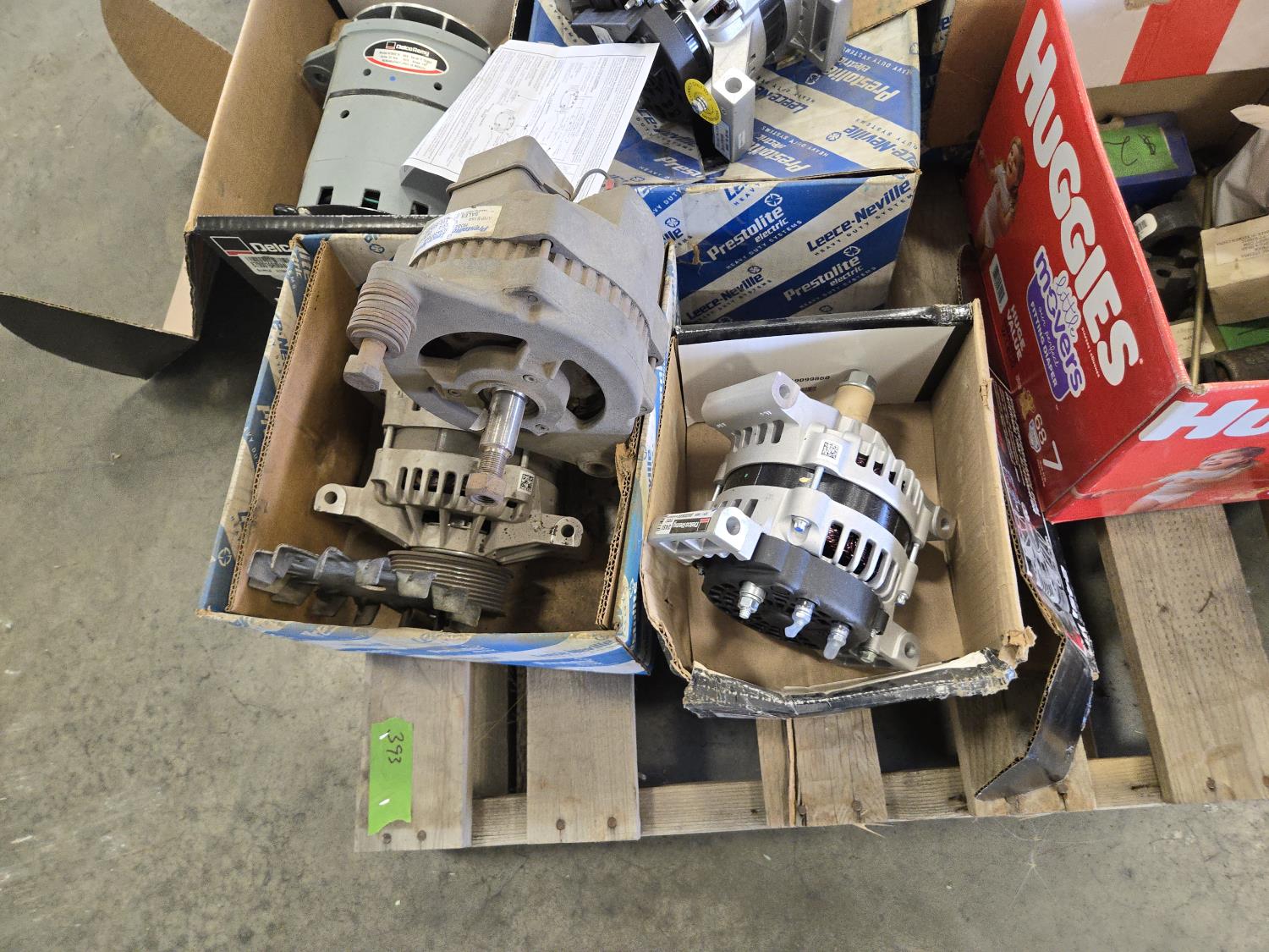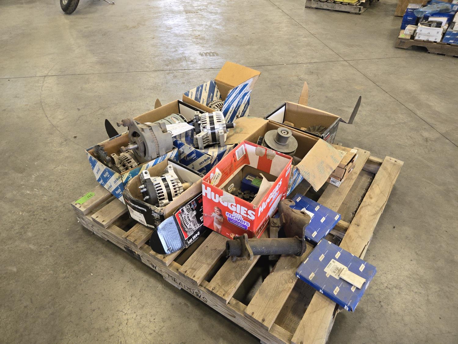 (4) unused alternators, (3) used alternators, fans, miscellaneous parts