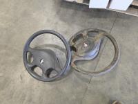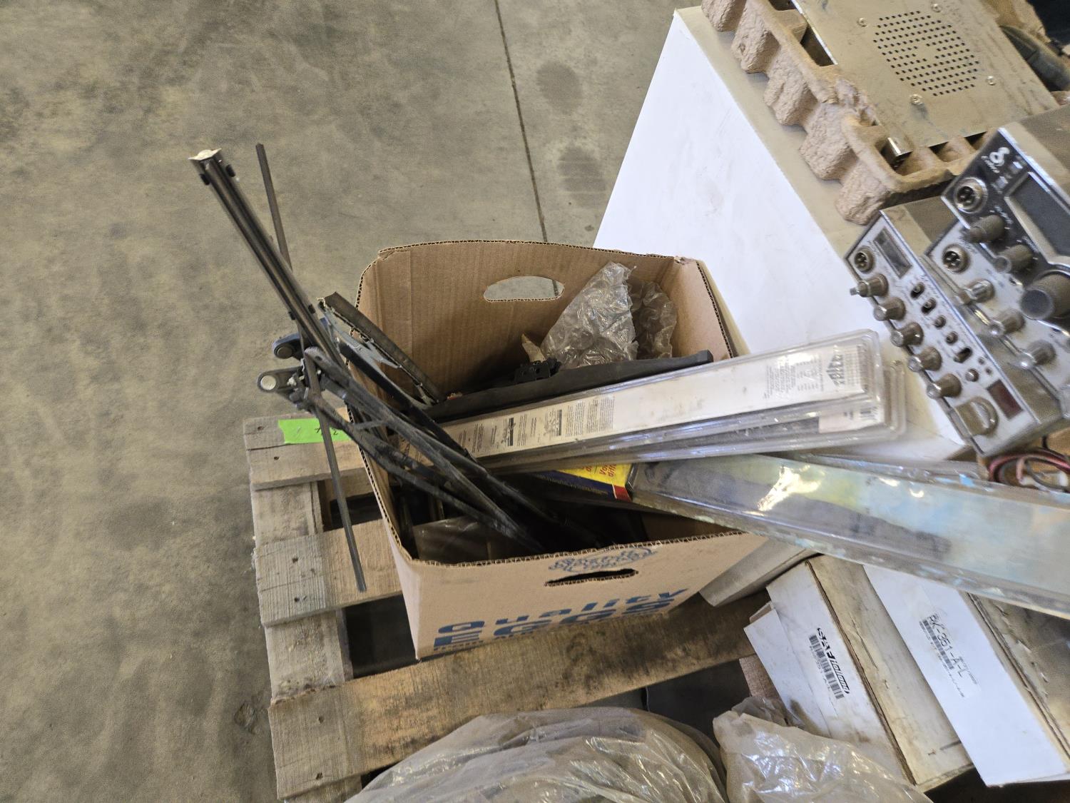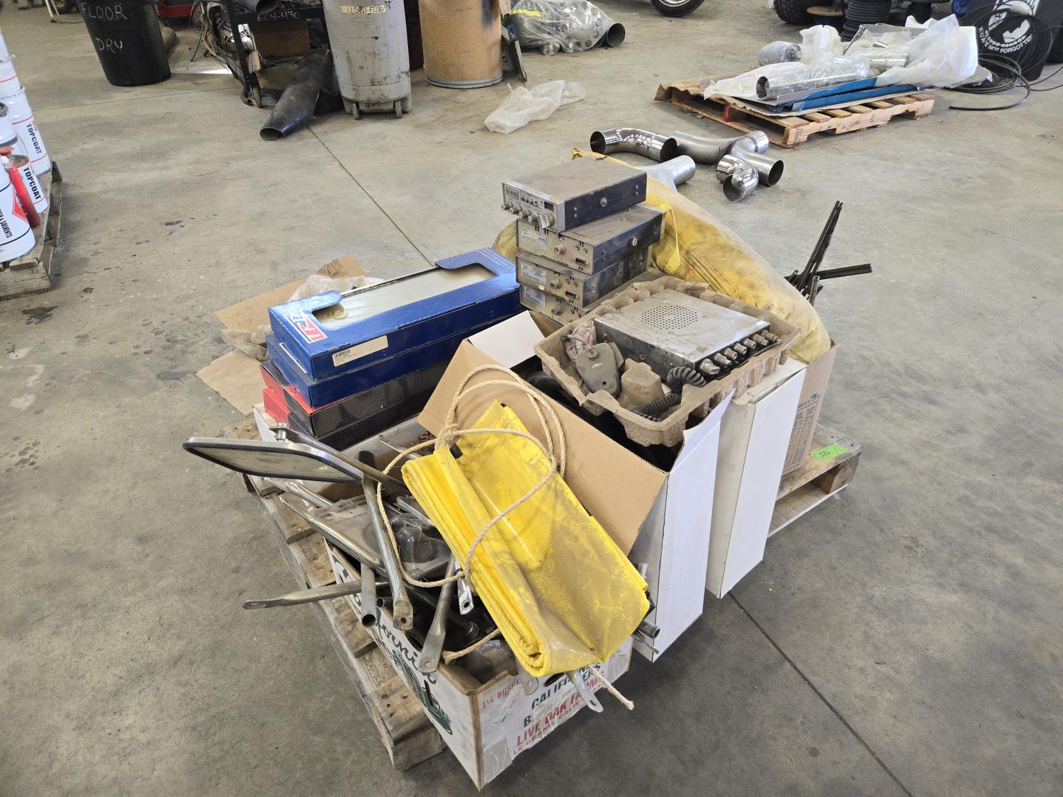 (5) 2 way radios, turn signal wiring and hardware, (4) unused truck mirrors, qty of used mirrors, qty of windshield wipers, (3) unused 5TH wheel center pin kits, (2) Kenworth steering wheels, qty of spill kits
