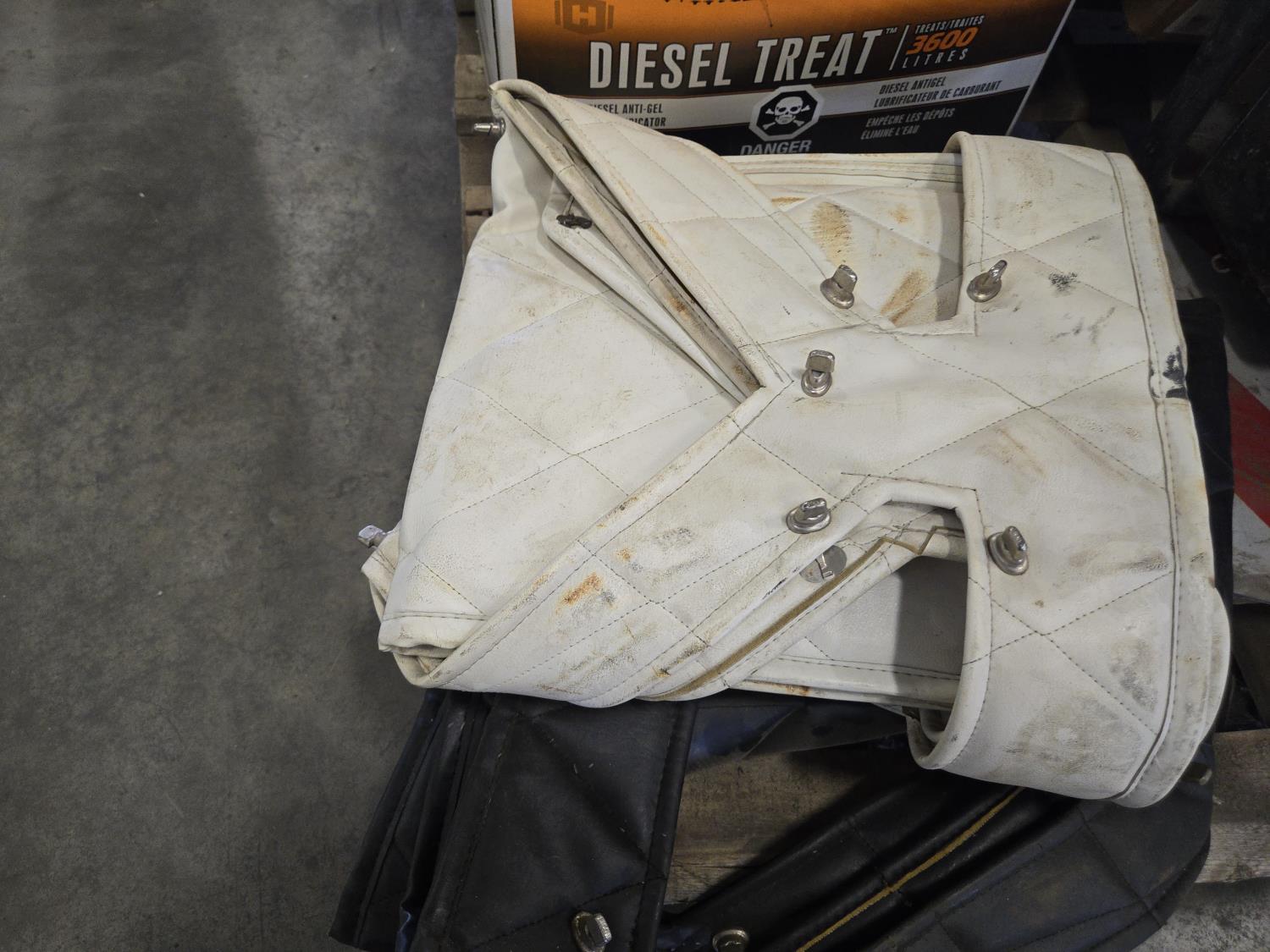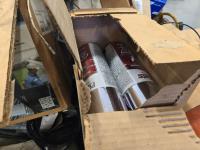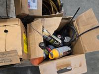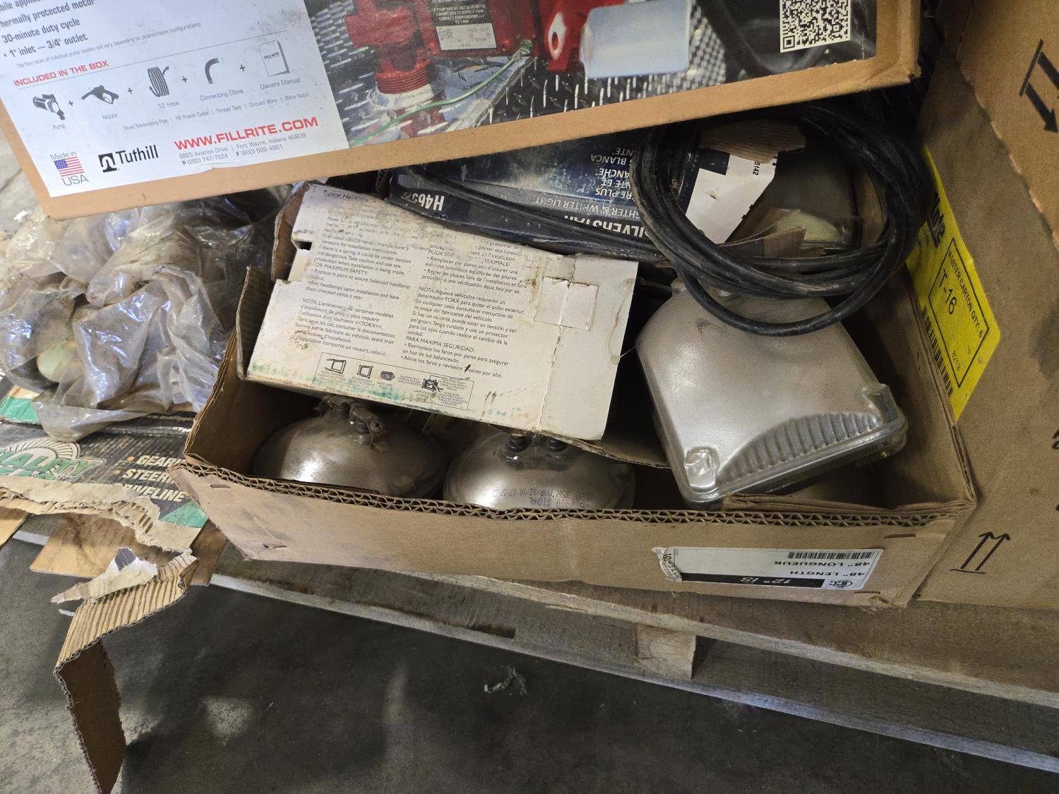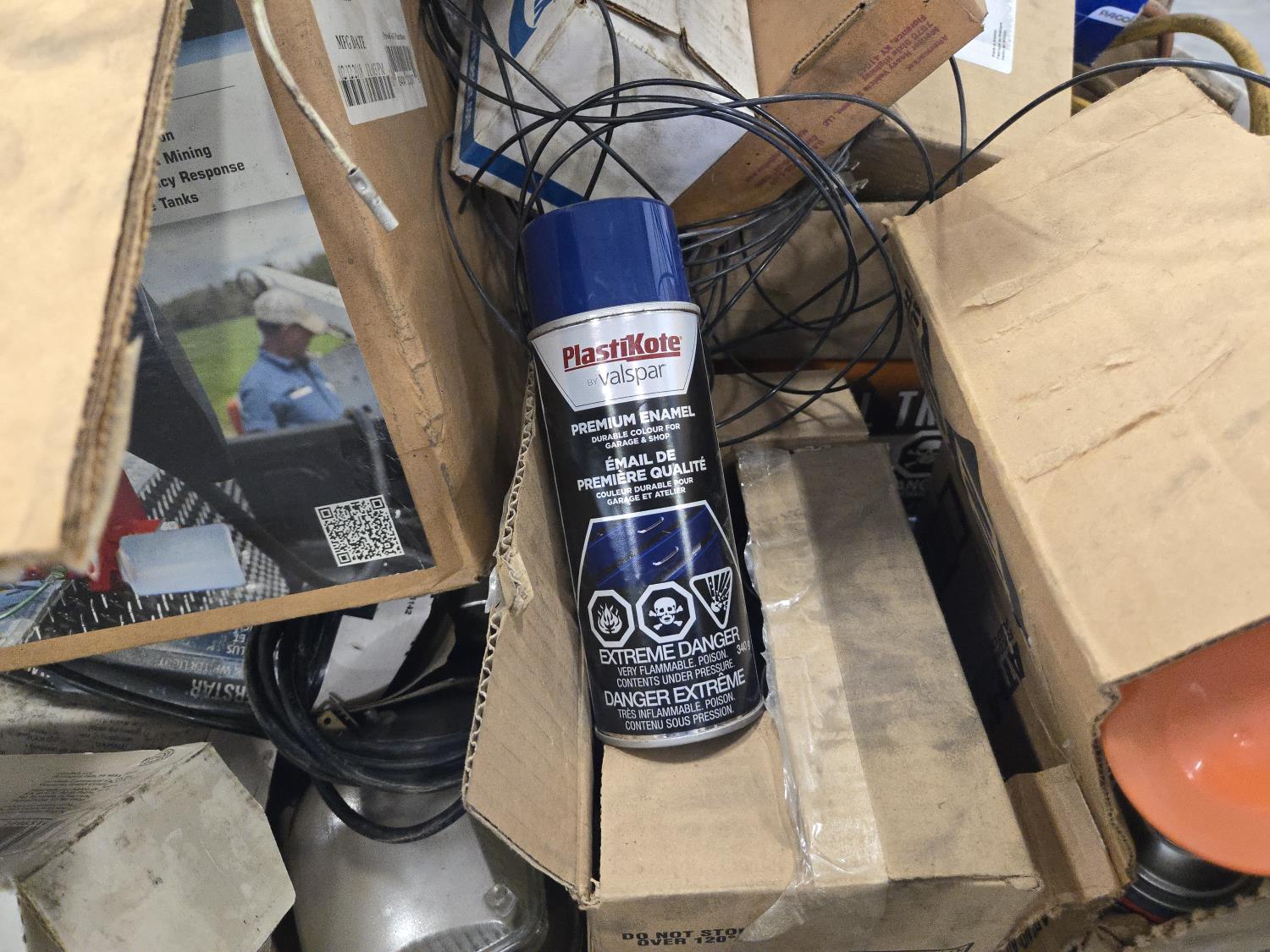 Qty of Spray paint, miscellaneous electrical hardware and lights, (2) heavy truck winter fronts,