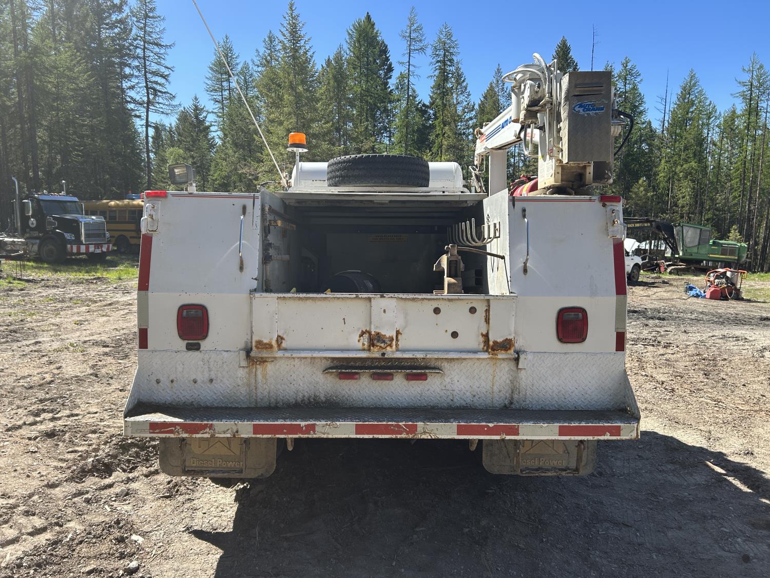 6.0 L V8 diesel engine, manual transmission, A/C, cruise control, Auto Crane 3203 rear mount crane, outriggers, underhood V-mac air compressor