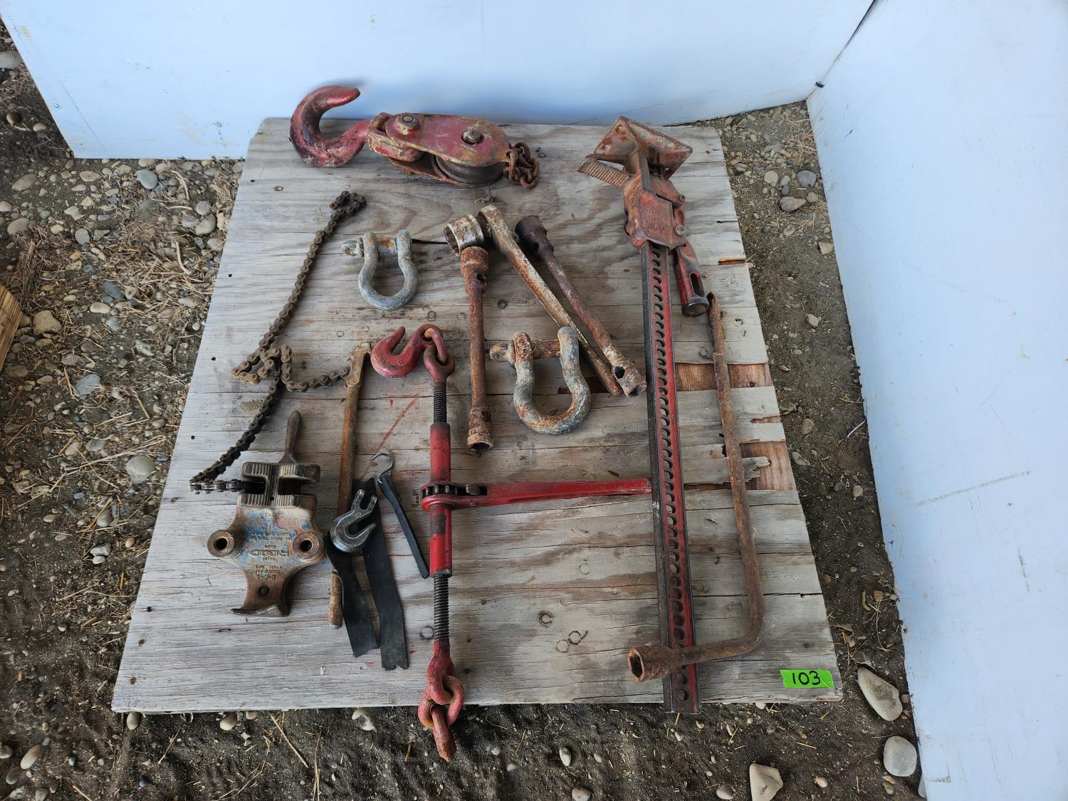 13 Misc Shop Tools, Jackall, Shackles, Chain Vise, Load Binder