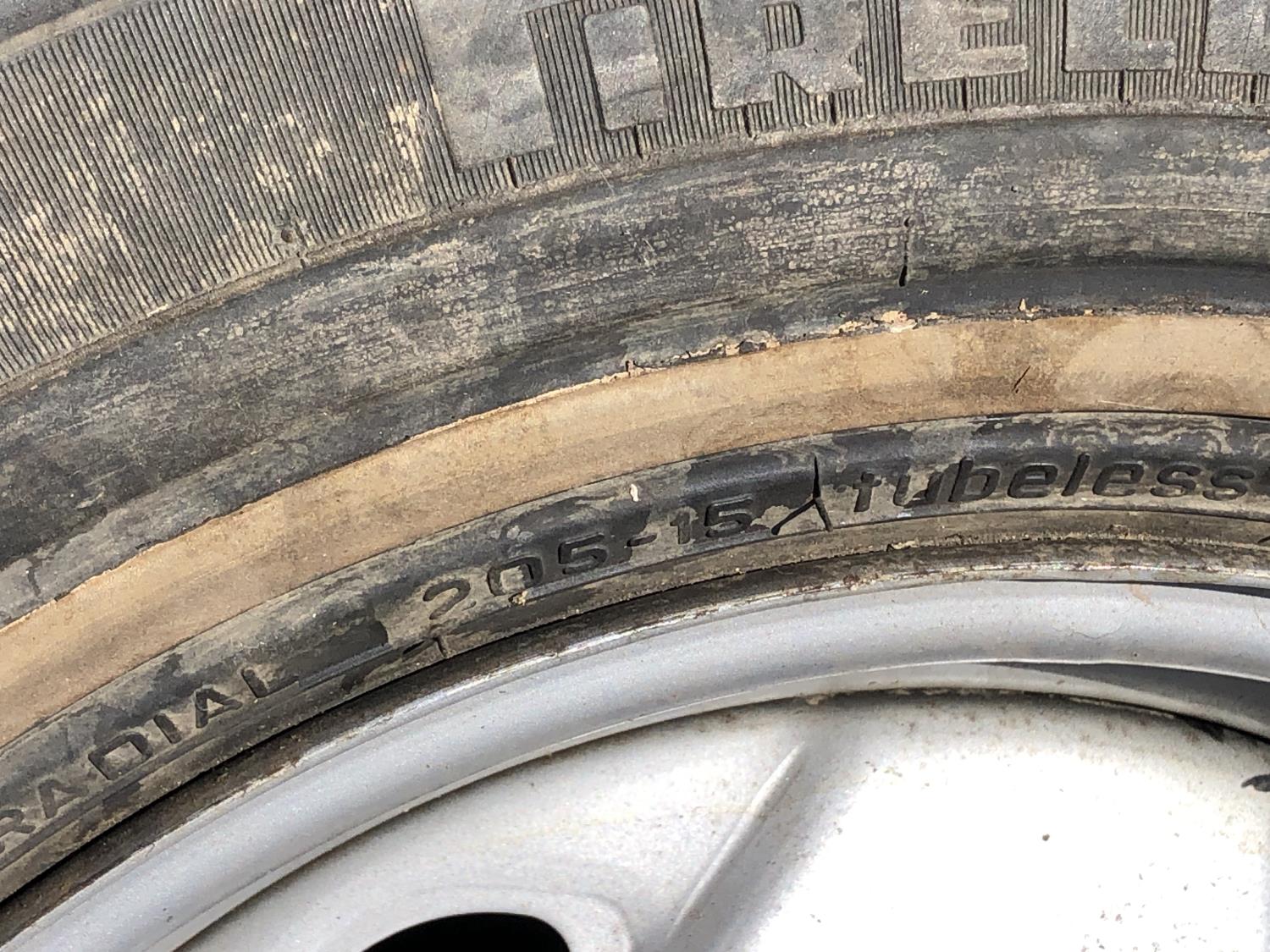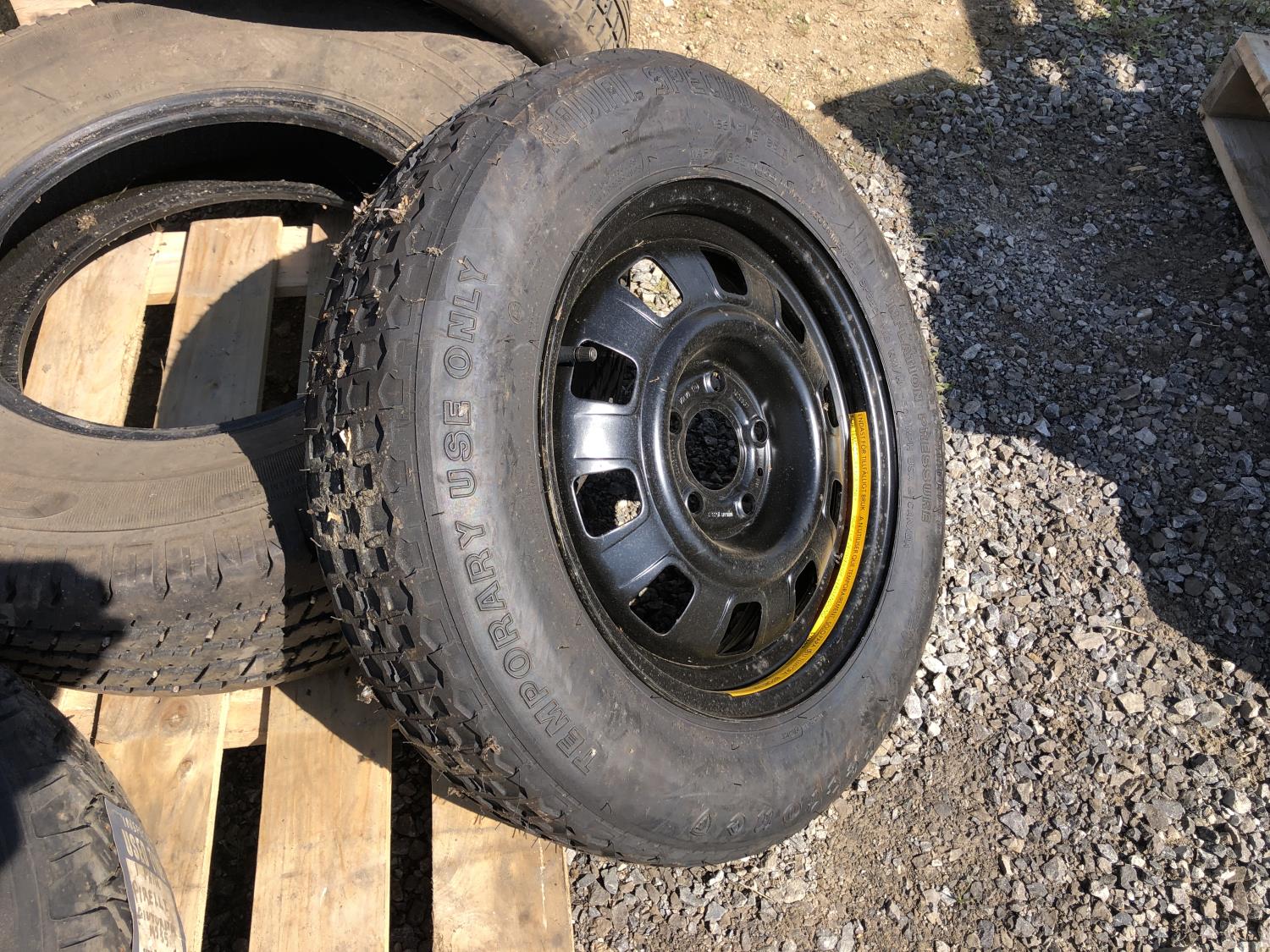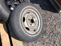 Eco spare 185/80D14 on 4 bolt rim, (1) Eco spare 155/R15 on 5 bolt rim, (1) 155/80R12 tire on 4 bolt rim, (2) 205/15 studded tires on 5 bolt rims, (1) Wrangler 245/75R16 tire