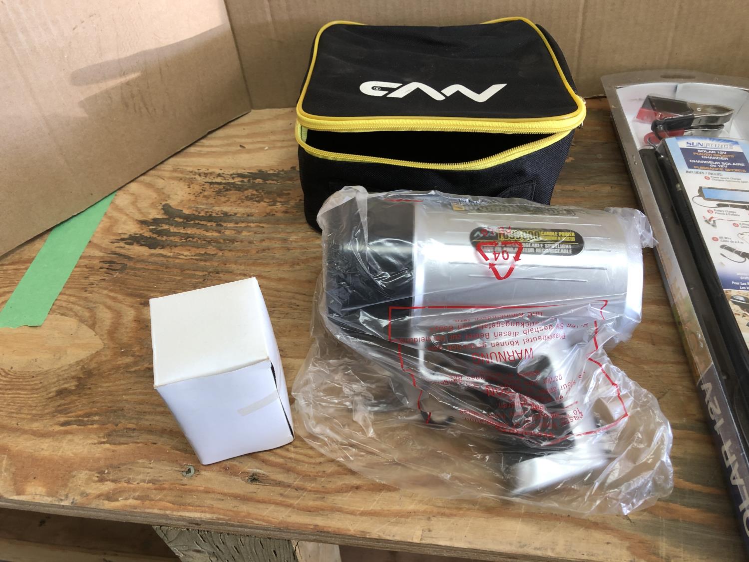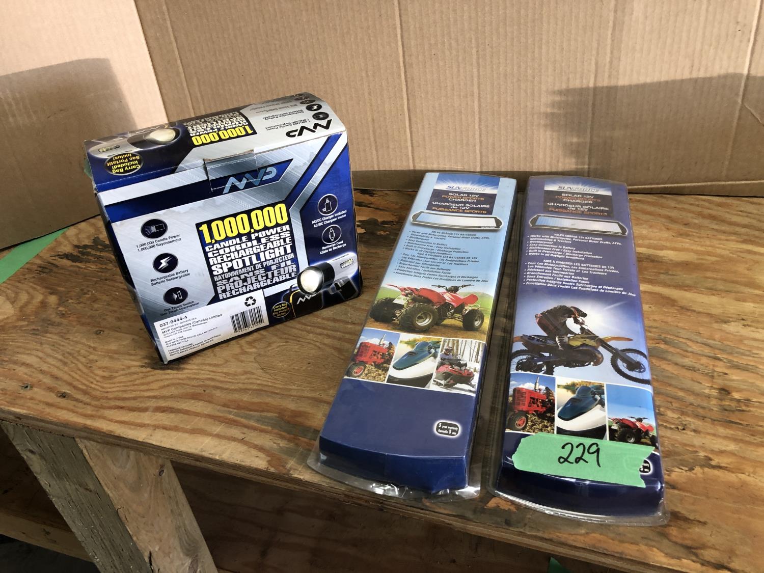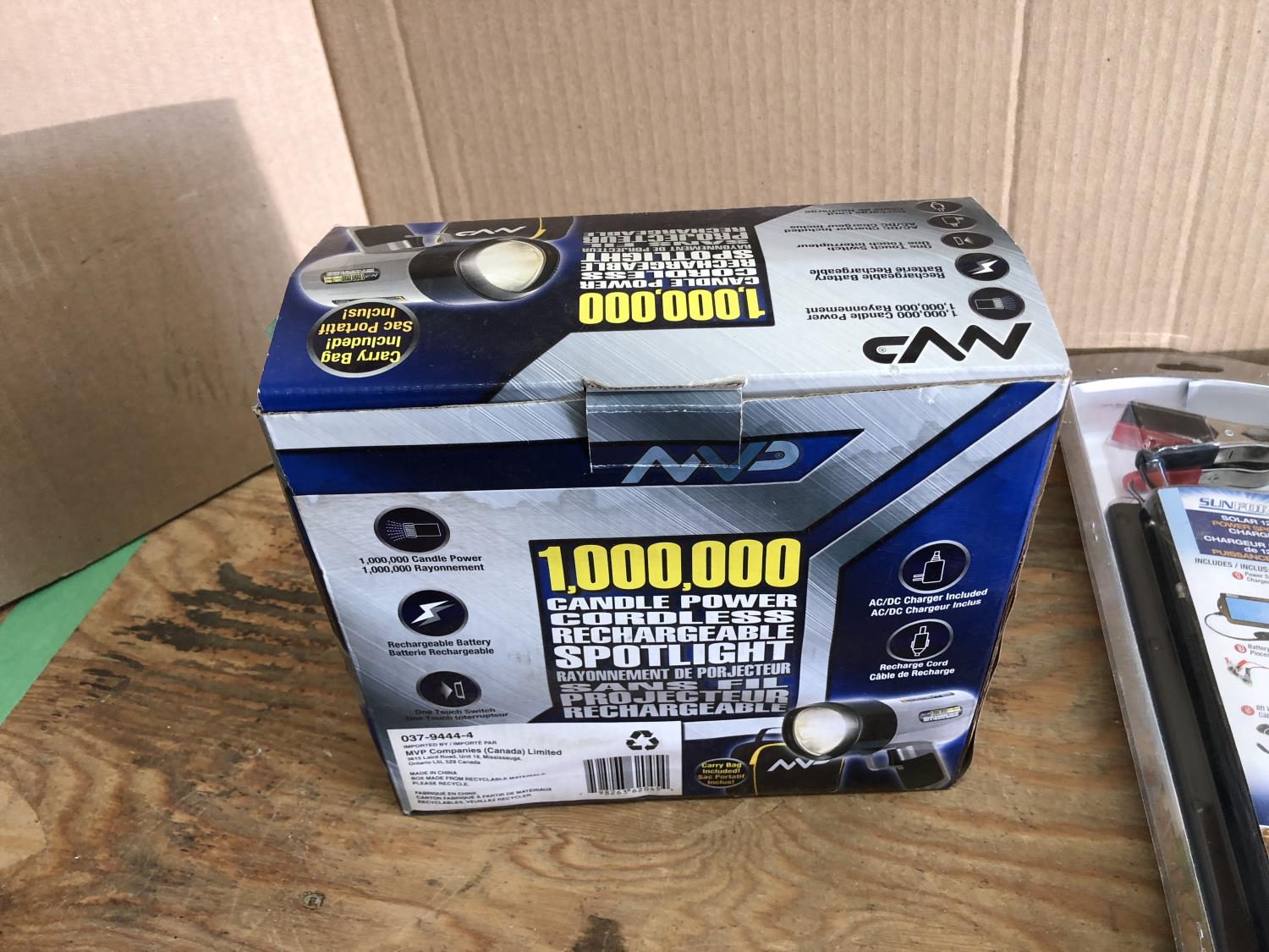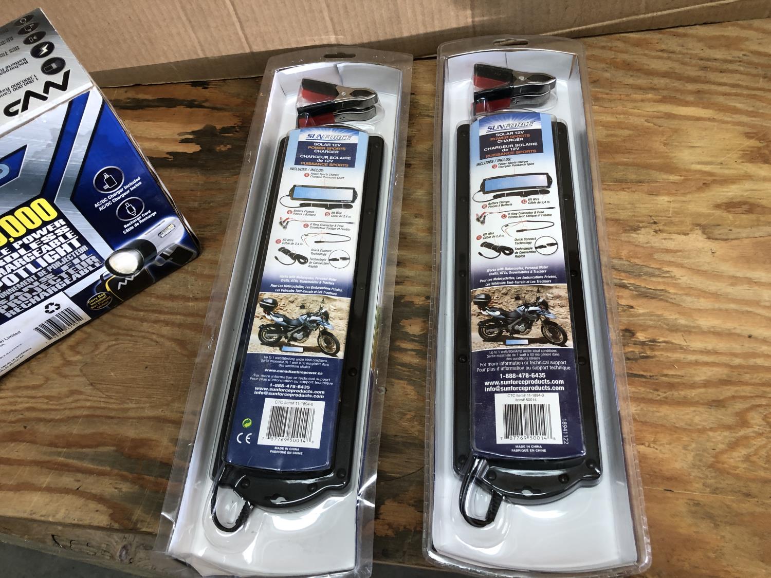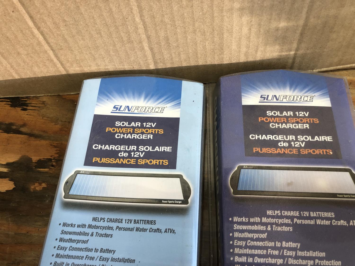 (2) Sun Force solar 12 v power sports chargers, 1,000,000 candle power rechargeable spotlight