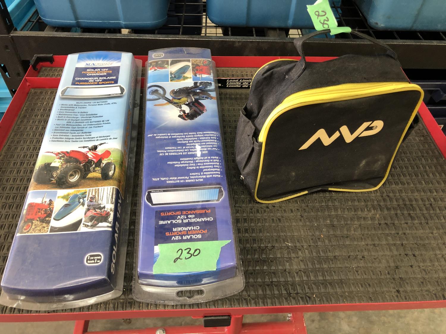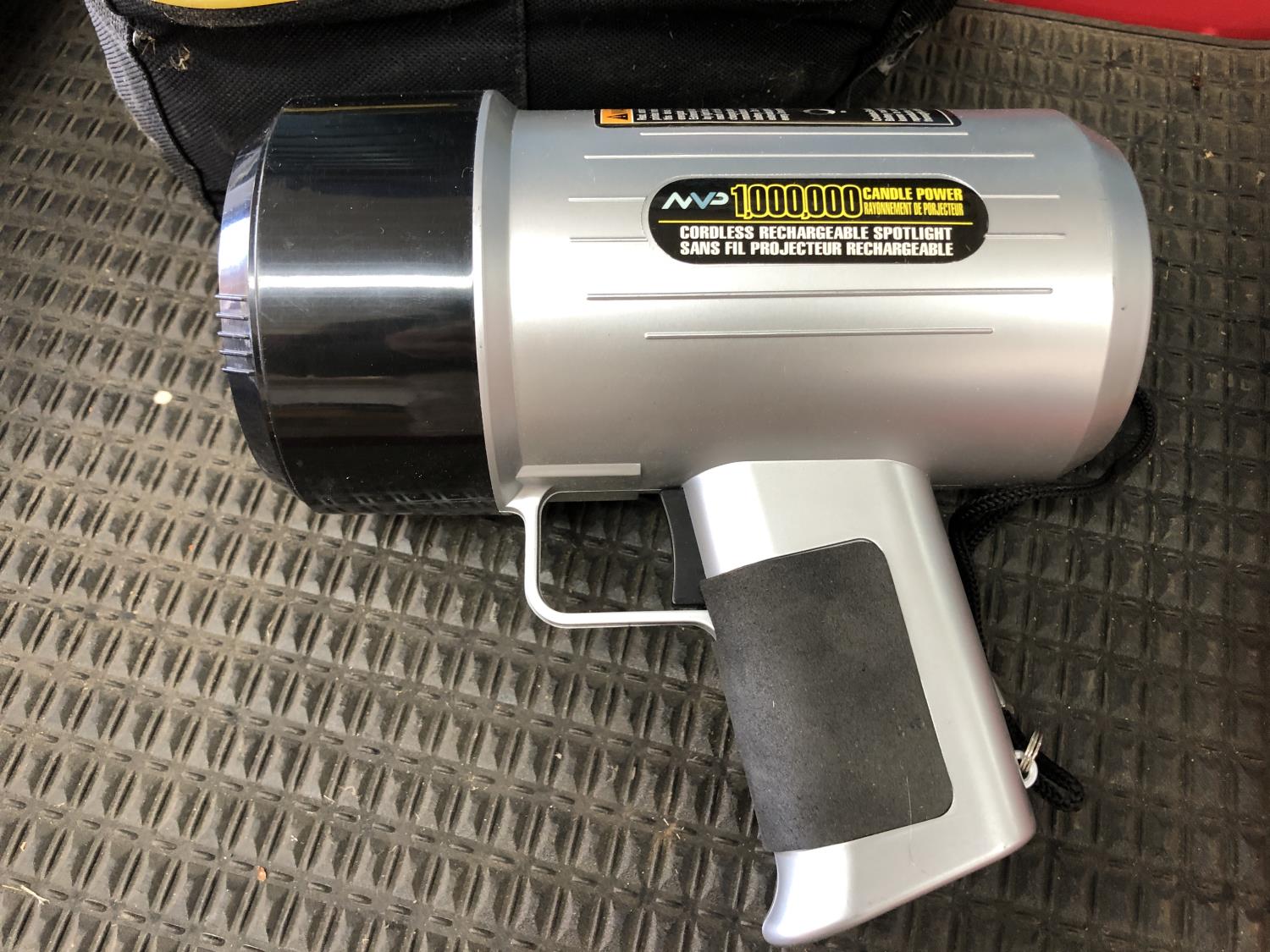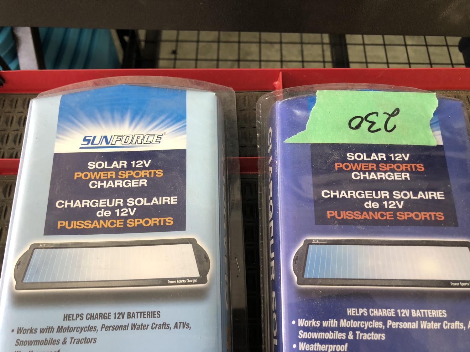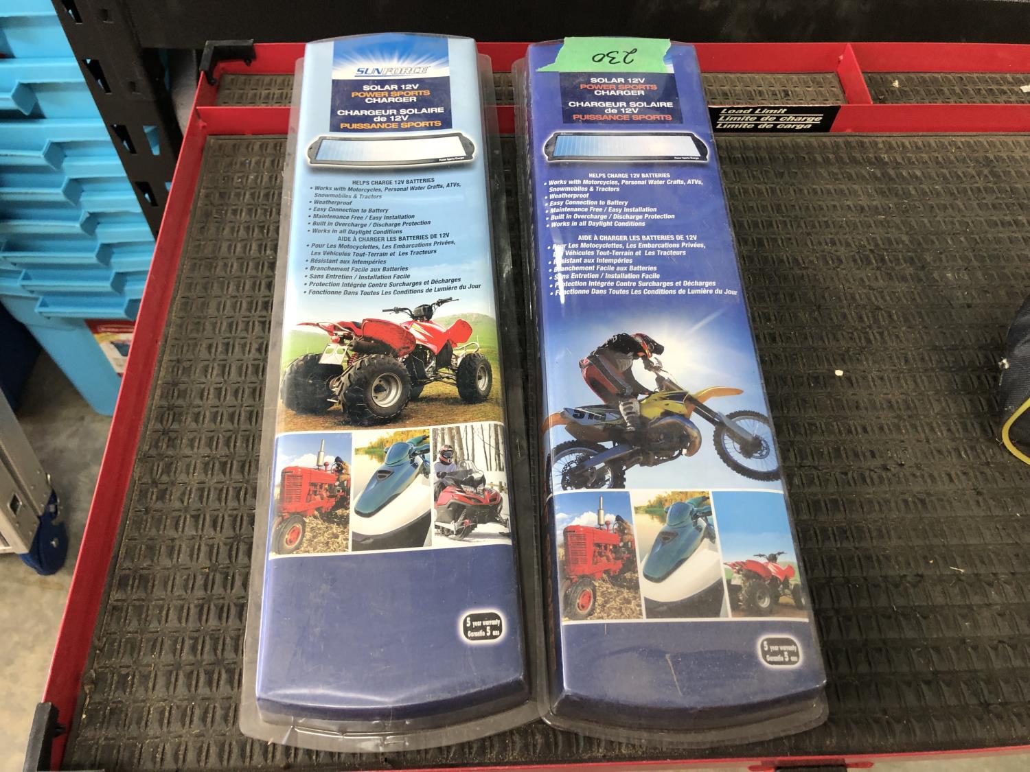 (2) Sun Force solar 12 v power sports chargers, 1,000,000 candle power rechargeable spotlight