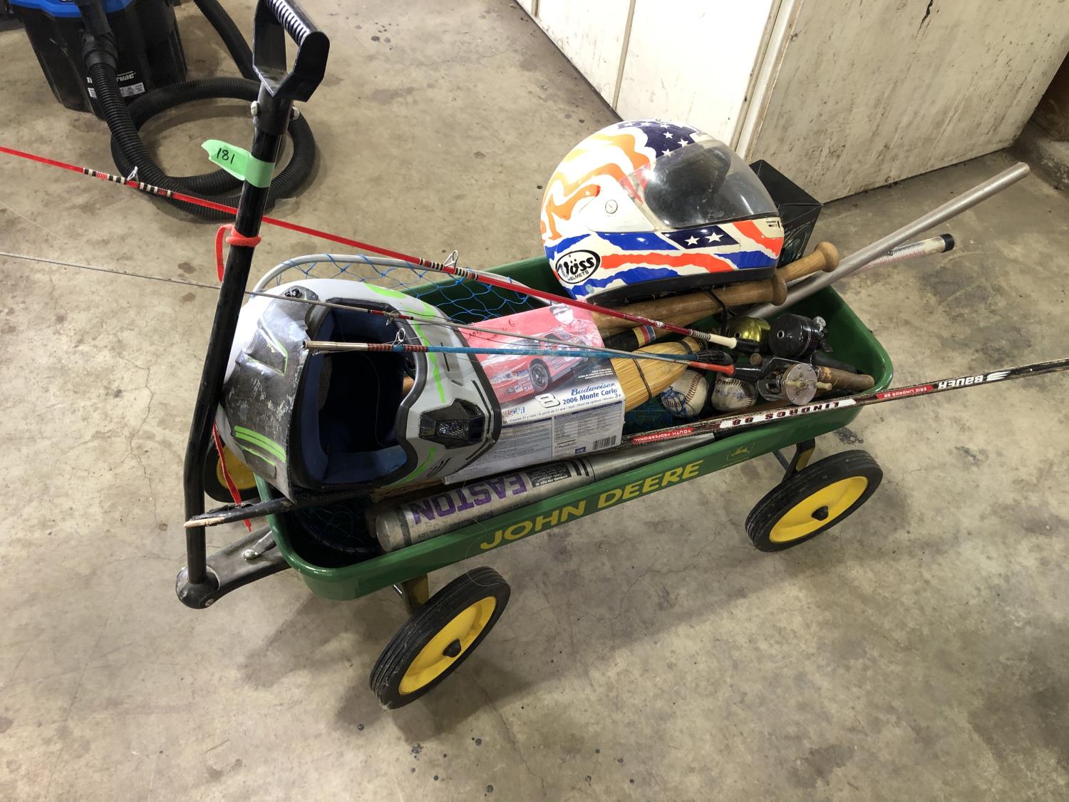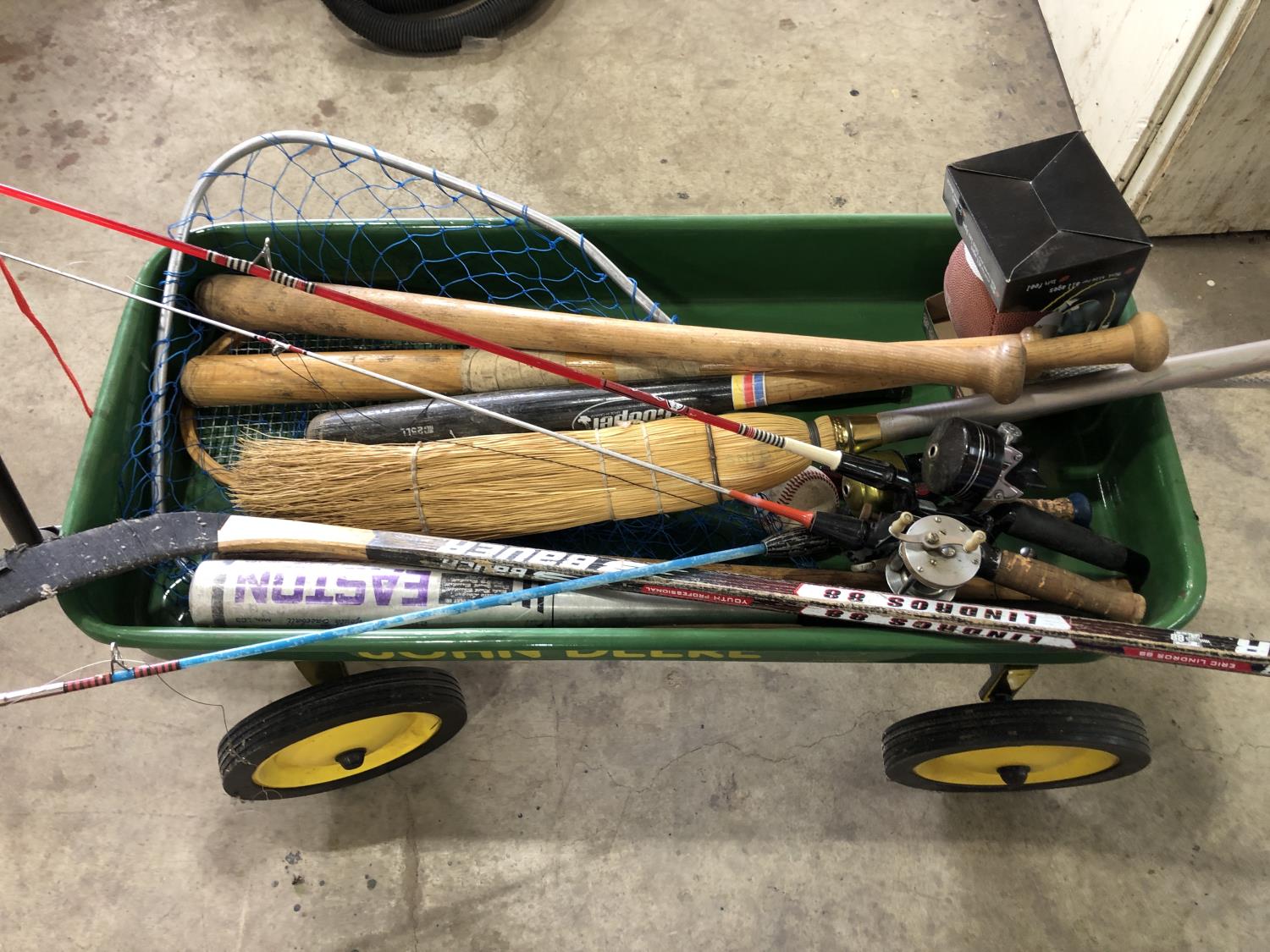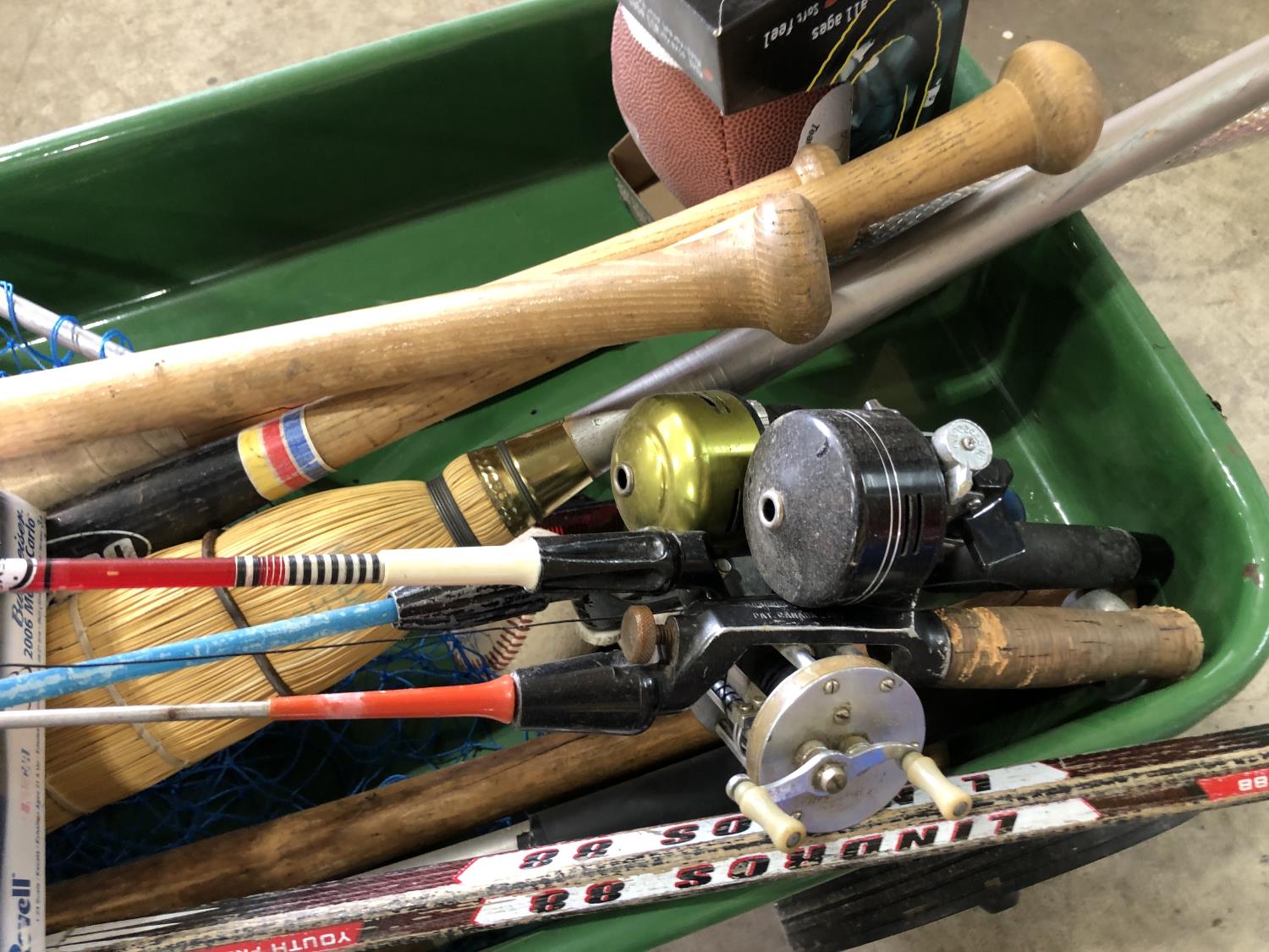 (6) baseball bats, hockey stick, broom, (2) bike helmets, mini football (unused), (2) baseballs, Revel Nascar model car (unused), fishing net & (3) rods, tennis racket